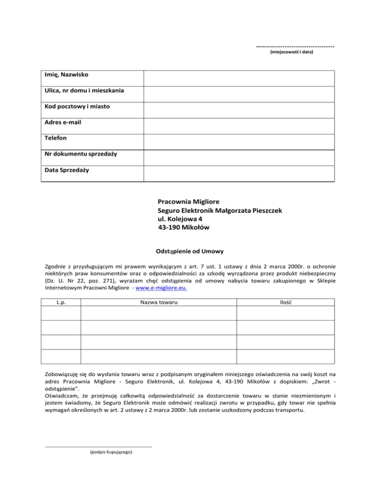 ……………............................. (miejscowość i data) Imię, Nazwisko Ulica, nr domu i mieszkania Kod pocztowy i miasto Adres e‐mail Telefon Nr dokumentu sprzedaży Data Sprzedaży Pracownia Migliore Seguro Elektronik Małgorzata Pieszczek ul. Kolejowa 4 43‐190 Mikołów Odstąpienie od Umowy Zgodnie z przysługującym mi prawem wynikającym z art. 7 ust. 1 ustawy z dnia 2 marca 2000r. o ochronie niektórych praw konsumentów oraz o odpowiedzialności za szkodę wyrządzona przez produkt niebezpieczny (Dz. U. Nr 22, poz. 271), wyrażam chęć odstąpienia od umowy nabycia towaru zakupionego w Sklepie Internetowym Pracowni Migliore ‐ www.e-migliore.eu. L.p. Nazwa towaru Ilość Zobowiązuję się do wysłania towaru wraz z podpisanym oryginałem niniejszego oświadczenia na swój koszt na adres Pracownia Migliore - Seguro Elektronik, ul. Kolejowa 4, 43‐190 Mikołów z dopiskiem: „Zwrot ‐ odstąpienie”. Oświadczam, że przejmuję całkowitą odpowiedzialność za dostarczenie towaru w stanie niezmienionym i jestem świadomy, że Seguro Elektronik może odmówić realizacji zwrotu w przypadku, gdy towar nie spełnia wymagań określonych w art. 2 ustawy z 2 marca 2000r. lub zostanie uszkodzony podczas transportu. ………………………………………………………………. (podpis Kupującego)