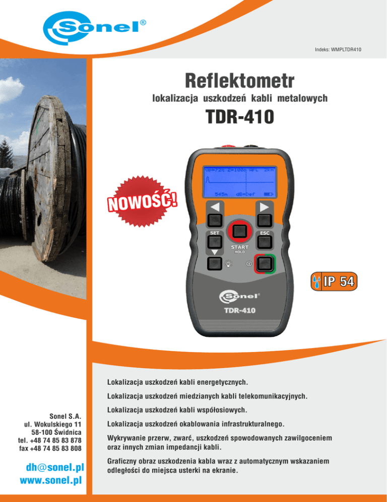 Indeks: WMPLTDR410 Reflektometr lokalizacja uszkodzeń kabli metalowych TDR-410 NOWOŚĆ! IP 54 Lokalizacja uszkodzeń kabli energetycznych. Lokalizacja uszkodzeń miedzianych kabli telekomunikacyjnych. Sonel S.A. ul. Wokulskiego 11 58-100 Świdnica tel. +48 74 85 83 878 fax +48 74 85 83 808 [email protected] www.sonel.pl Lokalizacja uszkodzeń kabli współosiowych. Lokalizacja uszkodzeń okablowania infrastrukturalnego. Wykrywanie przerw, zwarć, uszkodzeń spowodowanych zawilgoceniem oraz innych zmian impedancji kabli. Graficzny obraz uszkodzenia kabla wraz z automatycznym wskazaniem odległości do miejsca usterki na ekranie. Cechy charakterystyczne: Zwarcie ! automatyczny lub manualny tryb pracy: - funkcja automatycznej lokalizacji uszkodzenia (AFL), - tryb pracy z ręcznym wyborem zakresu i czułości, - pojedynczy pomiar wyzwalany ręcznie lub skanowanie ciągłym, Obwód otwarty ! 11 dostępnych zakresów pomiarowych od 7 m do 4000 m wybieranych w trybie manualnym lub dobieranych automatycznie, ! maksymalna długość wykonywanego pomiaru: do 4000 m z jednego końca kabla, ! „strefa martwa” pomiaru ograniczona do 0,5 m, Niepełna przerwa ! wyświetlacz LCD 2,5” z podświetleniem, ! Skanowanie automatyczne lub wyzwalanie ręczne pomiaru, ! czułość ustawiana ręcznie lub dopasowana automatycznie, ! regulacja dopasowania impedancyjnego, Złącze (mufa) ! regulacja współczynnika propagacji od 1% do 99%, ! szczelna i wytrzymała mechanicznie obudowa. ! niewielkie wymiary i waga. Naciągnięta żyła Odgałęzienie DANE TECHNICZNE Zakresy pomiarowe Wybór zakresu Rozdzielczość Dokładność pomiaru Czułość 7, 15, 30, 60, 120, 250, 500 m, 1, 2, 3, 4 km manualny lub automatyczny ok. 1% wybranego zakresu 1% zakresu min. 3 pikseli na odbiciu od uszkodzenia w odległości 4 km na kablu miedzianym 0,6mm Współczynnik propagacji 1% … 99% lub 2,5 … 148,5 m/μs Impuls wyjściowy 5 Vp-p (obwód otwarty) Impedancja wyjścia regulowana - 25, 50, 75 i 100Ω Szer. impulsu wyjścia 3 ns … 3 μs (automatyczna przy wyborze zakresu) Tryb skanowania pomiar pojedynczy lub ciągły (2 pomiary na sekundę) Generator sygnału akustycznego 810 ... 1110 Hz Zasilanie 4 x baterie alkaliczne 1,5V typu AA lub 4 x akumulatory NiMH AA Czas pracy z kompletu baterii 30 godz. skanowania ciągłego Auto-wyłącznik po 1, 2, 3, 5 min. lub nieaktywny Wyświetlacz LCD 64 x 128 pikseli z podświetleniem Temperatura robocza -10 °C … +50 °C Temperatura przechowywania -20 °C … +70 °C Wymiary 165 x 90 x 37mm Waga 350 g Zabezpieczenie prądowe 250 V AC Normy bezpieczeństwa IEC61010-1; EN 60950, EMC BS/EN 61326-1 Obudowa IP54 Zawilgocony odcinek Mokre złącze Splitter Zamiana żył w parach Wyposażenie standardowe zestawu: Wyposażenie dodatkowe: -Przewód 60 cm podwójny zakończony wtykami bananowymi WAPRZ0X6DZBB -Krokodylek czerwony WAKRORE20K02 WAKROBL20K01 -Krokodylek czarny WAFUTM2 -Futerał z paskiem -Baterie alkaliczne 1,5V typu AA – 4 szt. - Separator napięcia AS-2 Zawartość niniejszego folderu nie stanowi oferty w rozumieniu prawa i jest publikowany dla celów informacyjnych bez odpowiedzialności prawnej. WAADAAS2 v.1