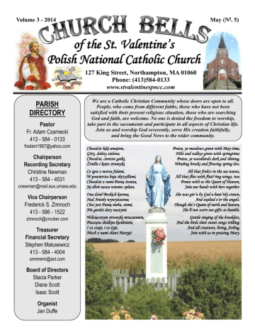 May (No. 5) Volume 3 - 2014 of the St. Valentine’s Polish National Catholic Church 127 King Street, Northampton, MA 01060 Phone: (413)584-0133 www.stvalentinespncc.com PARISH DIRECTORY Pastor Fr. Adam Czarnecki 413 - 584 - 0133 [email protected] Chairperson Recording Secretary Christine Newman 413 - 584 - 4531 [email protected] Vice Chairperson Frederick S. Zimnoch 413 - 586 - 1522 [email protected] Treasurer Financial Secretary Stephen Matusewicz 413 - 584 - 4004 [email protected] Board of Directors Stacia Parker Diane Scott Isaac Scott Organist Jan Duffe We are a Catholic Christian Community whose doors are open to all. People, who come from different faiths, those who have not been satisfied with their present religious situation, those who are searching God and faith, are welcome. No one is denied the freedom to worship, take part in the sacraments and participate in all aspects of Christian life. Join us and worship God reverently, serve His creation faithfully, and bring the Good News to the wider community. Chwalcie łąki umajone, Góry, doliny zielone; Chwalcie, cieniste gaiki, Źródła i kręte strumyki. Co igra z morza falami, W powietrzu buja skrzydłami, Chwalcie z nami Panią świata, Jej dłoń nasza wieniec splata. Ona dzieł Boskich korona, Nad Anioły wywyższona; Choć jest Panią nieba, ziemi, Nie gardzi dary naszymi. Wdzięcznym strumyki mruczeniem, Ptaszęta słodkim kwileniem, I co czuje, i co żyje, Niech z nami sławi Maryję! Praise, ye meadows green with May-time, Hills and valleys green with springtime; Praise, ye woodlands dark and shining, Winding brooks and flowing spring-lets. All that frolics in the sea waves, All that flies with flutt’ring wings, too; Praise with us the Queen of Heaven, Join our hands with hers together. She was giv’n by God a heav’nly crown, And exalted o’er the angels. Though she’s Queen of earth and heaven, She’ll not scorn our gifts so humble. Gentle singing of the brooklets, And the birds their sweet songs trilling; And all creatures, living, feeling, Join with us in praising Mary. May Magnificat MAY is Mary’s month, and I Muse at that and wonder why: Her feasts follow reason, Dated due to season — Candlemas, Lady Day; But the Lady Month, May, Why fasten that upon her, With a feasting in her honour? Is it only its being brighter Than the most are must delight her? Is it opportunest And flowers finds soonest? Ask of her, the mighty mother: Her reply puts this other Question: What is Spring? — Growth in every thing — Flesh and fleece, fur and feather, Grass and greenworld all together; Star-eyed strawberry-breasted Throstle above her nested Cluster of bugle blue eggs thin Forms and warms the life within; And bird and blossom swell In sod or sheath or shell. All things rising, all things sizing Mary sees, sympathising With that world of good, Nature’s motherhood. Their magnifying of each its kind With delight calls to mind How she did in her stored Magnify the Lord. Well but there was more than this: Spring’s universal bliss Much, had much to say To offering Mary May. When drop-of-blood-and-foam-dapple Bloom lights the orchard-apple And thicket and thorp are merry With silver-surfèd cherry And azuring-over greybell makes Wood banks and brakes wash wet like lakes And magic cuckoocall Caps, clears, and clinches all — This ecstasy all through mothering earth Tells Mary her mirth till Christ’s birth To remember and exultation In God who was her salvation. Fr. Gerard Manley Hopkins The Ascension of the Lord is also our Ascension with the Lord Throughout most of the Catholic Church we celebrate the Ascension of the Lord on Thursday. In some places, the Feast is transferred to Sunday. Sadly, the Feast seems to have lost its meaning in the experience of too many Catholics and other Christians. Does the Ascension affect our lives in the here and now? Is it a commemoration of an event which occurred 2000 years ago? Or, could it be the key that helps unlock the very meaning of our lives and the plan of God for the entire created order? The great western Bishop Augustine proclaimed these words on the Feast: "Today our Lord Jesus Christ ascended into heaven; let our hearts ascend with him. Listen to the words of the Apostle: If you have risen with Christ, set your hearts on the things that are above where Christ is, seated at the right hand of God; seek the things that are above, not the things that are on earth. For just as he remained with us even after his ascension, so we too are already in heaven with him, even though what is promised us has not yet been fulfilled in our bodies." When we went down into the Font of Baptism we were incorporated into Jesus Christ, made members of His Body, the Church. Therefore, as Augustine also wrote, "Where the Head is, there is the Body, where I am, there is my Church, we too are one; the Church is in me and I in her and we two are your Beloved and your Lover." In other words, we have ascended with the Lord! He is the Head and we are members of His Body. We cannot be separated. Augustine, reflecting the clear teaching of the early Church Fathers reminds us that the Head and the Body are the "One Christ." So, this is our Feast as well! St Leo the Great reflected on the joy the disciples experienced on that glorious day in these words: "That blessed company had a great and inexpressible cause for joy when it saw man's nature rising above the dignity of the whole heavenly creation, above the ranks of angels, above the exalted status of archangels. Now would there be any limit to its upward course until humanity was admitted to a seat at the right hand of the eternal father, to be enthroned at last in the glory of him to whose nature it was wedded in the Person of the Son." Both of these Saints remind us why we should rejoice on this Feast of the Ascension. The Ascension does not mark the end of Jesus' relationship with the Church but the beginning of a new way of His relating to t