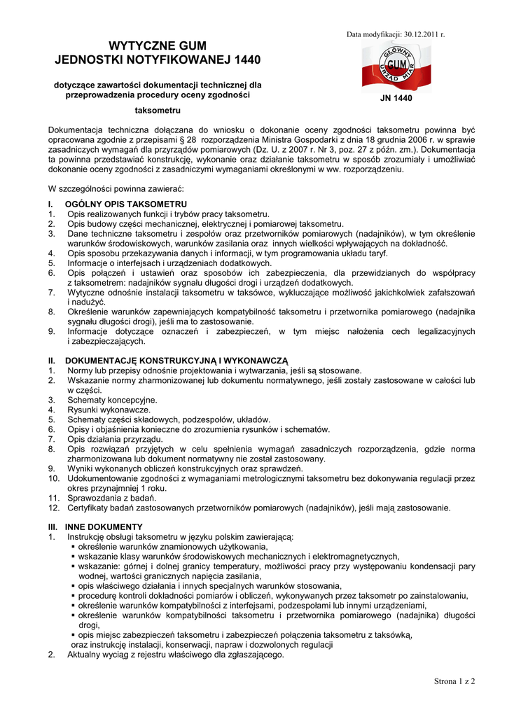 Data modyfikacji: 30.12.2011 r. WYTYCZNE GUM JEDNOSTKI NOTYFIKOWANEJ 1440 dotyczące zawartości dokumentacji technicznej dla przeprowadzenia procedury oceny zgodności JN 1440 taksometru Dokumentacja techniczna dołączana do wniosku o dokonanie oceny zgodności taksometru powinna być opracowana zgodnie z przepisami § 28 rozporządzenia Ministra Gospodarki z dnia 18 grudnia 2006 r. w sprawie zasadniczych wymagań dla przyrządów pomiarowych (Dz. U. z 2007 r. Nr 3, poz. 27 z późn. zm.). Dokumentacja ta powinna przedstawiać konstrukcję, wykonanie oraz działanie taksometru w sposób zrozumiały i umożliwiać dokonanie oceny zgodności z zasadniczymi wymaganiami określonymi w ww. rozporządzeniu. W szczególności powinna zawierać: I. 1. 2. 3. 4. 5. 6. 7. 8. 9. OGÓLNY OPIS TAKSOMETRU Opis realizowanych funkcji i trybów pracy taksometru. Opis budowy części mechanicznej, elektrycznej i pomiarowej taksometru. Dane techniczne taksometru i zespołów oraz przetworników pomiarowych (nadajników), w tym określenie warunków środowiskowych, warunków zasilania oraz innych wielkości wpływających na dokładność. Opis sposobu przekazywania danych i informacji, w tym programowania układu taryf. Informacje o interfejsach i urządzeniach dodatkowych. Opis połączeń i ustawień oraz sposobów ich zabezpieczenia, dla przewidzianych do współpracy z taksometrem: nadajników sygnału długości drogi i urządzeń dodatkowych. Wytyczne odnośnie instalacji taksometru w taksówce, wykluczające możliwość jakichkolwiek zafałszowań i nadużyć. Określenie warunków zapewniających kompatybilność taksometru i przetwornika pomiarowego (nadajnika sygnału długości drogi), jeśli ma to zastosowanie. Informacje dotyczące oznaczeń i zabezpieczeń, w tym miejsc nałożenia cech legalizacyjnych i zabezpieczających. II. 1. 2. DOKUMENTACJĘ KONSTRUKCYJNĄ I WYKONAWCZĄ Normy lub przepisy odnośnie projektowania i wytwarzania, jeśli są stosowane. Wskazanie normy zharmonizowanej lub dokumentu normatywnego, jeśli zostały zastosowane w całości lub w części. 3. Schematy koncepcyjne. 4. Rysunki wykonawcze. 5. Schematy części składowych, podzespołów, układów. 6. Opisy i objaśnienia konieczne do zrozumienia rysunków i schematów. 7. Opis działania przyrządu. 8. Opis rozwiązań przyjętych w celu spełnienia wymagań zasadniczych rozporządzenia, gdzie norma zharmonizowana lub dokument normatywny nie został zastosowany. 9. Wyniki wykonanych obliczeń konstrukcyjnych oraz sprawdzeń. 10. Udokumentowanie zgodności z wymaganiami metrologicznymi taksometru bez dokonywania regulacji przez okres przynajmniej 1 roku. 11. Sprawozdania z badań. 12. Certyfikaty badań zastosowanych przetworników pomiarowych (nadajników), jeśli mają zastosowanie. III. INNE DOKUMENTY 1. Instrukcję obsługi taksometru w języku polskim zawierającą: określenie warunków znamionowych użytkowania, wskazanie klasy warunków środowiskowych mechanicznych i elektromagnetycznych, wskazanie: górnej i dolnej granicy temperatury, możliwości pracy przy występowaniu kondensacji pary wodnej, wartości granicznych napięcia zasilania, opis właściwego działania i innych specjalnych warunków stosowania, procedurę kontroli dokładności pomiarów i obliczeń, wykonywanych przez taksometr po zainstalowaniu, określenie warunków kompatybilności z interfejsami, podzespołami lub innymi urządzeniami, określenie warunków kompatybilności taksometru i przetwornika pomiarowego (nadajnika) długości drogi, opis miejsc zabezpieczeń taksometru i zabezpieczeń połączenia taksometru z taksówką, oraz instrukcję instalacji, konserwacji, napraw i dozwolonych regulacji 2. Aktualny wyciąg z rejestru właściwego dla zgłaszającego. Strona 1 z 2 Data modyfikacji: 30.12.2011 r. 3. Dokumenty potwierdzające ustanowienie zgłaszającego jako upoważnionego przedstawiciela producenta urządzenia wraz z zakresem uprawnień (dokumenty należy załączyć, jeśli zgłaszającym jest upoważniony przedstawiciel). IV. DOKUMENTACJĘ OPROGRAMOWANIA W przypadku taksometru z oprogramowaniem, należy dostarczyć dokumentację tego oprogramowania opracowaną według „Wytycznych Jednostki Notyfikowanej nr 1440 dotyczących zawartości dokumentacji opisującej bezpieczeństwo oprogramowania przyrządu pomiarowego zgłoszonego do badań typu WE wg. Dyrektywy 2004/22/WE (MID)” W przypadku wstępnego stwierdzenia, iż jeden lub kilka aspektów bezpieczeństwa oprogramowania przyrządu lub danych nie zostało przez zgłaszającego przyrząd do badań uwzględnione w opisie, Biuro Metrologii Prawnej GUM wystąpi pisemnie do zgłaszającego o uzupełnienie dokumentacji oprogramowania o opis określonych aspektów bezpieczeństwa oprogramowania i danych, warunkujący rozpoczęcie technicznych badań przyrządu. W przypadku wstępnego stwierdzenia braku części dokumentacji technicznej, wymaganej przez niniejsze Wytyczne Jednostki Notyfikowanej nr 1440, Biuro Metrologii Prawnej GUM wystąpi pisemnie do zgłaszającego o uzupełnienie dokumentacji technicznej, której skompletowanie jest warunkiem rozpoczęcia procedury badania typu WE. Strona 2 z 2