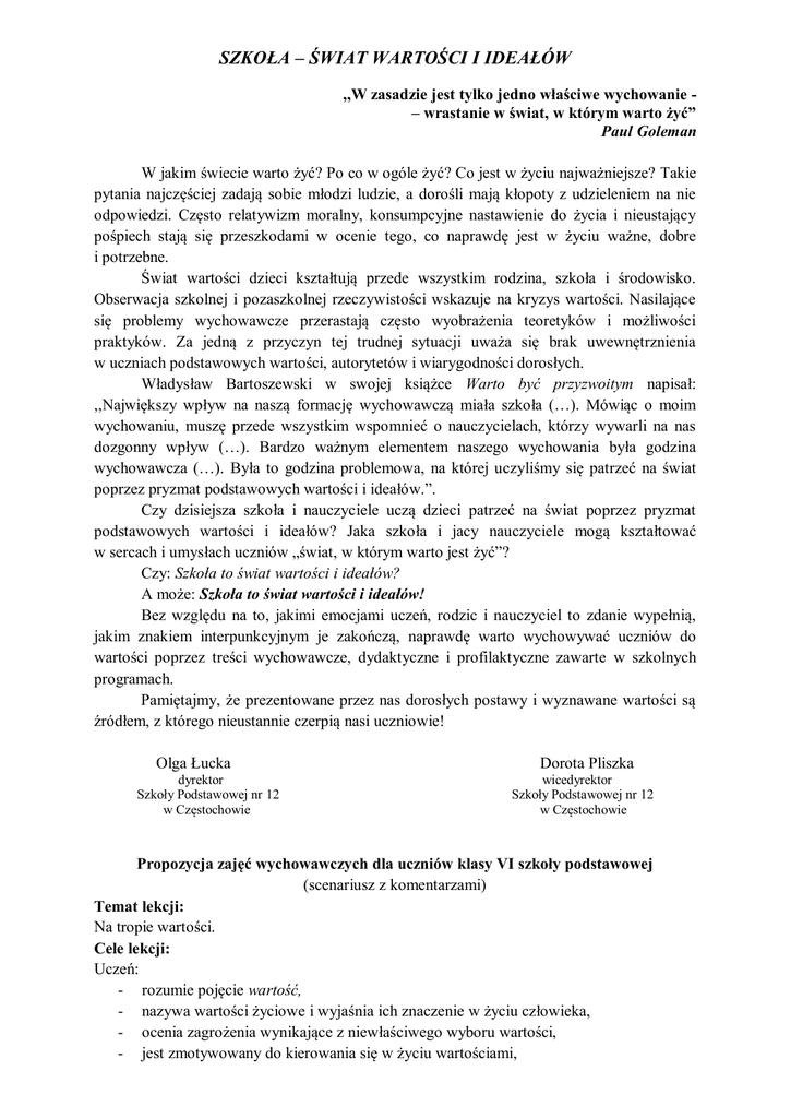 SZKOŁA – ŚWIAT WARTOŚCI I IDEAŁÓW ,,W zasadzie jest tylko jedno właściwe wychowanie – wrastanie w świat, w którym warto żyć” Paul Goleman W jakim świecie warto żyć? Po co w ogóle żyć? Co jest w życiu najważniejsze? Takie pytania najczęściej zadają sobie młodzi ludzie, a dorośli mają kłopoty z udzieleniem na nie odpowiedzi. Często relatywizm moralny, konsumpcyjne nastawienie do życia i nieustający pośpiech stają się przeszkodami w ocenie tego, co naprawdę jest w życiu ważne, dobre i potrzebne. Świat wartości dzieci kształtują przede wszystkim rodzina, szkoła i środowisko. Obserwacja szkolnej i pozaszkolnej rzeczywistości wskazuje na kryzys wartości. Nasilające się problemy wychowawcze przerastają często wyobrażenia teoretyków i możliwości praktyków. Za jedną z przyczyn tej trudnej sytuacji uważa się brak uwewnętrznienia w uczniach podstawowych wartości, autorytetów i wiarygodności dorosłych. Władysław Bartoszewski w swojej książce Warto być przyzwoitym napisał: ,,Największy wpływ na naszą formację wychowawczą miała szkoła (…). Mówiąc o moim wychowaniu, muszę przede wszystkim wspomnieć o nauczycielach, którzy wywarli na nas dozgonny wpływ (…). Bardzo ważnym elementem naszego wychowania była godzina wychowawcza (…). Była to godzina problemowa, na której uczyliśmy się patrzeć na świat poprzez pryzmat podstawowych wartości i ideałów.”. Czy dzisiejsza szkoła i nauczyciele uczą dzieci patrzeć na świat poprzez pryzmat podstawowych wartości i ideałów? Jaka szkoła i jacy nauczyciele mogą kształtować w sercach i umysłach uczniów „świat, w którym warto jest żyć”? Czy: Szkoła to świat wartości i ideałów? A może: Szkoła to świat wartości i ideałów! Bez względu na to, jakimi emocjami uczeń, rodzic i nauczyciel to zdanie wypełnią, jakim znakiem interpunkcyjnym je zakończą, naprawdę warto wychowywać uczniów do wartości poprzez treści wychowawcze, dydaktyczne i profilaktyczne zawarte w szkolnych programach. Pamiętajmy, że prezentowane przez nas dorosłych postawy i wyznawane wartości są źródłem, z którego nieustannie czerpią nasi uczniowie! Olga Łucka dyrektor Szkoły Podstawowej nr 12 w Częstochowie Dorota Pliszka wicedyrektor Szkoły Podstawowej nr 12 w Częstochowie Propozycja zajęć wychowawczych dla uczniów klasy VI szkoły podstawowej (scenariusz z komentarzami) Temat lekcji: Na tropie wartości. Cele lekcji: Uczeń: - rozumie pojęcie wartość, - nazywa wartości życiowe i wyjaśnia ich znaczenie w życiu człowieka, - ocenia zagrożenia wynikające z niewłaściwego wyboru wartości, - jest zmotywowany do kierowania się w życiu wartościami, - aktywnie współpracuje w grupie. Metody i techniki pracy: partner do rozmowy, ćwiczenia dramowe, dyskusja, runda bez przymusu, burza mózgów, lista atrybutów, technika zdań podsumowujących, głosowanie Formy pracy: indywidualna, grupowa, zespołowa Pomoce dydaktyczne: słowniki języka polskiego, schematy, kartki, markery, tablica, kreda Czas zajęć: 90 minut Przebieg lekcji (z pominięciem czynności organizacyjnych): 1. Nawiązanie do tematu, postawienie pytania kluczowego. Komentarz nauczyciela: „Chcę wam dzisiaj zaproponować udział w zajęciach na temat „Na tropie wartości”, które, mam nadzieję, pobudzą w was ciekawość i radość uczenia się, dzięki czemu zdobędziecie nowe doświadczenia. Liczę na to, że pomogą wam one w poszukiwaniu wartości przydatnych w życiu, w pokonaniu tej bardzo trudnej drogi, którą jednak warto przejść. Na koniec zajęć spróbujemy odpowiedzieć na pytanie zapisane na tablicy: Co by było, gdyby wszyscy ludzie kierowali się w życiu wartościami?” 2. Ćwiczenia zabawowo-relaksujące. Komentarz nauczyciela: „Bardzo chciałabym, żebyśmy dzisiaj szczególnie otwarcie porozumiewali się ze sobą, dlatego zajęcia rozpoczniemy od ćwiczeń, które pomogą wam zrzucić z siebie negatywne emocje, odprężą was i zrelaksują. Proszę, byście używali swojej wyobraźni, wykorzystywali emocje, uznawali, że wszystkie pomysły są dobre. Może zdarzyć się, że ktoś nie będzie chciał brać udziału w ćwiczeniu. Każdy z was ma prawo wycofać się z jednej gry i przyglądać się.” Propozycje ćwiczeń: Lodołamacze Rozdajemy uczniom kartki z pytaniami. Po kilku minutach zaczynamy prezentację odpowiedzi wg metody nazwanej rundą bez przymusu (zwrócenie się do każdego ucznia po kolei z prośbą o zabranie głosu lub powiedzenie: „Pasuję"). Pytania do wyboru: Jak masz na imię i czy Twoje imię Ci się podoba? Jaki kolor lubisz najbardziej, dlaczego? Gdybyś był książką, jaki nosiłbyś tytuł? Najbardziej oryginalny błąd, bzdura jaka Ci się w życiu przytrafiła? Gdybyś był Kubusiem Puchatkiem, jaką przygodę byś dziś przeżywał? Twoje ulubione utwory muzyczne/filmy? Gdybyś miał smak, to jaki? Twoje 3 życzenia do złotej rybki? Dokończ poniższe zdania: o Zawsze chciałem... o Lubię... o Umiem.. o W szkole moi nauczyciele... o Życie to dla mnie... Przewracanie ściany Uczniowie podchodzą do ścian, tak aby każdy miał wystarczającą ilość miejsca. Usiłują „przewrócić ścianę”, pchając ją z całej siły różnymi sposobami. Dzięki wydatkowaniu dużej ilości energii, dzieci pozbywają się napięcia. Chodzenie po liściach Uczniowie stają w luźnym układzie. Nauczyciel podaje hasło: „Jesteśmy w parku późną jesienią, wszystkie liście pospadały na alejki. Sięgają nam aż do kolan, a my brodzimy w nich, spacerując”. Wstęp do zabawy może być inny, np. „Marsz w zaspie śnieżnej”, „Roztopy wiosenne”, „Skakanie po kamykach w górskim strumieniu”. 3. Właściwa realizacja tematu. Partner do rozmowy - uczniowie zastanawiają się w parach, co dla nich znaczy słowo wartość. Po upływie dwóch minut wprowadzamy ponownie rundę bez przymusu. Rozmowa w parach to metod