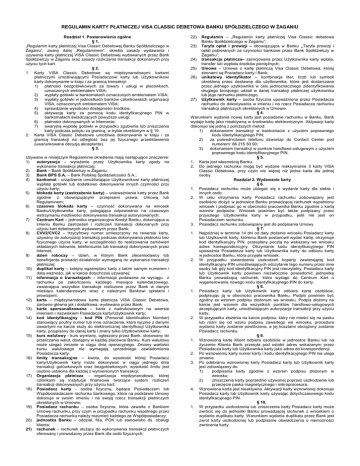 REGULAMIN KARTY PŁATNICZEJ VISA CLASSIC DEBETOWA BANKU SPÓŁDZIELCZEGO W ŻAGANIU Rozdział 1. Postanowienia ogólne § 1. „Regulamin karty płatniczej Visa Classic Debetowej Banku Spółdzielczego w Żaganiu”, zwany dalej „Regulaminem”, określa zasady wydawania i używania karty płatniczej VISA Classic Debetowej wydawanych przez Bank Spółdzielczy w Żaganiu oraz zasady rozliczania transakcji dokonanych przy użyciu tych kart. § 2. 1. Karty VISA Classic Debetowe są międzynarodowymi kartami płatniczymi umożliwiającymi Posiadaczowi karty lub Użytkownikowi karty dokonywanie w kraju i za granicą transakcji: 1) płatności bezgotówkowych za towary i usługi w placówkach, oznaczonych emblematem VISA; 2) wypłaty gotówki w bankomatach oznaczonych emblematem VISA; 3) wypłaty gotówki w jednostkach banków członkowskich organizacji VISA, oznaczonych emblematem VISA; 4) sprawdzanie wysokości dostępności środków; 5) aktywację karty za pomocą kodu identyfikacyjnego PIN w bankomatach świadczących powyższe usługi; 6) płatności dokonywanych w Internecie; 7) awaryjną wypłatę gotówki w przypadku zgubienia lub zniszczenia karty podczas pobytu za granicą, w trybie określonym w § 19. 2. Karta VISA Classic Debetowa umożliwia dokonywanie w kraju i za granicą transakcji na odległość bez jej fizycznego przedstawienia (uwarunkowane decyzją akceptanta). § 3. Używane w niniejszym Regulaminie określenia mają następujące znaczenie: 1) autoryzacja – wyrażenie przez Użytkownika karty zgody na wykonanie transakcji płatniczej; 2) Bank – Bank Spółdzielczy w Żaganiu; 3) Bank BPS S.A. – Bank Polskiej Spółdzielczości S.A.; 4) bankomat - urządzenie umożliwiające Użytkownikowi karty płatniczej wypłatę gotówki lub dodatkowo dokonywanie innych czynności przy użyciu karty; 5) blokada karty (zastrzeżenie karty) – unieważnienie karty przez Bank zgodnie z obowiązującymi przepisami prawa, Umową lub Regulaminem; 6) czasowa blokada karty – czynność dokonywana na wniosek Banku/Użytkownika karty, polegająca odpowiednio na czasowym wstrzymaniu możliwości dokonywania transakcji autoryzowanych; 7) Centrum Kart – jednostka organizacyjna Kredyt Banku, dokonująca w imieniu Banku zastrzeżeń i rozliczeń transakcji dokonanych przy użyciu kart debetowych wydawanych przez Bank; 8) CVV2/CVC2 – trzycyfrowy numer umieszczony na rewersie karty, używany do autoryzacji transakcji podczas dokonywania płatności bez fizycznego użycia karty, w szczególności do realizowania zamówień składanych listownie, telefonicznie lub transakcji dokonywanych przez Internet; 9) dzień roboczy – dzień, w którym Bank zleceniodawcy lub beneficjenta prowadzi działalność wymaganą do wykonania transakcji płatniczej; 10) duplikat karty – kolejny egzemplarz karty z takim samym numerem i datą ważności, jak w karcie dotychczas używanej; 11) informacja o transakcjach – informacja podawana na wyciągu z rachunku po zakończeniu każdego miesiąca kalendarzowego, zawierająca wszystkie transakcje rozliczone przez Bank w danym miesiącu kalendarzowym wraz z należnymi Bankowi opłatami i prowizjami; 12) karta – międzynarodowa karta płatnicza VISA Classic Debetowa, zarówno główna jak i dodatkowa, wydawana przez Bank; 13) karta spersonalizowana – karta z nadrukowanym na awersie imieniem i nazwiskiem Posiadacza karty/Użytkownik karty; 14) kod identyfikacyjny - kod PIN (Personal Identification Number) stanowiący poufny numer lub inne oznaczenie, które łącznie z danymi zawartymi na karcie służy do elektronicznej identyfikacji Użytkownika karty, przypisany do danej karty i znany tylko Użytkownikowi karty; 15) kurs walutowy - kurs wymiany, ogłaszany przez Bank, stosowany do przeliczania walut, dostępny w każdej placówce Banku. Kurs walutowy może ulegać zmianie w ciągu dnia operacyjnego. Zmiany wartości kursu walutowego nie wymagają uprzedniego zawiadomienia Posiadacza karty; 16) limity transakcyjne – kwota, do wysokość której Posiadacz karty/Użytkownik karty może dokonywać w ciągu jednego dnia transakcji gotówkowych oraz bezgotówkowych, wysokość limitu jest osobno ustalona dla każdej z wymienionych transakcji; 17) Organizacja płatnicza - organizacja międzynarodowa, której członkami są instytucje finansowe tworzące system rozliczeń transakcji dokonywanych przy użyciu kart; 18) Posiadacz karty - osoba fizyczna, będąca Posiadaczem lub Współposiadaczem rachunku bankowego, która na podstawie Umowy dokonuje w swoim imieniu i na swoją rzecz transakcji płatniczych określonych w Umowie; 19) Posiadacz rachunku – osoba fizyczna, która zawarła z Bankiem Umowę rachunku, przy czym w przypadku rachunku wspólnego przez Posiadacza rachunku należy rozumieć każdego ze Współposiadaczy; 20) jednostka Banku – oddział, filia, POK lub stanowisko ds. obsługi klienta; 21) rachunek – rachunek służący do wykonywania transakcji płatniczych oferowany i prowadzony przez Bank dla osób fizycznych; Regulamin – „Regulamin karty płatniczej Visa Classic debetowa Banku Spółdzielczego w Żaganiu”; 23) Taryfa opłat i prowizji – obowiązująca w Banku „Taryfa prowizji i opłat pobieranych za czynności bankowe przez Bank Spółdzielczy w Żaganiu”; 24) transakcja płatnicza– zainicjowana przez Użytkownika karty wpłata, transfer lub wypłata środków pieniężnych; 25) Umowa – Umowa o kartę płatniczą Visa Classic Debetowa, której stronami są Posiadacz karty i Bank; 26) unikatowy identyfikator – kombinacja liter, liczb lub symboli określoną przez dostawcę dla użytkownika, która jest dostarczana przez jednego użytkownika w celu jednoznacznego zidentyfikowania drugiego biorącego udział w danej transakcji płatniczej użytkownika lub jego rachunku płatniczego; 27) Użytkownik karty – osoba fizyczna upoważniona przez Posiadacza rachunku do dokonywania w imieniu i na rzecz Posiadacza rachu
