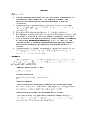 Regulamin 1. Ogólne warunki 1. Regulamin określa zasady korzystania z usług oraz zasady rezerwacji oferowane przez Lost Room Paweł Wilk, adres ul. Kremerowska 5, 31-130 Kraków, REGON 361727395, NIP 8672063152 oraz przedstawicieli wyznaczonych przez niego, zwanym dalej Organizatorem 2. Organizator oferuje usługi krótkotrwałego wynajmu pokoi w celu rozwiązywania gier logicznych (dalej: "Gra"). Szczegółowe zasady Gry są przekazywane uczestnikom przed rozpoczęciem Gry. 3. Każdy z uczestników zobowiązany jest zapoznać się z niniejszym regulaminem 4. Gra odbywa się w lokalu Organizatora Gry pod adresem 31-130 Kraków, ul. Kremerowska 5 lub w lokalu firmy Lost Group Sp. z o.o. 31-009 Kraków, ul. Szewska 20/3 (dalej: "Lokal") 5. Każdy z uczestników wyraża zgodę na przetwarzanie ich danych osobowych Organizatorowi zgodnie z ustawą o ochronie danych osobowych (Dz. U. 2015. poz. 2135 z późn. zm.). Organizator zastrzega, że dane te nie są przekazywane żadnym podmiotom trzecim, a są jedynie wykorzystywane do potwierdzenia rezerwacji i przesłania szczegółów Gry do uczestnika. 6. Organizator ma prawo w przypadku nieprzestrzegania regulaminu: a) zakończyć Grę przed czasem, b) wyprosić uczestników Gry z Lokalu. W obu przypadkach uczestnicy nie są uprawnieni do otrzymania zwrotu pieniędzy 2. Rezerwacja 1. Rezerwacja odbywa się za pośrednictwem stron internetowych: www.lostroom.pl lub www.lostbar.pl , e-mailowo: [email protected] lub [email protected] oraz telefonicznie pod numerem telefonów: 690022547 lub 792058762 2. Dokonanie rezerwacji odbywa się przez: a) wybranie pokoju Gry b) wybranie dnia i godziny c) podanie imienia i nazwiska, e-mail oraz telefonu d) akceptację regulaminu e) w przypadku formularza internetowego osoba rezerwująca otrzyma potwierdzenie rezerwacji na wskazany adres e-mail. W informacji tej będą zawarte wyszczególnione dane rezerwacyjne, tj.: pokój, data i godzina Gry, miejsce, sposób płatności. 3. Organizator Gry może zezwolić na uczestnictwo w Grze bez rezerwacji. 4. Anulowanie rezerwacji należy zgłosić mailowo lub telefonicznie (podane wyżej) na minimum jeden dzień przed planowaną Grą. Anulowanie rezerwacji jest skuteczne pod warunkiem potwierdzenia anulowanie przez Organizatora. 5. Osoba lub podmiot, którzy rezerwowali Grę nie odwołali jej, a nie przyszli do lokalu, czym narazili na straty Organizatora zobowiązani są do uregulowania płatności za rezerwację. 3. Zasady uczestnictwa w Grze 1. Uczestnicy zobowiązani są przybyć do Lokalu minimum 15 minut przed rozpoczęciem Gry w celu zapoznania się i zaakceptowania niniejszego Regulaminu oraz zasad Gry. 2. W przypadku spóźnienia się któregoś z uczestników, bez zwrotu kosztów, Organizator może skrócić Grę 3. Zabrania się uczestniczenia w Grze osobom, które znajdują się pod wpływem alkoholu lub jakichkolwiek środków odurzających 4. Uczestnicy Gry biorą udział w Grze na własną odpowiedzialność 5. W Grze nie powinny brać udział osoby, które cierpią na jakiekolwiek dolegliwości zdrowotne. 6. Uczestnicy ponoszą pełną odpowiedzialność za wszelkie zniszczenia dokonane na terenie Lokalu z ich winy. 7. Osoby poniżej 16 roku życia mogą uczestniczyć w Grze wyłącznie za zgodą minimum jednego pełnoletniego uczestnika tej samej Gry. 8. Uczestników obowiązuje całkowity zakaz palenia 4. Podstawowe zasady Gry 1. W zależności od Gry mogą brać udział grupy od 2 do 10 osób. 2. Czas gry to maksymalnie 60 minut 3. W czasie Gry zabronione jest korzystanie z wszelkich urządzeń rejestrujących dźwięk i obraz. 4. Organizator nie wyraża zgody na jakiekolwiek publikacje materiałów audio-video oraz obrazów z Lokalu bez jego uprzedniej zgody 5. Organizator korzysta podczas Gry z monitoringu wizyjnego w celu udzielania wskazówek uczestnikom Gry, co uczestnicy akceptują. Organizator zastrzega sobie wszelkie prawa do nagrań pochodzących z monitoringu. Nagrania te są dostepne wyłącznie Organizatorowi i zobowiązuje się on nie udostępniać ich osobom trzecim. 5. Zasady płatności 1. Ceny Gry ustalone zostały w cenniku na stronie internetowej i w Lokalu 2. Płatność za Grę odbywa się gotówką przed rozpoczęciem Gry lub przedpłatą przelewem na konto Organizatora 3. Ceny są cenami brutto