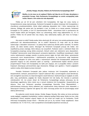 „Działaj. Reaguj. Decyduj. Wybory do Parlamentu Europejskiego 2014” Myślisz, że nie masz na nic wpływu? Mylisz się! Idąc do urn 25 maja, decydujesz o przyszłości Europy. Rola Parlamentu Europejskiego na arenie europejskiej stale rośnie. Razem z nim rośnie też rola obywateli. Polska już od 10 lat jest członkiem Unii Europejskiej. Od tego też czasu mamy w Europarlamencie swoją reprezentację. Parlament Europejski to jedyna instytucja Unii Europejskiej o charakterze przedstawicielskim, której skład wybierają obywatele Unii i która reprezentuje ich interesy. Dlatego tak ważne jest, by pamiętać o tym, że działa on w naszej sprawie. Parlament Europejski to 751 posłów, w tym 51 reprezentantów Polski - stosunkowo dużo w porównaniu do innych krajów takich jak Portugalia, Dania czy Luksemburg, które mają odpowiednio 21, 13 i 6 posłów. Polska ma ich ponad dwa razy więcej, więc wykorzystaj wpływ, jaki masz na Europę i zagłosuj. Kto może to zrobić? Każda osoba, która ukończyła 18. rok życia i nie została pozbawiona praw publicznych lub ubezwłasnowolniona. Jak to zrobić? Wystarczy 25 maja udać się do lokalu wyborczego z dowodem tożsamości i na jednej liście wyborczej skreślić jedno nazwisko. To bardzo proste, ale także bardzo ważne. Dlaczego? Bo Parlament Europejski pracuje dla Ciebie. Jest współtwórcą prawa unijnego, które dotyczy nas wszystkich. Posłowie razem z członkami Rady Unii Europejskiej przyjmują szereg aktów prawnych, których celem jest ułatwienie życia obywatelom. Przykłady? Uproszczenie zasad dotyczących uznawania dyplomów i kwalifikacji zawodowych, dzięki czemu wykonywanie swojego zawodu za granicą jeszcze nigdy nie było takie łatwe, opracowanie surowszych norm bezpieczeństwa i etykietowania produktów, by konsument mógł świadomie dokonywać zakupów na rynku oraz jedno z najnowszych ułatwień dla Europejczyków: podpisanie poprawki mającej na celu zniesienie opłat za roaming – podróżowanie będzie wkrótce jeszcze przyjemniejsze! Prawo Unii Europejskiej nie tylko jest wiążące, ale w przypadku kolizji z prawem krajowym obowiązuje pierwszeństwo jego stosowania. Dlatego sam zgodnie z Twoimi poglądami wybierz osoby, które będą to prawo stanowić. Ponadto Parlament Europejski jako jedyna instytucja Unii Europejskiej wyłaniania w bezpośrednich, wolnych, powszechnych i tajnych wyborach dba o przestrzeganie zasad demokracji. Jest szczególnie wyczulony na nieprzestrzeganie zasad tolerancji i dyskryminację ze względu na wiek, płeć, rasę, pochodzenie, poglądy itd. Każdy obywatel Unii lub każdy, kto mieszka w państwie członkowskim UE, ma prawo złożyć do Parlamentu Europejskiego petycję odnoszącą się do dowolnego zagadnienia, które mieści się w ramach działania Unii Europejskiej i bezpośrednio go dotyczy. Poza tym Parlament powołuje Europejskiego Rzecznika Praw Obywatelskich – jednoosobową instytucję, której zadaniem jest rozpatrywanie skarg złożonych przez obywateli, a dotyczących instytucji, organów lub agencji UE, które naruszają prawo lub nie przestrzegają zasad dobrej administracji. Do wyborów został niecały miesiąc. Działaj. Reaguj. Decyduj. Nie czekaj, już teraz porównaj swoje poglądy z poglądami kandydatów i wybierz najlepszą według Ciebie opcję. Każdy ma moc, żeby decydować! Chcesz wiedzieć więcej? Napisz do nas email lub znajdź nas na Facebooku. Punkt Informacji Europejskiej Europe Direct – Wrocław jest po to, by rozwiać Twoje wątpliwości. Dane kontaktowe: tel. 71 723 73 51, mail: [email protected]. Anna Dworak Punkt Informacji Europejskiej Europe Direct - Wrocław