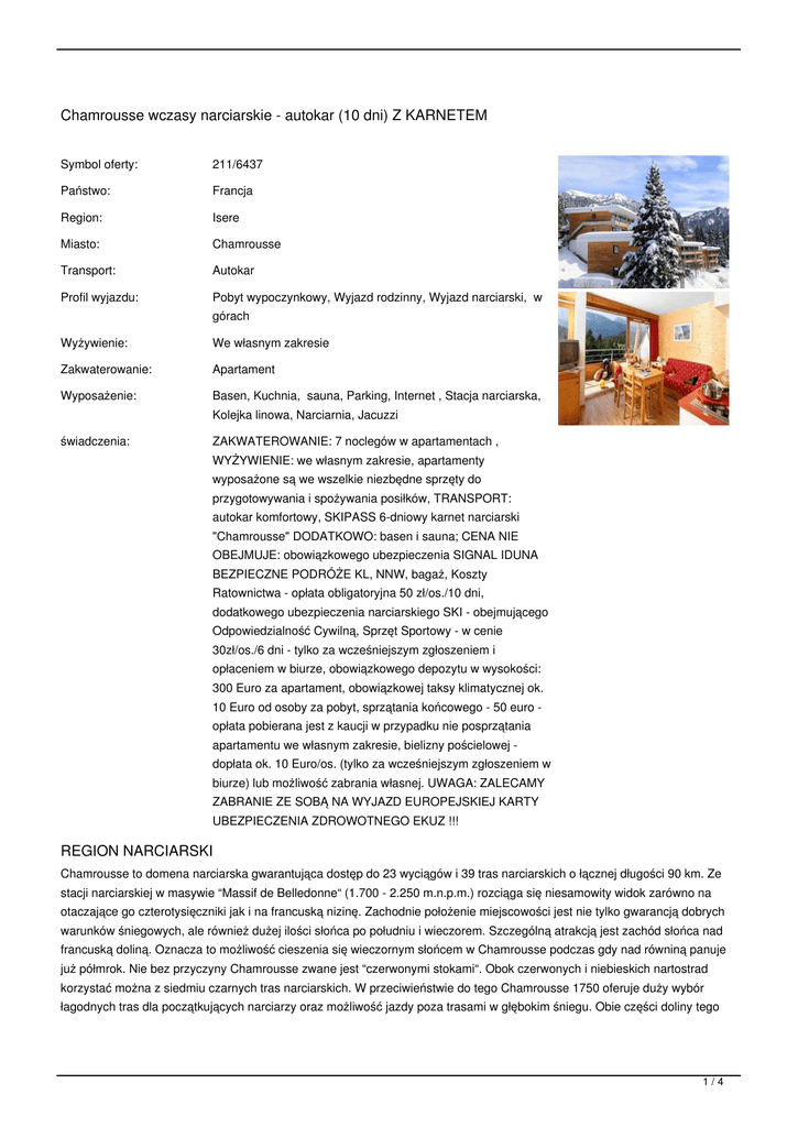 Chamrousse wczasy narciarskie - autokar (10 dni) Z KARNETEM Symbol oferty: 211/6437 Państwo: Francja Region: Isere Miasto: Chamrousse Transport: Autokar Profil wyjazdu: Pobyt wypoczynkowy, Wyjazd rodzinny, Wyjazd narciarski, w Wyżywienie: We własnym zakresie Zakwaterowanie: Apartament Wyposażenie: Basen, Kuchnia, sauna, Parking, Internet , Stacja narciarska, świadczenia: ZAKWATEROWANIE: 7 noclegów w apartamentach , górach Kolejka linowa, Narciarnia, Jacuzzi WYŻYWIENIE: we własnym zakresie, apartamenty wyposażone są we wszelkie niezbędne sprzęty do przygotowywania i spożywania posiłków, TRANSPORT: autokar komfortowy, SKIPASS 6-dniowy karnet narciarski "Chamrousse" DODATKOWO: basen i sauna; CENA NIE OBEJMUJE: obowiązkowego ubezpieczenia SIGNAL IDUNA BEZPIECZNE PODRÓŻE KL, NNW, bagaż, Koszty Ratownictwa - opłata obligatoryjna 50 zł/os./10 dni, dodatkowego ubezpieczenia narciarskiego SKI - obejmującego Odpowiedzialność Cywilną, Sprzęt Sportowy - w cenie 30zł/os./6 dni - tylko za wcześniejszym zgłoszeniem i opłaceniem w biurze, obowiązkowego depozytu w wysokości: 300 Euro za apartament, obowiązkowej taksy klimatycznej ok. 10 Euro od osoby za pobyt, sprzątania końcowego - 50 euro opłata pobierana jest z kaucji w przypadku nie posprzątania apartamentu we własnym zakresie, bielizny pościelowej - dopłata ok. 10 Euro/os. (tylko za wcześniejszym zgłoszeniem w biurze) lub możliwość zabrania własnej. UWAGA: ZALECAMY ZABRANIE ZE SOBĄ NA WYJAZD EUROPEJSKIEJ KARTY UBEZPIECZENIA ZDROWOTNEGO EKUZ !!! REGION NARCIARSKI Chamrousse to domena narciarska gwarantująca dostęp do 23 wyciągów i 39 tras narciarskich o łącznej długości 90 km. Ze stacji narciarskiej w masywie “Massif de Belledonne“ (1.700 - 2.250 m.n.p.m.) rozciąga się niesamowity widok zarówno na otaczające go czterotysięczniki jak i na francuską nizinę. Zachodnie położenie miejscowości jest nie tylko gwarancją dobrych warunków śniegowych, ale również dużej ilości słońca po południu i wieczorem. Szczególną atrakcją jest zachód słońca nad francuską doliną. Oznacza to możliwość cieszenia się wieczornym słońcem w Chamrousse podczas gdy nad równiną panuje już półmrok. Nie bez przyczyny Chamrousse zwane jest “czerwonymi stokami“. Obok czerwonych i niebieskich nartostrad korzystać można z siedmiu czarnych tras narciarskich. W przeciwieństwie do tego Chamrousse 1750 oferuje duży wybór łagodnych tras dla początkujących narciarzy oraz możliwość jazdy poza trasami w głębokim śniegu. Obie części doliny tego 1/4 terenu narciarskiego są przy tym idealnie ze sobą połączone. Stoki Chamrousse świetnie nadają się dla rodzin z dziećmi. Niewątpliwie jedną z największych atrakcji jest oświetlona trasa "Les Gaboureaux", z której jeżdżąc na nartach po zmroku podziwiać można zapierający dech w piersiach widok na światła Grenoble. STACJA CHAMROUSSE Chamrousse - stacja narciarska usytuowana w masywie Belledonne - ok. 30 km od Grenoble rozpościerająca się na dwóch wysokościach: Chamrousse 1650 (Recoin) oraz Chamrousse 1750-1700 (Roche Béranger - Domaine de l'Arselle) połączonych szlakami narciarskimi. Stacja usytuowana jest w samym sercu lasów modrzewiowych dając jednocześnie zapierający dech w piersiach widok na Grenoble i dolinę, w której jest położona. Miejscowość ta słynie przede wszystkim z rozgrywanych tam konkurencji olimpijskich i jest jednym z etapów Tour de France. Ponadto Chamrousse posiada również bardzo dobrze rozwinięte zaplecze komercyjno-rozrywkowe - pobyt umila bogata paleta poza narciarskich rozrywek i relaksu - m.in.: basen, lodowisko, tor saneczkowy, jazda na skuterze śnieżnym czy paralotnia. Położony niedaleko Grenoble kusi wieczornymi wycieczkami do tamtejszych restauracji i barów. O regionie Chamrousse mówi się,iż z jednej strony Roche Béranger jest lepszy dla początkujących, rodzin z dziećmi i miłośników freerideu - a z drugiej strony Le Recoin - uważany za region przeznaczony dla bardziej wymagających gości i kuszący dość trudnymi stokami, docenianymi CENA OBEJMUJE: Cena obejmuje: ZAKWATEROWANIE:7 noclegów w apartamentach; WYŻYWIENIE: we własnym zakresie, apartamenty wyposażone są we wszelkie niezbędne sprzęty do przygotowywania i spożywania posiłków; TRANSPORT: autokar komfortowy (klimatyzacja, WC, DVD, barek); SKIPASS: 6-dniowy karnet narciarski Chamrousse; DODATKOWO: basen, sauna; CENA NIE OBEJMUJE; - obowiązkowego ubezpieczenia SIGNAL IDUNA Bezpieczne Podróże (KL, NNW, bagaż, Koszty Ratownictwa) - opłata obligatoryjna 50zł/os/10dni; - dodatkowego, zalecanego ubezpieczenia narciarskiego SKI - obejmującego Odpowiedzialność Cywilną, Sprzęt Sportowy w cenie 30zł/os/6 dni- tylko za wcześniejszym zgłoszeniem i opłaceniem w biurze; - obowiązkowego depozytu w wysokości: 300 Euro za apartament - opłatę należy uiścić w dniu przyjazdu gotówką lub kartą kredytową natomiast zwracana jest w dniu wyjazdu po stwierdzeniu braku jakichkolwiek usterek bądź zniszczeń; - obowiązkowej taksy klimatycznej ok. 10 Euro od osoby za pobyt; - bielizny pościelowej - dopłata 10 euro/os - tylko za wcześniejszym zgłoszeniem w biurze lub możliwość zabrania własnej; -sprzątania końcowego 50 euro - opłata pobierana jest z kaucji w przypadku nie posprzątania apartamentu we własnym zakresie; ZAKWATEROWANIE Kompleks rezydencji usytuowany jest w górnej części stacji Chamrousse na wysokości 1700 m.n.p.m. Oddalony jest o ok. 50 200 m. od wyciągu narciarskiego "L’Arselle", który umożliwia idealny dostęp do terenu narciarskiego Chamrousse. Nowo wybudowane obiekty tworzą swojego rodzaju 8 ''mini-miejscowości'', z których każda liczy 4-5 budynków. Obiekty te które dzięki swojej drewnianej zabudowie doskonale wkomponowują się w górski krajobraz. Całość oddalona jest ok. 800 metrów od głównego centrum komercyjnego Chamrousse, gdzie zna
