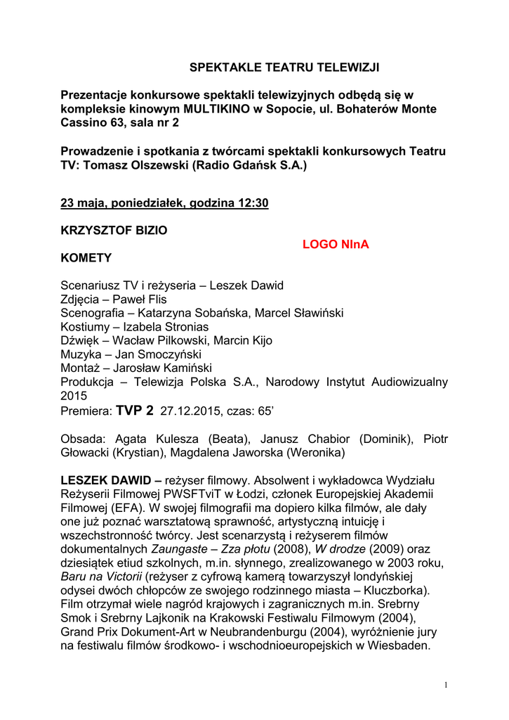 SPEKTAKLE TEATRU TELEWIZJI Prezentacje konkursowe spektakli telewizyjnych odbędą się w kompleksie kinowym MULTIKINO w Sopocie, ul. Bohaterów Monte Cassino 63, sala nr 2 Prowadzenie i spotkania z twórcami spektakli konkursowych Teatru TV: Tomasz Olszewski (Radio Gdańsk S.A.) 23 maja, poniedziałek, godzina 12:30 KRZYSZTOF BIZIO LOGO NInA KOMETY Scenariusz TV i reżyseria – Leszek Dawid Zdjęcia – Paweł Flis Scenografia – Katarzyna Sobańska, Marcel Sławiński Kostiumy – Izabela Stronias Dźwięk – Wacław Pilkowski, Marcin Kijo Muzyka – Jan Smoczyński Montaż – Jarosław Kamiński Produkcja – Telewizja Polska S.A., Narodowy Instytut Audiowizualny 2015 Premiera: TVP 2 27.12.2015, czas: 65’ Obsada: Agata Kulesza (Beata), Janusz Chabior (Dominik), Piotr Głowacki (Krystian), Magdalena Jaworska (Weronika) LESZEK DAWID – reżyser filmowy. Absolwent i wykładowca Wydziału Reżyserii Filmowej PWSFTviT w Łodzi, członek Europejskiej Akademii Filmowej (EFA). W swojej filmografii ma dopiero kilka filmów, ale dały one już poznać warsztatową sprawność, artystyczną intuicję i wszechstronność twórcy. Jest scenarzystą i reżyserem filmów dokumentalnych Zaungaste – Zza płotu (2008), W drodze (2009) oraz dziesiątek etiud szkolnych, m.in. słynnego, zrealizowanego w 2003 roku, Baru na Victorii (reżyser z cyfrową kamerą towarzyszył londyńskiej odysei dwóch chłopców ze swojego rodzinnego miasta – Kluczborka). Film otrzymał wiele nagród krajowych i zagranicznych m.in. Srebrny Smok i Srebrny Lajkonik na Krakowski Festiwalu Filmowym (2004), Grand Prix Dokument-Art w Neubrandenburgu (2004), wyróżnienie jury na festiwalu filmów środkowo- i wschodnioeuropejskich w Wiesbaden. 1 Reżyser, nominowany w 2004 do Paszportu „Polityki”, podkreślał, że jego na sprowadzała się do dzielenia tego, dosyć bolesnego doświadczenia z bohaterami, ale bez ingerowania w ich sprawy. Nagrody zdobyły również inne dokumenty Dawida: Moje miejsce (m.in. Srebrny Smok na Krakowskim Festiwalu Filmowym – 2005) oraz W drodze (Festiwal Mediów „Człowiek w zagrożeniu” w Łodzi – 2010). Na dużym ekranie debiutował filmem Ki (2011), ale dopiero film Jesteś Bogiem z 2012 roku, przyniósł reżyserowi krajowy i zagraniczny rozgłos. Film, który opowiada o życiu i twórczości Magika, człowieka z hiphopowego zespołu Paktofonika, został obsypany gradem najbardziej prestiżowych nagród, m.in. nagroda za debiut albo drugi film na Gdynia Film Festival (2012) i Bursztynowe Lwy (2013), nagroda za reżyserię na Festiwalu Młodego Kina Wschodnioeuropejskiego w Cottbus (2012), Orzeł w kategorii najlepszy film i najlepsza reżyseria (2013), nagroda publiczności na The New York Polish Film Festival w Nowym Jorku (2013). Debiutował w Teatrze Telewizji sztuką Petra Zelenki Skutki uboczne. Spektakl ten otrzymał Grand Prix Festiwalu „Dwa Teatry – Sopot 2014”. Komety to współczesny, kameralny obraz dwóch pokoleń i różnych postaw życiowych. Uwagę zwracają dobre dialogi i intrygująca, nie do końca jednoznaczna linia fabularna tworząca spójną całość. Uzupełnieniem jest znakomita obsada: Agata Kulesza, Janusz Chabior, Piotr Głowacki oraz debiutująca na ekranie Magdalena Jaworska. Niespełna 30-letnia Weronika wraca w rodzinne strony. Towarzyszy jej dużo starszy życiowy partner. Nadmorski ośrodek domków campingowych prowadzą jej rodzice, Dominik i Beata, niegdyś para zbuntowanych członków komuny hipisowskiej. To tutaj Weronika spędziła dzieciństwo i stąd wyrwała się w świat, przeciwstawiając się w ten sposób ideologii wyznawanej przez rodziców. Bohaterka wraca, aby zmierzyć się z przeszłością i brakiem, który pozostał jej po okresie dorastania w oparach alternatywnego życia. 2 23 maja, poniedziałek, godzina 14:00 ARTUR PAŁYGA TATO Reżyseria – Małgorzata Bogajewska Zdjęcia – Dariusz Pawelec Scenografia – Dominika Skaza Kostiumy – Dominika Skaza Dźwięk – Krzysztof Suchodolski Muzyka – Bartłomiej Woźniak Montaż – Dariusz Pawelec Producent wykonawczy – TVP Kraków Produkcja – Telewizja Polska S.A., Teatr Bagatela w Krakowie 2015 Premiera: TVP Kultura 27.10.2015, czas: 104’ Obsada: Anna Rokita (Mamusia), Adam Szarek (Franio), Marcel Wiercichowski (Ojciec), Wojciech Leonowicz (Dziadek/ Czarna postać z pieca/ Wujek Stefan/ Wojskowy I/ Pies), Przemysław Branny (Mariuszowa/ Pan z telewizora/ Wujek Edward/ Żołnierz, Wojskowy II), Patryk Kośnicki (Siostra/ Mariusz/ Pielęgniarka wojskowa/ Panienka z miasteczka/ Ksiądz/ Sąsiadka), Tomasz Lipiński (Brat/ Lekarz wojskowy/ Ciotka Atalia/ Wojskowy III/ Sąsiadka) MAŁGORZATA BOGAJEWSKA – reżyser. Absolwentka Wydziału Reżyserii Dramatu warszawskiej Akademii Teatralnej (2002). Studiowała aktorstwo w poznańskiej Akademii Sztuk Wizualnych oraz scenopisarstwo na Camerimage Film School w Toruniu. Uczestniczyła w wielu warsztatach teatrów alternatywnych i teatrów tańca, m.in. Odin Theater w Holstebro i Derevo Theater w Dreźnie. W latach 2004-2007 była dyrektorem artystycznym Teatru im. C.K. Norwida w Jeleniej Górze. Jest wykładowcą na wydziale aktorskim łódzkiej szkoły filmowej. Wyreżyserowała blisko 40 spektakli w teatrach Zielonej Góry i Jeleniej Góry, Radomia, Opola, Torunia, Warszawy, Krakowa i Łodzi. Najważniejsze realizacje to: Powrót Łukosza, Opowieść o zwyczajnym szaleństwie Zelenki w Teatrze Lubuskim w Zielonej Górze, Dotyk Modzelewskiego w Teatrze Powszechnym w Warszawie, Daily soup Muskarii w Teatrze Narodowym, Oblężenie Griszkowca w Teatrze Bagatela, Dwoje biednych Rumunów mówiących po polsku Masłowskiej w Teatrze Studyjnym w Łodzi, Osaczeni Zujewa, Kotka na gorącym blaszanym dachu Williamsa, Bóg mordu Rezy w Teatrze 6. Piętro w 3 Warszawie, Trzy siostry Czechowa w Teatrze Dramatycznym w Warszawie, Tato Pałygi w Teatrze Bagatela w Krakowie. Jej spektakle prezentowane były na licznych festiwalach zdo