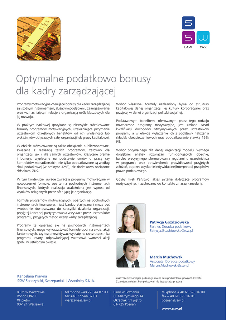 Optymalne podatkowo bonusy dla kadry zarządzającej Programy motywacyjne oferujące bonusy dla kadry zarządzającej są istotnym instrumentem, służącym pogłębieniu zaangażowania oraz wzmacniającym relacje z organizacją osób kluczowych dla jej rozwoju. W praktyce rynkowej spotykane są niezwykle zróżnicowane formuły programów motywacyjnych, uzależniające przyznanie uczestnikom określonych benefitów od ich wydajności lub wskaźników dotyczących całej organizacji lub grupy kapitałowej. W efekcie zróżnicowane są także obciążenia publicznoprawne, związane z realizacją takich programów, zarówno dla organizacji, jak i dla samych uczestników. Klasyczne premie i bonusy, wypłacane na podstawie umów o pracę czy kontraktów menadżerskich, nie tylko opodatkowane są według skali podatkowej (w praktyce 32%), ale dodatkowo obciążone składkami ZUS. W tym kontekście, uwagę zwracają programy motywacyjne w nowoczesnej formule, oparte na pochodnych instrumentach finansowych, których realizacja uzależniona jest wprost od wyników osiąganych przez oferującą je organizację. Wybór właściwej formuły uzależniony bywa od struktury kapitałowej danej organizacji, jej kultury korporacyjnej oraz przyjętej w danej organizacji polityki socjalnej. Podstawowym benefitem, oferowanym przez tego rodzaju nowoczesne programy motywacyjne, jest zmiana zasad kwalifikacji dochodów otrzymywanych przez uczestników programu a w efekcie wyłączenie ich z podstawy naliczania składek ubezpieczeniowych oraz opodatkowanie stawką 19% PIT. Wybór optymalnego dla danej organizacji modelu, wymaga dogłębnej analizy rozwiązań funkcjonujących obecnie, bardzo precyzyjnego sformułowania regulaminu uczestnictwa w programie oraz potwierdzenia prawidłowości przyjętych założeń, poprzez uzyskanie indywidualnej interpretacji przepisów prawa podatkowego. Gdyby mieli Państwo jakieś pytania dotyczące programów motywacyjnych, zachęcamy do kontaktu z naszą kancelarią. Formuła programów motywacyjnych, opartych na pochodnych instrumentach finansowych jest bardzo elastyczna i może być swobodnie dostosowana do specyfiki działania organizacji, przyjętej koncepcji partycypowania w zyskach przez uczestników programu, przyjętych metod oceny kadry zarządzającej. Patrycja Goździowska Programy te opierając się na pochodnych instrumentach finansowych, mogą wykorzystywać formułę opcji na akcje, akcji fantomowych, czy też przewidywać wypłatę na rzecz uczestnika programu kwoty, odpowiadającej wzrostowi wartości akcji spółki w ustalonym okresie. Partner, Doradca podatkowy [email protected] Marcin Muchowski Associate, Doradca podatkowy [email protected] Kancelaria Prawna SSW Spaczyński, Szczepaniak i Wspólnicy S.K.A. Biuro w Warszawie Rondo ONZ 1 XII piętro 00-124 Warszawa tel./phone +48 22 544 87 00 fax +48 22 544 87 01 [email protected] Zastrzeżenie: Niniejsza publikacja ma na celu podkreślenie pewnych kwestii. Z założenia nie jest kompleksowa i nie jest poradą prawną. Biuro w Poznaniu ul. Mielżyńskiego 14 Okrąglak, VII piętro 61-725 Poznań tel./phone + 48 61 625 16 00 fax + 48 61 625 16 01 [email protected] www.ssw.pl Bonus fiscalement optimales pour les dirigeants Les programmes d’incitation offrant des bonus pour les dirigeants constituent, sans doute, élement important pour approfondir l’engagement et renforcer les relations avec l’organisation des personnes essentiels pour son développement. Le choix de la formule appropriée dépend de la structure du capital de l’organisation, la culture d’entreprise ou de la politique sociale adoptée par l’organisation. En pratique du marché, on peut rencontrer des formules des programmes d’incitation extrêmement variés, subordonnant l’octroi d’avantages aux participants sur leur performance ou des indicateurs relatifs à l’organisation ou groupe de capital même. L’ avantage fondamental offert par ce genre de programmes d’incitation modernes, est le changement de la qualifiation des revenus obtenus par les participants et, en consequence, d’un côté l’exclusion des primes versées aux bénéficiaires de la base de calcul des primes d’assurance et, de l’autre côté, l’application d’un taux d’imposition fixe de 19%. En conséquence, differents sont aussi des fardeaux fiscal, liés à la mise en œuvre de ces programmes, à la fois pour l’organisation et pour les participants eux-mêmes. Les bonus « classiques » et les primes versées sur la base de contrats de travail ou de contrats de gestion, sont non seulement taxés en pratique selon la taux de l’impôt de 32%, mais aussi constitutent la base des primes d’assurance. Le choix du modèle optimal pour chaque organisation exige une analyse profonde du fonctionnement de l’organisation, préparation de très précis règles de participation au programme et la confirmation des conditions adoptés, par l’obtention de l’interprétation individuelle du droit fiscal. En ce context, l’attention tirent des programmes d’incitation à la formule moderne, basés sur des instruments financiers dérivés, la mise en œuvre de ce qui est directement dépendante des résultats obtenus par l’organisation. Si vous avez des questions concernant les programmes incitation, nous vous invitons à contacter notre cabinet. La formule des programmes d’incitation basée sur les instruments financiers dérivés est très flexible et peut être adaptée aux activités spécifiques de l’organisation, ainsi qu’au concept adopté de la participation aux bénéfices par les participants du programme ou des méthodes reconnues pour évaluer les dirigeants. Patrycja Goździowska Ces programmes fondées sur des instruments financiers dérivés peuvent utiliser la formule de stock-options, « les actions fictives », ou prévoir le paiement au participant de la quantité correspondant à l’augmentation de la valeur des action