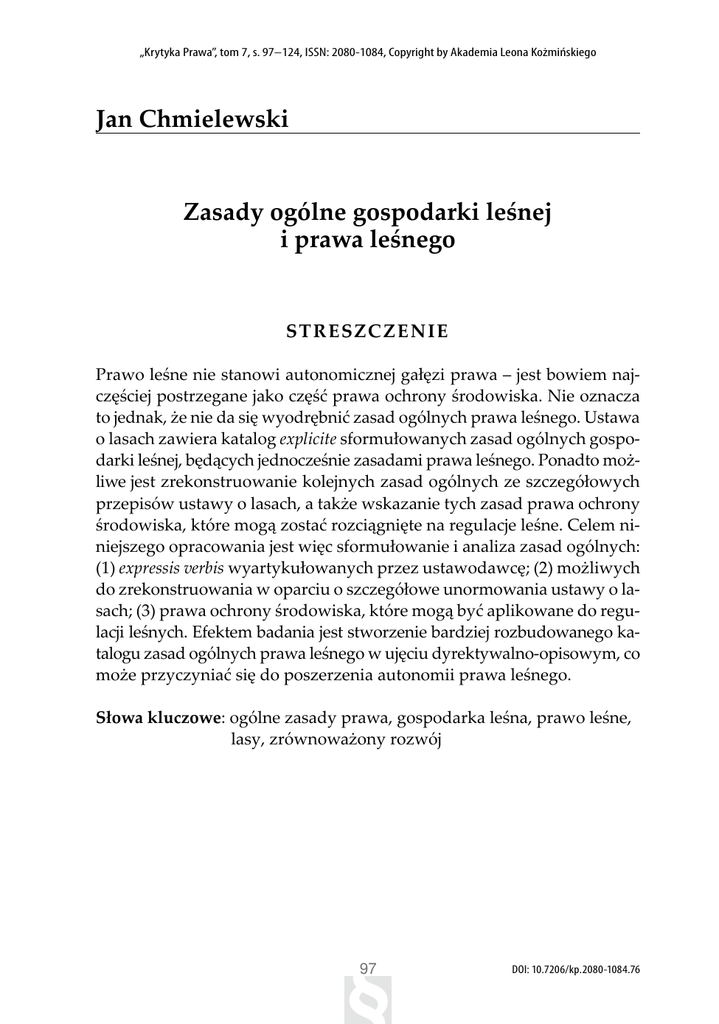 „Krytyka Prawa”, tom 7, s. 97–124, ISSN: 2080-1084, Copyright by Akademia Leona Kożmińskiego Jan Chmielewski Zasady ogólne gospodarki leśnej i prawa leśnego ST R ESZC Z EN I E Prawo leśne nie stanowi autonomicznej gałęzi prawa – jest bowiem najczęściej postrzegane jako część prawa ochrony środowiska. Nie oznacza to jednak, że nie da się wyodrębnić zasad ogólnych prawa leśnego. Ustawa o lasach zawiera katalog explicite sformułowanych zasad ogólnych gospodarki leśnej, będących jednocześnie zasadami prawa leśnego. Ponadto możliwe jest zrekonstruowanie kolejnych zasad ogólnych ze szczegółowych przepisów ustawy o lasach, a także wskazanie tych zasad prawa ochrony środowiska, które mogą zostać rozciągnięte na regulacje leśne. Celem niniejszego opracowania jest więc sformułowanie i analiza zasad ogólnych: (1) expressis verbis wyartykułowanych przez ustawodawcę; (2) możliwych do zrekonstruowania w oparciu o szczegółowe unormowania ustawy o lasach; (3) prawa ochrony środowiska, które mogą być aplikowane do regulacji leśnych. Efektem badania jest stworzenie bardziej rozbudowanego katalogu zasad ogólnych prawa leśnego w ujęciu dyrektywalno-opisowym, co może przyczyniać się do poszerzenia autonomii prawa leśnego. Słowa kluczowe: ogólne zasady prawa, gospodarka leśna, prawo leśne, lasy, zrównoważony rozwój 97 DOI: 10.7206/kp.2080-1084.76 „Krytyka Prawa”, tom 7, s. 97–124, ISSN: 2080-1084, Copyright by Akademia Leona Kożmińskiego Jan Chmielewski General principles of forest management and forestry law ABST R AC T Forestry Law does not constitute an autonomous branch of law – it is in fact most commonly percieved as part of the environmental law. However, this does not mean, that it is impossible to extract general principles of the Forest Law. The Forest Act contains a catalogue of explicitly formulated general principles of forest management, which at the same time are the principles of forest law. Furthermore, it is possible to reconstruct some additional general principles from specific provisions of the Forest Act, as well as to indicate those of the principles of the environmental law, which may be extended to forestry regulations. The aim of this paper is therefore to formulate and analyse the general principles: (1) expressly articulated by the legislature; (2) possible to reconstruct from the detailed provisions of the Forest Act; (3) of the environmental law, which can be applied to forestry regulations. The result of the survey is a more extensive catalogue of general principles of forest law in directive-descriptive terms, which may contribute to the extension of the autonomy of the forest law. Keywords: general principles of law, forest management, forest law, forests, sustainable development DOI: 10.7206/kp.2080-1084.76 98 Zasady ogólne gospodarki leśnej i prawa leśnego 1 W P ROWADZ EN I E Lasy w Polsce zajmują blisko trzecią część powierzchni kraju1 i pełnią szereg niezmiernie istotnych funkcji. Należy tutaj wymienić zwłaszcza funkcje: (1) gospodarcze (produkcyjne i reprodukcyjne) oraz (2) pozagospodarcze obejmujące funkcje ekologiczne (korzystny wpływ lasów na środowisko życia człowieka) i społeczne (las jako miejsce wypoczynku)2. Ponadto gospodarka leśna, w szczególności zaś produkcja drewna, stanowi – obok rolnictwa, handlu czy budownictwa – jedną z istotnych gałęzi gospodarki narodowej3. Jednocześnie jest charakterystyczne, że mimo niekwestionowanej roli, jaką ekosystemy leśne odgrywają w życiu ludzi i działalności państwa, normatywne podstawy ich funkcjonowania (ustawa z dnia 28 września 1991 r. o lasach4) nie wzbudzają większego zainteresowania przedstawicieli doktryny, pozostając niejako na marginesie głównego nurtu rozważań teoretycznoprawnych5. Nie oznacza to rzecz jasna, że problematyka prawa leśnego6 jest całkowicie pomijana przez jurysprudencję. Niemniej jednak stopień i natężenie zainteresowania prawem leś nym są – jak się wydaje – całkowicie nieadekwatne do rzeczywistej pozycji lasów oraz doniosłości regulacji sektora leśnego. Prawo leśne, jego przepisy i normy, są niezwykle interesujące nie tylko z poznawczego (teoretycznego), ale także i z praktycznego punktu widzenia. Warto więc prowadzić pogłębione badania nad tymi zagadnieniami. Jest to kluczowa przyczyna uzasadniająca wybór tematyki niniejszego opracowania. 1 Zgodnie z Raportem o stanie lasów w Polsce w 2013 roku sporządzonym i opublikowanym przez Centrum Informacyjne Lasów Państwowych powierzchnia lasów wynosi 29,4% powierzchni kraju. Raport dostępny na stronie: http://bip.lasy.gov.pl/pl/bip/raporty_i_prognozy. 2 R. Jaszczak, Funkcje lasów, [w:] W. Kusiak, R. Jaszczak, Propedeutyka leśnictwa, Poznań 2009, s. 62–63. 3 O potencjale lasów świadczą – na szczęście do tej pory nieskuteczne – próby prywatyzacji Lasów Państwowych poprzez wprowadzenie zmian w materii konstytucyjnej. 4 Dz.U. z 2011 r. Nr 12, poz. 59 ze zm., dalej: ustawa o lasach. 5 B. Rakoczy, Wprowadzenie do prawa leśnego, [w:] B. Rakoczy (red.), Wybrane problemy prawa leśnego, Warszawa 2011, s. 9. 6 Wprawdzie wyodrębnienie prawa leśnego jako samoistnej poddziedziny prawa administracyjnego jest – o czym będzie jeszcze mowa – kwestią kontrowersyjną, to jednak dla potrzeb wywodu posługuję się, oprócz pojęcia gospodarki leśnej, pojęciem teoretycznoprawnym o charakterze szerszym, a mianowicie pojęciem „prawo leśne”. 99 DOI: 10.7206/kp.2080-1084.76 Krytyka Prawa Zakres przedmiotowy tekstu obejmuje analizę fundamentalnej problematyki, jaką są zasady ogólne gospodarki leśnej oraz prawa leśnego. Przy czym nie chodzi tutaj wyłącznie o analizę zasad ujętych przez ustawodawcę, ale także o propozycję wskazania dodatkowych, możliwych do wyodrębnienia wiodących reguł gospodarki leśnej (prawa leśnego). Innymi słowy głównym celem opracowania jest 