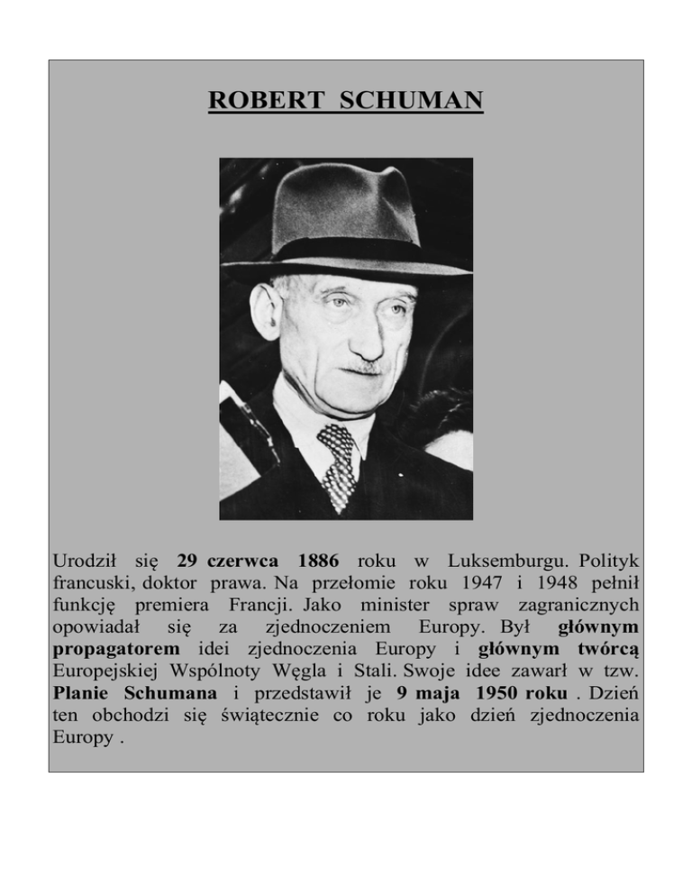 ROBERT SCHUMAN Urodził się 29 czerwca 1886 roku w Luksemburgu. Polityk francuski, doktor prawa. Na przełomie roku 1947 i 1948 pełnił funkcję premiera Francji. Jako minister spraw zagranicznych opowiadał się za zjednoczeniem Europy. Był głównym propagatorem idei zjednoczenia Europy i głównym twórcą Europejskiej Wspólnoty Węgla i Stali. Swoje idee zawarł w tzw. Planie Schumana i przedstawił je 9 maja 1950 roku . Dzień ten obchodzi się świątecznie co roku jako dzień zjednoczenia Europy .