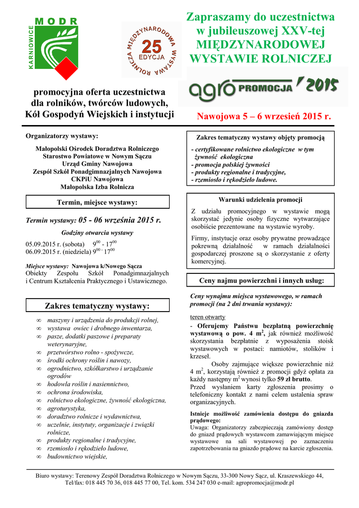 Zapraszamy do uczestnictwa w jubileuszowej XXV-tej MIĘDZYNARODOWEJ • banki, firmy ubezpieczeniowe i inne obsługujące rolnictwo, WYSTAWIE ROLNICZEJ promocyjna oferta uczestnictwa dla rolników, twórców ludowych, Kół Gospodyń Wiejskich i instytucji Nawojowa 5 – 6 wrzesień 2015 r. Organizatorzy wystawy: Zakres tematyczny wystawy objęty promocją Małopolski Ośrodek Doradztwa Rolniczego Starostwo Powiatowe w Nowym Sączu Urząd Gminy Nawojowa Zespół Szkół Ponadgimnazjalnych Nawojowa CKPiU Nawojowa Małopolska Izba Rolnicza Termin, miejsce wystawy: Termin wystawy: 05 - 06 września 2015 r. Godziny otwarcia wystawy 05.09.2015 r. (sobota) 900 - 1700 06.09.2015 r. (niedziela) 900 - 1700 Miejsce wystawy: Nawojowa k/Nowego Sącza Obiekty Zespołu Szkół Ponadgimnazjalnych i Centrum Kształcenia Praktycznego i Ustawicznego. Zakres tematyczny wystawy: • • • • • • • • • • • • • • • maszyny i urządzenia do produkcji rolnej, wystawa owiec i drobnego inwentarza, pasze, dodatki paszowe i preparaty weterynaryjne, przetwórstwo rolno - spożywcze, środki ochrony roślin i nawozy, ogrodnictwo, szkółkarstwo i urządzanie ogrodów hodowla roślin i nasiennictwo, ochrona środowiska, rolnictwo ekologiczne, żywność ekologiczna, agroturystyka, doradztwo rolnicze i wydawnictwa, uczelnie, instytuty, organizacje i związki rolnicze, produkty regionalne i tradycyjne, rzemiosło i rękodzieło ludowe, budownictwo wiejskie, - certyfikowane rolnictwo ekologiczne w tym żywność ekologiczna - promocja polskiej żywności - produkty regionalne i tradycyjne, - rzemiosło i rękodzieło ludowe. Warunki udzielenia promocji Z udziału promocyjnego w wystawie mogą skorzystać jedynie osoby fizyczne wytwarzające osobiście prezentowane na wystawie wyroby. Firmy, instytucje oraz osoby prywatne prowadzące pokrewną działalność w ramach działalności gospodarczej proszone są o skorzystanie z oferty komercyjnej. Ceny najmu powierzchni i innych usług: Ceny wynajmu miejsca wystawowego, w ramach promocji (na 2 dni trwania wystawy): teren otwarty - Oferujemy Państwu bezpłatną powierzchnię wystawową o pow. 4 m2, jak również możliwość skorzystania bezpłatnie z wyposażenia stoisk wystawowych w postaci: namiotów, stolików i krzeseł. Osoby zajmujące większe powierzchnie niż 4 m2, korzystają również z promocji gdyż opłata za każdy następny m2 wynosi tylko 59 zł brutto. Przed wysłaniem karty zgłoszenia prosimy o telefoniczny kontakt z nami celem ustalenia spraw organizacyjnych. Istnieje możliwość zamówienia dostępu do gniazda prądowego: Uwaga: Organizatorzy zabezpieczają zamówiony dostęp do gniazd prądowych wystawcom zamawiającym miejsce wystawowe na sali wystawowej po zaznaczeniu zapotrzebowania na gniazdo prądowe na karcie zgłoszenia. Biuro wystawy: Terenowy Zespół Doradztwa Rolniczego w Nowym Sączu, 33-300 Nowy Sącz, ul. Kraszewskiego 44, Tel/fax: 018 445 70 36, 018 445 77 00, Tel. kom. 534 247 030 e-mail: [email protected] Jest ponadto możliwość zamówienia dostępu do gniazda prądowego na terenie otwartym po uprzednim telefonicznym uzgodnieniu tego faktu z organizatorem. Reklamy bezpłatne i płatne oraz ceny reklam: Z okazji Wystawy „Agropromocja 2015” wydajemy Katalog Wystawców (nakład Katalogu 3000 szt.), który jest bezpłatnie rozprowadzany dla zwiedzających wystawę w trakcie jej trwania. W katalogu umieszczamy: 1. W ramach opłaty za powierzchnię wystawową dokonujemy wpisu prezentowanej działalności wystawcy. Publikujemy wpis dotyczący działalności wystawcy o objętości do 90 znaków drukarskich. (Nazwa firmy i jej dane teleadresowe publikowane są poza w/w objętością) 2. W ramach dodatkowej opłaty w katalogu można zamówić reklamy płatne drukowane w formacie A5 na papierze kredowym. (Decydując się na skorzystanie z możliwości zamieszczenia reklamy prosimy o przysłanie na nośniku informacji lub elektronicznie reklamy odpowiadającej niżej wymienionym parametrom w postaci plików: pdf, wysokiej rozdzielczości jpg, lub cdr wersja 9 /teksty zamienione na krzywe/). Odpłatność za dodatkową reklamę: - reklama czarno-biała powierzchnia zadruku 148,5x210 (A5) 200 zł +23%VAT powierzchnia zadruku 105x148,5 (A6) 100 zł +23%VAT - reklama kolorowa powierzchnia zadruku 148,5x210 (A5) 400 zł +23%VAT powierzchnia zadruku 105x148,5 (A6) 210 zł +23%VAT Tereny wystawy „Agropromocja 2015” są centralnie nagłośnione w związku z tym jest możliwość zamówienia reklamy słownej która jest emitowana w trakcie trwania wystawy. (Z dostarczonych materiałów tekstowych zamawiającego nagrany zostanie komunikat dźwiękowy zawierający do 35 słów prezentujący ofertę wystawcy. Nazwa firmy i jej dane teleadresowe nagrywane są poza w/w objętością) Odpłatność: - dźwiękowy spot reklamowy - 200 zł brutto Termin zamawiania i uzgadniania treści reklam płatnych do 14.08.2014 r. Reklama na stronie internetowej Agropromocji 2015: www.modr.pl Wszyscy wystawcy biorący udział w Wystawie „Agropromocja 2015” w ramach odpłatności za powierzchnię wystawową uzyskają prawo do reklamy na naszej stronie internetowej. Reklama będzie obejmować dane teleadresowe wystawcy oraz tekst zgłoszony do katalogu wystawców. Okres emisji reklamy: Od 7 września do końca 2015 roku. Zgłoszenie uczestnictwa Zgłoszenie udziału i wszystkie zapytania w sprawie wystawy prosimy kierować na adres: Małopolski Ośrodek Doradztwa Rolniczego Powiatowy Zespół Doradztwa Rolniczego w Nowym Sączu 33-300 Nowy Sącz, ul. Kraszewskiego 44 tel./fax (018) 445-70-36, 445-77-00 tel. kom. 534 247 030 e-mail: [email protected] Termin nadsyłania zgłoszeń 21 sierpień 2015 r. Potwierdzeniem udziału w wystawie jest przesłanie zgłoszenia uczestnictwa do Biura Agropromocji i dokonanie przelewu pieniężnego za zarezerwowaną powierzchnię i zamawianą reklamę na konto: Małopolski Ośrodek Doradztwa Rolniczego w K