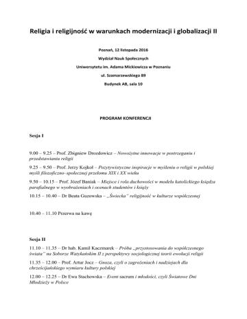 Religia i religijność w warunkach modernizacji i globalizacji II Poznań, 12 listopada 2016 Wydział Nauk Społecznych Uniwersytetu im. Adama Mickiewicza w Poznaniu ul. Szamarzewskiego 89 Budynek AB, sala 10 PROGRAM KONFERENCJI Sesja I 9.00 – 9.25 – Prof. Zbigniew Drozdowicz – Nowożytne innowacje w postrzeganiu i przedstawianiu religii 9.25 – 9.50 – Prof. Jerzy Kojkoł – Pozytywistyczne inspiracje w myśleniu o religii w polskiej myśli filozoficzno–społecznej przełomu XIX i XX wieku 9.50 – 10.15 – Prof. Józef Baniak – Miejsce i rola duchowości w modelu katolickiego księdza parafialnego w wyobrażeniach i ocenach studentów i księży 10.15 – 10.40 – Dr Beata Guzowska – „Świecka” religijność w kulturze współczesnej 10.40 – 11.10 Przerwa na kawę Sesja II 11.10 – 11.35 – Dr hab. Kamil Kaczmarek – Próba „przystosowania do współczesnego świata” na Soborze Watykańskim II z perspektywy socjologicznej teorii ewolucji religii 11.35 – 12.00 – Prof. Artur Jocz – Gnoza, czyli o zagrożeniach i nadziejach dla chrześcijańskiego wymiaru kultury polskiej 12.00 – 12.25 – Dr Ewa Stachowska – Event sacrum i młodości, czyli Światowe Dni Młodzieży w Polsce 12.25 – 12.50 – Dr Remigiusz Ciesielski – Bractwo Piusa X – 50 lat po ogłoszeniu Konstytucji Sacrosanctum concilium w tekstach kwartalnika Zawsze Wierni 12.50 – 13.15 – Dr Juliusz Iwanicki – Popkultura chrześcijańska? Kultura popularna a polska myśl religijna 13.15 – 14.45 Przerwa obiadowa Sesja III 14.45 – 15.10 – Dr Ryszard Wójtowicz – Prawo naturalne w sferze społeczno–politycznej. Analiza dystynkcji 15.10 – 15.35 – Dr Gracjana Dutkiewicz – Religia i polityka we współczesnym świecie 15.35 – 16.00 – Dr Gracjan Cimek – Elementy religijne w politycznych i ekonomicznych przejawach globalizacji 16.00 – 16.25 – Mgr Paweł Kusiak – Polityczny i ideowy wymiar X Zjazdu Gnieźnieńskiego 16.25 – 16.55 – Przerwa na kawę Sesja IV 16.55 – 17.20 – Dr Jacek Zydorowicz – Obrazy (na) uchodźców. Ikonografia napięć społecznych wokół tzw. kryzysu migracyjnego 17.20 – 17.45 – Dr Konrad Szocik – Czy religia jest dzisiaj adaptacyjna, i czy w ogóle kiedykolwiek była? 17.45 – 18.10 – Dr Sławomir Sztajer – Młodzi dorośli i religia w perspektywie porównawczej 18.10 – 18.35 – Mgr Sylwia Wachulak – Kulturowa rola konwersji na islam we współczesnej Polsce jako element wyboru alternatywnej religijności – założenia teoretyczne 18.35 – 19.00 – Mgr Mateusz Deker – „Practice and all is coming” – o popularności jogi we współczesnym świecie 19.00 – Uroczysta kolacja
