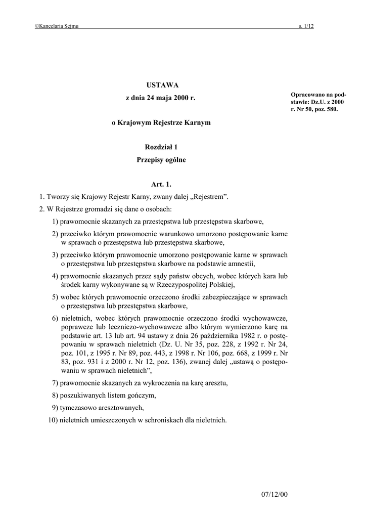 07/12/00 USTAWA z dnia 24 maja 2000 r. o Krajowym Rejestrze