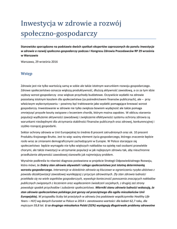 Inwestycja w zdrowie a rozwój społeczno-gospodarczy Stanowisko sporządzone na podstawie dwóch spotkań ekspertów zaproszonych do panelu Inwestycja w zdrowie a rozwój społeczno-gospodarczy podczas I Kongresu Zdrowia Pracodawców RP 29 września w Warszawie Warszawa, 29 września 2016 Wstęp Zdrowie jest nie tylko wartością samą w sobie ale także istotnym warunkiem rozwoju gospodarczego. Zdrowe społeczeństwo oznacza większą produktywność, dłuższą aktywność zawodową, a co za tym idzie szybszy wzrost gospodarczy oraz większe przychody budżetowe. Oczywiście wydatki na zdrowie pozostaną istotnym kosztem dla społeczeństwa (za pośrednictwem finansów publicznych), ale – przy właściwym wykorzystywaniu – powinny być traktowanie jako wydatki pomagające kreować wzrost gospodarczy. Inwestowanie w zdrowie nie tylko zwiększa bowiem wydajność ale także pomaga zmniejszyć przyszłe koszty związane z leczeniem chorób, którym można zapobiec. W obliczu starzenia populacji wydłużenie aktywności zawodowej i zwiększenie efektywności systemu ochrony zdrowia są warunkami niezbędnymi dla utrzymania stabilności finansów publicznych oraz zdrowej, konkurencyjnej i szybko rosnącej gospodarki. Sektor ochrony zdrowia w Unii Europejskiej to średnio 8 procent zatrudnionych oraz ok. 10 procent Produktu Krajowego Brutto. Jest to więc ważny element życia gospodarczego, którego znaczenie będzie rosło wraz ze zmianami demograficznymi zachodzącymi w Europie. W Polsce starzejące się społeczeństwo będzie wymagało nie tylko większych nakładów na opiekę nad osobami przewlekle chorymi, ale także inwestycji w utrzymanie populacji w jak najlepszym zdrowiu tak, aby nieuchronne przedłużenie aktywności zawodowej stanowiło jak najmniejszy problem. Wyraźnie podkreśla to również diagnoza postawiona w projekcie Strategii Odpowiedzialnego Rozwoju, która mówi, że Dobry stan zdrowia obywateli i całego społeczeństwa jest istotną determinantą wzrostu gospodarczego. Interwencje w dziedzinie zdrowia są kluczowe w ograniczaniu ryzyka ubóstwa z powodu dezaktywizacji zawodowej wynikającej z przyczyn zdrowotnych. Zły stan zdrowia ludności przekłada się na wiele aspektów gospodarczych, wywołuje konieczność ponoszenia znaczących nakładów publicznych związanych z leczeniem oraz wypłacaniem świadczeń socjalnych, z drugiej zaś strony powoduje spadek przychodów i zubożenie społeczeństwa. Mierniki stanu zdrowia ludności wskazują, że stan zdrowia społeczeństwa polskiego jest gorszy od przeciętnego dla ogółu mieszkańców Unii Europejskiej. W przypadku liczby lat przeżytych w zdrowiu (na podstawie współczynnika Healthy Life Years – HLY) wg danych Eurostat w Polsce w 2014 r. zanotowano wartości: dla kobiet 62,7 roku, dla mężczyzn 59,8 lat. U co drugiego mieszkańca Polski (52%) występują długotrwałe problemy zdrowotne lub choroby przewlekłe, a 59% Polaków w wieku 15 lat i więcej skarży się na długotrwałe dolegliwości zdrowotne (trwające co najmniej 6 miesięcy). Choroby cywilizacyjne, wraz z chorobami nowotworowymi, to najczęstsze przyczyny zgonów wśród Polaków.(SOR str. 221 – podkreślenie aut.) Chorobowość i zachorowalność odbijają się na rynku pracy, pogarszając sytuację pracowników i pracodawców. Szacuje się, że wywołany chorobami absenteizm sięga w Unii Europejskiej od 3 do 6 procent czasu pracy, co przekłada się na 2,5 procent PKB. Część chorych pracowników nie wraca na rynek pracy przechodząc na wcześniejsze emerytury, rentę lub umierając przedwcześnie. Ludność Polski szybko się starzeje. Pomimo niedawnego podniesienia wieku emerytalnego, liczba osób w wieku produkcyjnym za 25 lat spadnie o 2,5 mln. Średni wiek wyjścia z rynku pracy w Polsce to 58 rż. Bez inwestycji w zdrowie osób pracujących i dłuższe życie w lepszym zdrowiu, wzrost Produktu Krajowego Brutto w Polsce może znacząco zwolnić lub nawet całkowicie wyhamować. W starzejącej się Europie mobilność, wydajność i zdolność do pracy może wpływać na konkurencyjność gospodarek poszczególnych krajów. Według szacunków OECD wydłużenie oczekiwanej długości życia populacji o jeden rok może przełożyć się na wzrost Produktu Krajowego Brutto o 4 procent. Zdrowie przez wiele lat było w Polsce traktowane jako koszt, a nie jako inwestycja. W efekcie poza nielicznymi obszarami, przez lata było niedoinwestowane. Dlatego z zadowoleniem należy przyjąć dekarację Pani Premier i Ministra Zdrowia o planowanym zwiększeniu nakładów publicznych na ochronę zdrowia do 6 procent PKB. Zdaniem panelu ekspertów Pracodawców RP powinno jednak dojść do tego szybciej niż w ciągu 10 lat. Stan obecny – obszary problemowe 1. Wydatki na zdrowie Zapowiadany wzrost wydatków na zdrowie do 6 procent PKB w ciągu 10 lat nie zaspokoi rosnących potrzeb, wynikających z tempa starzenia się populacji. Szacuje się, że potrzeby te będą rosły około 0,15% PKB rocznie, co oznacza, że nawet gdyby udało się podnieść wydatki do 6% PKB do 2025 roku, to podtrzymamy jedynie obecny poziom finansowania opieki zdrowotnej nie zyskując nic dodatkowo. W ostatnim dziesięcioleciu w większości krajów Produkt Krajowy Brutto rósł wolniej niż przyrost nakładów na ochronę zdrowia. Zatem we wszystkich krajach Unii Europejskiej wzrósł procent wydatków na ochronę zdrowia w stosunku do PKB i chcąc utrzymać porównywalny poziom w tym zakresie, Polska również powinna te wydatki zwiększać. Dostrzeżono to zresztą w dagnozie opisanej w Strategii Odpowiedzialnego Rozwoju: W Polsce zły stan zdrowia jest jedną z podstawowych przyczyn pozostawania bez pracy (choroba i niepełnosprawność są trzecią w kolejności przyczyną pozostawania biernym zawodowo). Pośrednie, bezpośrednie oraz niematerialne koszty chorób, tj. koszty leczenia, zmniejszenie dochodów, wcześniejsze odejście z rynku pracy, obciążaj