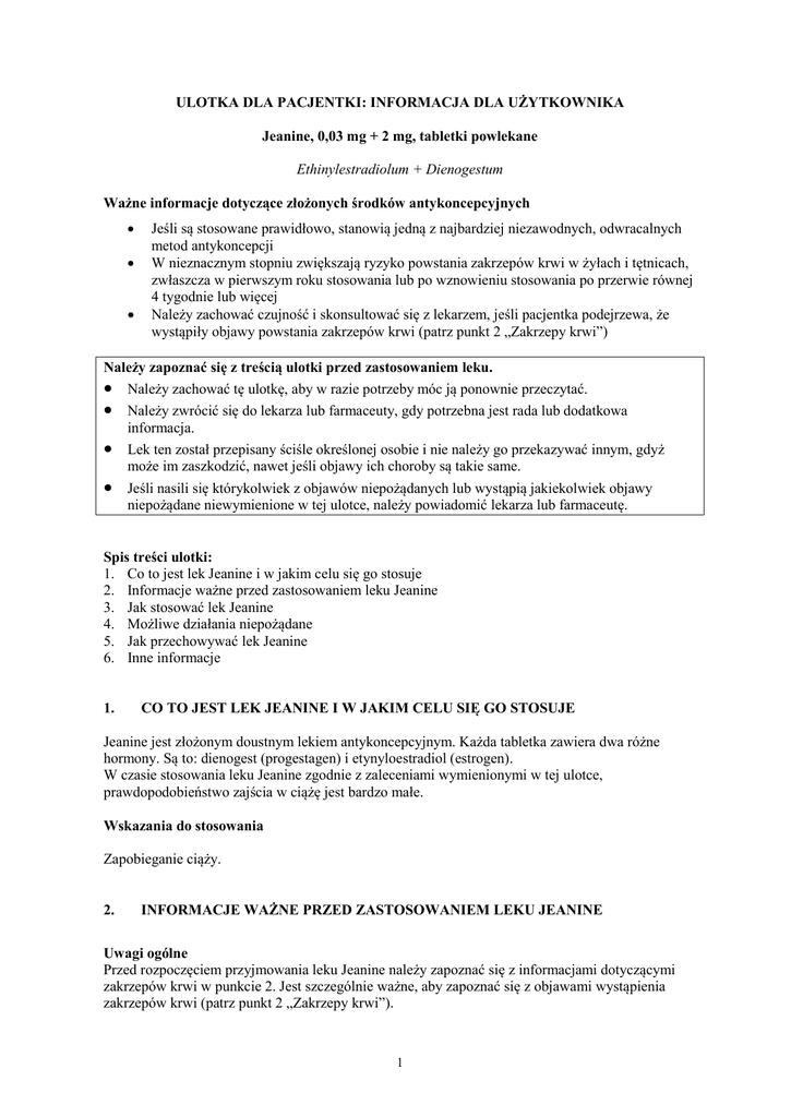 ULOTKA DLA PACJENTKI: INFORMACJA DLA UŻYTKOWNIKA Jeanine, 0,03 mg + 2 mg, tabletki powlekane Ethinylestradiolum + Dienogestum Ważne informacje dotyczące złożonych środków antykoncepcyjnych • • • Jeśli są stosowane prawidłowo, stanowią jedną z najbardziej niezawodnych, odwracalnych metod antykoncepcji W nieznacznym stopniu zwiększają ryzyko powstania zakrzepów krwi w żyłach i tętnicach, zwłaszcza w pierwszym roku stosowania lub po wznowieniu stosowania po przerwie równej 4 tygodnie lub więcej Należy zachować czujność i skonsultować się z lekarzem, jeśli pacjentka podejrzewa, że wystąpiły objawy powstania zakrzepów krwi (patrz punkt 2 „Zakrzepy krwi”) Należy zapoznać się z treścią ulotki przed zastosowaniem leku. • Należy zachować tę ulotkę, aby w razie potrzeby móc ją ponownie przeczytać. • Należy zwrócić się do lekarza lub farmaceuty, gdy potrzebna jest rada lub dodatkowa informacja. • Lek ten został przepisany ściśle określonej osobie i nie należy go przekazywać innym, gdyż może im zaszkodzić, nawet jeśli objawy ich choroby są takie same. • Jeśli nasili się którykolwiek z objawów niepożądanych lub wystąpią jakiekolwiek objawy niepożądane niewymienione w tej ulotce, należy powiadomić lekarza lub farmaceutę. Spis treści ulotki: 1. Co to jest lek Jeanine i w jakim celu się go stosuje 2. Informacje ważne przed zastosowaniem leku Jeanine 3. Jak stosować lek Jeanine 4. Możliwe działania niepożądane 5. Jak przechowywać lek Jeanine 6. Inne informacje 1. CO TO JEST LEK JEANINE I W JAKIM CELU SIĘ GO STOSUJE Jeanine jest złożonym doustnym lekiem antykoncepcyjnym. Każda tabletka zawiera dwa różne hormony. Są to: dienogest (progestagen) i etynyloestradiol (estrogen). W czasie stosowania leku Jeanine zgodnie z zaleceniami wymienionymi w tej ulotce, prawdopodobieństwo zajścia w ciążę jest bardzo małe. Wskazania do stosowania Zapobieganie ciąży. 2. INFORMACJE WAŻNE PRZED ZASTOSOWANIEM LEKU JEANINE Uwagi ogólne Przed rozpoczęciem przyjmowania leku Jeanine należy zapoznać się z informacjami dotyczącymi zakrzepów krwi w punkcie 2. Jest szczególnie ważne, aby zapoznać się z objawami wystąpienia zakrzepów krwi (patrz punkt 2 „Zakrzepy krwi”). 1 Kiedy nie stosować leku Jeanine: Nie należy stosować leku Jeanine, jeśli u pacjentki występuje jakikolwiek z wymienionych poniżej stanów. Jeśli u pacjentki występuje jakikolwiek z wymienionych poniżej stanów, należy poinformować o tym lekarza. Lekarz omówi z pacjentką, jaki inny środek zapobiegania ciąży będzie bardziej odpowiedni. • • • • • • • • • • • • • jeżeli występuje nadwrażliwość (uczulenie) na etynyloestradiol lub dienogest bądź którykolwiek z pozostałych składników leku Jeanine; jeśli u pacjentki obecnie występuje (lub kiedykolwiek występował) zakrzep krwi w naczyniach żylnych nóg (zakrzepica żył głębokich), w płucach (zatorowość płucna) lub w innych organach; jeśli pacjentka wie, że ma zaburzenia wpływające na krzepliwość krwi - na przykład niedobór białka C, niedobór białka S, niedobór antytrombiny III, obecność czynnika V Leiden lub przeciwciał antyfosfolipidowych; jeśli pacjentka wymaga zabiegu chirurgicznego lub nie będzie chodziła przez długi czas (patrz punkt „Zakrzepy krwi”. jeśli pacjentka przeszła zawał mięśnia sercowego lub udar; jeśli pacjentka choruje (lub chorowała w przeszłości) na dusznicę bolesną (choroba, która powoduje silny ból w klatce piersiowej i może być pierwszym objawem zawału mięśnia sercowego) lub przemijający napad niedokrwienny (przemijające objawy udaru); jeśli pacjentka choruje na jakąkolwiek z poniższych chorób, które mogą zwiększać ryzyko powstania zakrzepu w tętnicy: o ciężka cukrzyca z uszkodzeniem naczyń krwionośnych o bardzo wysokie ciśnienie krwi; o bardzo wysokie stężenie tłuszczów we krwi (cholesterolu lub triglicerydów). o chorobę nazywaną hiperhomocysteinemią jeśli u pacjentki występuje (lub występował w przeszłości) rodzaj migreny nazywany „migreną z aurą”; jeżeli w przeszłości występowała lub obecnie występuje ciężka choroba wątroby (do momentu powrotu wyników prób czynnościowych wątroby do prawidłowych wartości); jeżeli w przeszłości występowały lub obecnie występują łagodne bądź złośliwe nowotwory wątroby; jeżeli stwierdzono obecnie lub w przeszłości nowotwór hormonozależny (nowotwór piersi lub narządów płciowych); jeżeli występują krwawienia z dróg rodnych, o nieznanej przyczynie; jeżeli stwierdzono ciążę lub podejrzewa się ciążę. Jeżeli jakikolwiek z wymienionych objawów wystąpi po raz pierwszy w czasie przyjmowania leku Jeanine, lek należy natychmiast odstawić i zwrócić się do lekarza. W tym czasie stosuje się niehormonalne metody zapobiegania ciąży. Kiedy zachować szczególną ostrożność stosując lek Jeanine: Kiedy należy skontaktować się z lekarzem? Należy natychmiast zgłosić się do lekarza - jeśli pacjentka zauważy prawdopodobne objawy wystąpienia zakrzepów krwi, co może wskazywać na to, że pacjentka ma zakrzepy krwi w nodze (zakrzepica żył głębokich), zakrzepy krwi w płucach (zatorowość płucna), zawał serca lub udar (patrz punkt poniżej „Zakrzepy krwi (zakrzepica)”. W celu uzyskania opisu objawów wymienionych poważnych działań niepożądanych, patrz „Jak rozpoznać powstanie zakrzepów krwi”. 2 Jeżeli stosuje się doustne leki antykoncepcyjne w którymkolwiek z wymienionych poniżej przypadków, konieczna jest szczególna i systematyczna kontrola lekarska. Należy powiedzieć lekarzowi, jeśli u pacjentki występuje jakikolwiek z następujących stanów. Jeśli objawy te pojawią się lub pogorszą w czasie stosowania leku Jeanine, również należy powiedzieć o tym lekarzowi. • • • • • • • • • • • • • 