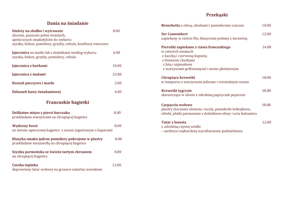 Przekąski Dania na śniadanie Omlety na słodko i wytrawnie złociste, puszyste pełne świeżych, apetycznych smakołyków do wyboru: szynka, bekon, pomidory, grzyby, cebula, konfitury owocowe 8.00 Jajecznica na maśle lub z dodatkami według wyboru: szynka, bekon, grzyby, pomidory, cebula 6.00 Jajecznica z kurkami 10.00 Jajecznica z mulami 22.00 Koszyk pieczywa i masło 2.00 Dzbanek kawy śniadaniowej 4.00 Francuskie bagietki Delikatne mięso z piersi kurczaka przekładane warzywami na chrupiącej bagietce 8.00 Wędzony łosoś 8.00 na świeżo upieczonej bagietce z sosem jogurtowym z kaparami Klasyka smaku jędrne pomidory pokrojone w plastry przekładane mozzarellą na chrupiącej bagietce 8.00 Szynka parmeńska ze świeżo tartym chrzanem na chrupiącej bagietce 8.00 Czeska topinka doprawiony tatar wołowy na grzance natartej czosnkiem 12.00 Bruschetta z oliwą, oliwkami i pomidorami concase 10.00 Ser Camembert zapiekany w cieście filo, klasycznie podany z żurawiną 12.00 Pierożki zapiekane z ciasta francuskiego w czterech smakach z kaczką i czerwoną kapustą z łososiem i kurkami z fetą i szpinakiem z warzywami grillowanymi i serem pleśniowym 14.00 Chrupiące krewetki w tempurze z warzywami julienne i orientalnym sosem 18.00 Krewetki tygrysie skwierczące w oliwie z odrobiną papryczek peperoni 18.00 Carpaccio wołowe plastry starannie ułożone, rucola, pomidorki koktajlowe, oliwki, płatki parmezanu z dodatkiem oliwy i octu balsamico 18.00 Tatar z łososia z odrobiną czystej wódki – zachwyci najbardziej wyrafinowane podniebienia 12.00 Sałatki Lunch serwowany od poniedziałku do piątku Zupy Sałatka z grillowanymi piersiami z kurczaka 14.00 (wcześniej marynowanymi) pomidory, świeże ogórki, sałata w kilku gatunkach, oliwki, sos jogurtowy Francuska zupa cebulowa na bazie bulionu i białego wina z płatkami cebuli Sałatka z grillowanymi polędwiczkami z kaczki 14.00 eleganckie winogrona podsmażane na oliwie, aromatyczne truskawki, kompozycja sałat i szlachetne uzupełnienie owocowej nuty w postaci sosu żurawinowego Tradycyjny polski żurek Sałatka grecka – wspomnienie wakacji 14.00 oryginalna grecka feta, dorodne pomidory, ogórki świeże, sałata lodowa, zioła, oliwa z oliwek, sok cytrynowy Sałatka z szynką parmeńską i melonem różnorodność sałat z winegretem 14.00 Sałatka z sandaczem w tempurze roszponka, rukola, rzodkiewki, figi zamarynowane w occie balsamico, cytryna 14.00 Miks sałat z owocami liczi nadziewanymi kozim serem pomidory, zielone szparagi i sos pesto 14.00 Pachnący rosół z bażanta z lanymi kluseczkami Chłodnik z jajkiem Dania główne Sznycle z kurczaka w sosie z kurkami z młodymi ziemniakami i buraczkami z imbirem Pierś z kurczaka z sosem z gorgonzolą podawana z pure ziemniaczanym i warzywami na ciepło Polędwiczki wieprzowe przekładane plastrami pomidora i mozzareli podawane z kluskami przesmażonymi ze szpinakiem i czosnkiem Zraz wołowy z kluskami francuskimi i buraczkami Gołąbki z młodej kapusty z sosem pomidorowym Makaron z kurczakiem podsmażony na oliwie z dodatkiem kurczaka, ziół, suszonych pomidorów , czarnych i zielonych oliwek Makaron carbonara z wędzonym boczkiem i pietruszką Makaron z sandaczem gotowanym na parze w kremowym sosie z rukolą Risotto z kurczakiem i borowikami w śmietanie parmezanem i sałatką Deser Słodka niespodzianka 25.00zł ( wybrana zupa, danie główne, deser i woda mineralna) Lody Korowód słodkości Torty i ciasta do wyboru z naszej wystawy 6.00 Suflet czekoladowy z gałką loda i sosem wiśniowym z dodatkiem imbiru - zaspokoi jeden apetyt i … pobudzi drugi 15.00 Jabłko zapiekane w cieście francuskim z gałką loda i sosem waniliowym 12.00 Gorący jabłecznik z puszystym sosem waniliowym bitym na parze z dużą ilością żółtek 10.00 Jabłecznik z gałką loda waniliowego i kleksem bitej śmietany 12.00 Aromatyczny jabłecznik z sosem waniliowym i gałką loda 13.00 Sernik z gorącą konfiturą z wiśni lub jagód Sernik z gałką loda orzechowego i kleksem bitej śmietany 12.00 Trzy gałki lodów waniliowych z gorącymi malinami 10.00 Lody czekoladowe - trzy gałki z gorącymi wiśniami 10.00 Pucharek gorących malin z płynną czekoladą i zmrożoną gałką lodów waniliowych 10.00 Lód czekoladowy zapieczony w aksamitnej piance z białek ubitych na sztywno i gorące wiśnie w połyskującym syropie 10.00 Gałka lodów waniliowych z gorącym kajmakiem 10.00 Sorbet truskawkowy z jogurtem naturalnym 10.00 Sorbet cytrynowy z szampanem 15.00 12.00 12.00 Sernik powolnie stygnący - sam na sam po prostu 6.00 Jabłecznik na ciepło 6.00 Selekcja trzech deserów na jednym talerzu (Suflet czekoladowy, Créme brûlé i Eton mess) Gałka loda winogronowego z wyszukanymi owocami 15.00 Fondue czekoladowe z owocami, pełne rozkoszy Desery 15.00 Créme brûlé ze świeżo mielonym pieprzem 10.00 Eton mess – tradycyjny angielski deser ten misz – masz stanowią pokruszone bezy, bita śmietana i świeże owoce w kawałkach 10.00 Egzotyczne owoce z całego świata polane śnieżnobiałym jogurtem naturalnym i odrobiną złotego miodu dla osłody 15.00 Złocisty naleśnik - pełen świeżych owoców zapieczony pod puszystym sosem waniliowym, podajemy z gałką loda 10.00 Napoje zimne Świeżo mielona kawa, parzona na wiele sposobów Soki owocowe 200ml 3.00 Caffe creme, filiżanka kawy ciśnieniowej z cremą 5.00 Soki wyciskane z pomarańczy i grejpfrutów 200ml 10.00 Espresso 5.00 Sok pomidorowy 200ml 5.00 Cappuccino 5.00 Pepsi, Mirinda, 7up, Tonic 200ml 3.00 Woda niegazowana 200ml 3.00 Cappuccino con panna 7.00 fantazyjny na podwójnym espresso z dodatkiem bitej śmietany Woda Ostromecko gazowana/niegazowana 300/700ml 4.00/8.00 Mocha z czekoladą 6.00 duża kawa, w której smak espresso miesza się z posmakiem czekolady Piwo Pilsner Latte Machiato 5.00 warstwowa kawa na bazie espresso z delikatną mleczną pianą Latte Machiato z syropem do wyboru: czekoladowym, karmelowym lub a
