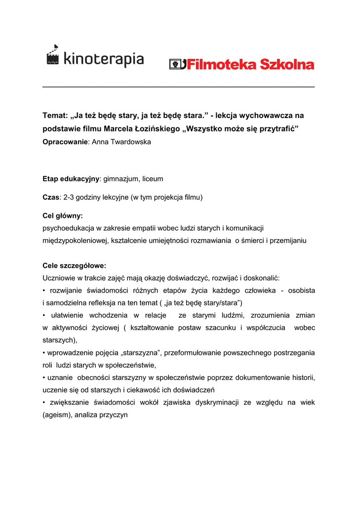 __________________________________________________________________________ Temat: „Ja też będę stary, ja też będę stara.” - lekcja wychowawcza na podstawie filmu Marcela Łozińskiego „Wszystko może się przytrafić” Opracowanie: Anna Twardowska Etap edukacyjny: gimnazjum, liceum Czas: 2-3 godziny lekcyjne (w tym projekcja filmu) Cel główny: psychoedukacja w zakresie empatii wobec ludzi starych i komunikacji międzypokoleniowej, kształcenie umiejętności rozmawiania o śmierci i przemijaniu Cele szczegółowe: Uczniowie w trakcie zajęć mają okazję doświadczyć, rozwijać i doskonalić: • rozwijanie świadomości różnych etapów życia każdego człowieka - osobista i samodzielna refleksja na ten temat ( „ja też będę stary/stara”) • ułatwienie wchodzenia w relacje ze starymi ludźmi, zrozumienia zmian w aktywności życiowej ( kształtowanie postaw szacunku i współczucia wobec starszych), • wprowadzenie pojęcia „starszyzna”, przeformułowanie powszechnego postrzegania roli ludzi starych w społeczeństwie, • uznanie obecności starszyzny w społeczeństwie poprzez dokumentowanie historii, uczenie się od starszych i ciekawość ich doświadczeń • zwiększanie świadomości wokół zjawiska dyskryminacji ze względu na wiek (ageism), analiza przyczyn Metody pracy: • ankieta • dyskusja • odgrywanie ról • wywiad • rysunek/grafika • przygotowanie wystawy pod hasłem „Ja też będę stary/stara”(zdjęcia, rysunki, opowieści, komiksy, plakaty) Środki dydaktyczne: • film „Wszystko się może przytrafić” Marcela Łozińskiego, 40’(Filmoteka Szkolna, pakiet nr 8) • ankieta dotycząca stosunku do starości i osób starszych oraz śmierci (załącznik) • artykuły pomocne w dyskusji o starości (załącznik) • kartki, brystol, zdjęcia, kredki, mazaki • materiały potrzebne do podstawowej charakteryzacji na osobę starą Pojęcia kluczowe: starość, śmierć, przemijanie, starszyzna, ageism - dyskryminacja ze względu na wiek Przebieg zajęć: Pierwsza godzina lekcyjna Obejrzyjcie wspólnie film i zaproponuj uczniom wypełnienie poniższej ankiety: ANKIETA (do przeprowadzenia tuż po projekcji) Dokończ zdania: A. Starość zaczyna się, gdy… B. Być starym to znaczy dla mnie… C. W starości najbardziej boję się… D. Starość jest… E. Stary człowiek jest … F. Kiedy widzę starego człowieka, to czuję… G. Kiedy sam/sama będę stara, to chciałbym/chciałabym… Zebrane ankiety pozostają u nauczyciela jako materiał do dyskusji na następnej lekcji. WYWIAD (praca domowa po projekcji) Zrób krótki wywiad z dziadkami lub starszymi osobami, które znasz koncentrując się na ich obecnym życiu. Zadaj podobne pytania, jak mały Tomasz w filmie (max.3 pytania). Ewentualnie, jeśli nie znajdziesz takich osób w swoim otoczeniu, znajdź przedmiot – pamiątkę, zdjęcie, związane z kontaktem z osobą starszą i opisz krótko relację, która was łączyła. Druga godzina lekcyjna Omówienie ankiet. Uczniowie dzielą się refleksjami na forum klasy. Nauczyciel podsumowuje te opowieści. Potem proponuje uczniom ćwiczenia. ĆWICZENIE „Ja też będę stary” - ODGRYWANIE RÓL Ćwiczenie to składa się z trzech części i służy praktyce empatii - wczuwania się w sytuację, emocje drugiej osoby. 1. Uczniowie będą potrzebowali kartki do notowania. Mają za zadanie „wejść w rolę” starego człowieka. „Wyobraź sobie siebie jako starą osobę, siedzącą na ławce w parku. Za Tobą całe życie, zbliżasz się do jego końca. Jak będziesz wyglądać? Jakie będzie Twoje zdrowie? Jak będziesz żyć? W jakich warunkach? Z czego? Jakie będą Twoje relacje rodzinne i społeczne? Jak będą traktować cię młodzi ludzie? Co będziesz robić? Co wpłynie na to, że będziesz zadowolony z życia ( lub nie)? Co chciałbyś, żeby po Tobie zostało? Co myślisz o śmierci? Czy się boisz? Zapisz wrażenia.” 2. Uczniowie podzieleni na kilkuosobowe grupy, będą potrzebowali materiały do charakteryzacji. Ucharakteryzuj się na starą osobę. Odegraj scenkę na forum klasy jako staruszek/staruszka opowiadając o tym, kim jesteś teraz. Używaj czasu przeszłego, np. byłam kiedyś, kochane wnuczęta, w liceum… Przekaż słuchającym refleksje na temat życia, śmierci. Pozostałe osoby zadają pytania takie, jak te padające w filmie Marcela Łozińskiego. 3. Uczniowie będą potrzebowali kredki, papier i prywatne zdjęcia do wykonania pracy pt. „Ja też będę stary.” Weź karton i pisakami zaznacz na nim symbolicznie linię swojego życia. Na jej początku wklej swoje zdjęcie z czasu niemowlęcego, potem wklej obecne a na końcu narysuj siebie jako staruszka/staruszkę. Trzecia godzina lekcyjna DYSKUSJA i refleksje na temat dotychczasowych prac i ćwiczeń. Uczniowie odpowiadają na pytanie: Czy i jak zmienił się ich stosunek do starych ludzi, do własnej starości? Jako podsumowanie zajęć rozwijających empatię wobec osób starych, można zaproponować uczniom wykonanie wystawy szkolnej z wykorzystaniem materiałów uzyskanych podczas lekcji . WYSTAWA ” Ja też będę stary/a.” Omówienie scenariusza i wstępne przygotowywanie wystawy Elementy wystawy: • zdjęcia z dziadkami - wywiady i opowieści na ich temat • zdjęcia znanych osób, które mimo podeszłego wieku cały czas są aktywne (aktorzy, pisarze, reżyserzy, naukowcy) plus informacje o nich • prace pt. „Ja też będę stary/stara.” • fotoreportaż z odgrywanych na zajęciach scenek • ankiety o starości i ich opracowanie • plakat/konkurs: hasło anty-dyskryminacyjne • artykuł o dyskryminacji ze względu na wiek • artykuł o starzeniu się społeczeństw i rozwijającej się dziedzinie nauki jaką jest gerontologia • inne Bibliografia Stephen Levine, 1997, „Kto umiera. Sztuka świadomego życia i świadomego umierania”, Wydawnictwo Szafa Stephen Levine, 1997, „Gdybyś miał przed sobą rok 