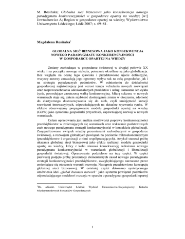 M. Rosińska; Globalna sieć biznesowa jako konsekwencja nowego paradygmatu konkurencyjności w gospodarce opartej na wiedzy; [w:] Jewtuchowicz A; Region w gospodarce opartej na wiedzy; Wydawnictwo Uniwersytetu Łódzkiego; Łódź 2007; s. 69–81. Magdalena Rosińska1 GLOBALNA SIEĆ BIZNESOWA JAKO KONSEKWENCJA NOWEGO PARADYGMATU KONKURENCYJNOŚCI W GOSPODARCE OPARTEJ NA WIEDZY Zmiany zachodzące w gospodarce światowej w drugiej połowie XX wieku i na początku nowego stulecia, potocznie określane są jako globalizacja. Bez względu na ocenę tego zjawiska i przedstawione ujecie definicyjne, wszyscy autorzy zauważają jego ogromny wpływ tak na całą gospodarkę, jak i na strategie pojedynczych podmiotów. W odniesieniu do działalności gospodarczej najistotniejszy jest wzrost tempa wdrażania nowych rozwiązań oraz rozpowszechniania udoskonalonych produktów i usług, skracanie ich cyklu życia, powodujące zaostrzoną walkę konkurencyjną. Miarą sukcesu w nowych warunkach staje się, zatem szybkość dostrzegania zmian w otoczeniu, zdolność do elastycznego dostosowywania się do nich, czyli umiejętność kreacji rozwiązań innowacyjnych, odpowiadających na aktualne wyzwania rynku. W efekcie obserwujemy propagowanie modelu gospodarki opartej na wiedzy (GOW) jako synonimu gospodarki przyszłości, zapewniającej rozwój w nowych warunkach. Celem opracowania jest analiza możliwości poprawy konkurencyjności przedsiębiorstw w zmieniających się warunkach oraz wskazanie podstawowych cech nowego paradygmatu strategii konkurencyjności w kontekście globalizacji. Zasygnalizowano związek między przemianami zachodzącymi w gospodarce światowej, a rozwojem globalnych powiązań na poziomie mikroekonomicznym (przedsiębiorstw i organizacji z nimi współpracujących). Artykuł stanowi próbę ukazania globalnej sieci biznesowej jako efektu realizacji modelu gospodarki opartej na wiedzy, który z kolei stanowi konsekwencję wdrażania nowego paradygmatu konkurencyjności w warunkach globalizacji i liberalizacji gospodarki światowej. Opracowanie podzielono na trzy części. W części pierwszej podjęto próbę prezentacji elementarnych zasad nowego paradygmatu strategii konkurencyjności przedsiębiorstw, uwzględniającego narzucone przez zmieniające się otoczenie warunki rozwoju. Następnie przedstawiono koncepcję globalnej sieci biznesowej. W ostatniej części dokonano syntetycznego omówienia idei „global business network” jako systemu powiązań podmiotów odpowiadającego modelowi rozwoju w oparciu o paradygmat gospodarki opartej 1 Dr, adiunkt, Uniwersytet Łódzki; Wydział Międzynarodowych Stosunków Gospodarczych 1 Ekonomiczno-Socjologiczny; Katedra M. Rosińska; Globalna sieć biznesowa jako konsekwencja nowego paradygmatu konkurencyjności w gospodarce opartej na wiedzy; [w:] Jewtuchowicz A; Region w gospodarce opartej na wiedzy; Wydawnictwo Uniwersytetu Łódzkiego; Łódź 2007; s. 69–81. na wiedzy (GOW), odwołując się do koncepcji organizacji „uczącej się” i organizacji „inteligentnej”. Nowy paradygmat konkurencyjności przedsiębiorstw w warunkach globalizacji Dynamiczne zmiany zachodzące we współczesnej gospodarce światowej, określane mianem globalizacji, skłaniają do zastanowienia się nad podstawowymi wyznacznikami strategii rozwoju w nowych warunkach. W najprostszym ujęciu globalizacja to internacjonalizacja życia gospodarczego, połączona z dynamicznym rozwojem sił wytwórczych2, czyli proces zwiększania dynamiki międzynarodowych przepływów gospodarczych i w efekcie wzrostu zależności państw i rynków, w wyniku pogłębienia i zagęszczenia sieci współzależności3. Należy jednak zawrócić uwagę na odmienność tego zjawiska od dotychczasowego procesu liberalizacji, która tkwi w równoczesnych zmianach jakościowych w sferze podmiotowej i przedmiotowej międzynarodowych stosunków ekonomicznych oraz rewolucyjnych wręcz zmianach technologicznych (stymulujących te pierwsze). „Przełom technologiczny w tej skali nie byłby możliwy bez wsparcia ze strony polityki liberalizmu, w tym prywatyzacji i deregulacji, sprzyjających międzynarodowej ekspansji produkcji w skali globalnej. Ważną cechą jest zacieranie się różnic miedzy handlem, a inwestycjami jako alternatywnymi środkami podboju rynków, tworzące komplementarność nowego typu, która wzmacnia gospodarczą współzależność4”. W nowo ukształtowanych warunkach otoczenia zewnętrznego, podmioty gospodarcze muszą, zatem wypracować nowe metody uzyskania przewagi konkurencyjnej, a następnie utrzymania korzystnej pozycji rynkowej. Najważniejszym czynnikiem wzrostu staje się, bowiem informacja. Współczesny model gospodarczy to kapitałochłonna gospodarka oparta na wiedzy. Motorem rozwoju są innowacje i nowoczesna technologia, a zatem wysoko kwalifikowana siła robocza i kapitał, potrzebny do realizacji śmiałych pomysłów. Tradycyjne czynniki wytwórcze jak ziemia i zasoby naturalne tracą natomiast na znaczeniu. 2 Piasecki R., Nowe paradygmaty rozwoju w kontekście globalizacji, Sprawy Międzynarodowe nr 1/2000, s. 111. 3 Koehane R.O; Nye Jr. J.S., Globalization: What’s New? What’s Not? (And So What?), Foreign Policy Spring 2000, s.112. 4 Bielawski J., Wpływ globalizacji na wielostronną współpracę gospodarczą; Sprawy Międzynarodowe 1/2000, s. 33. 2 M. Rosińska; Globalna sieć biznesowa jako konsekwencja nowego paradygmatu konkurencyjności w gospodarce opartej na wiedzy; [w:] Jewtuchowicz A; Region w gospodarce opartej na wiedzy; Wydawnictwo Uniwersytetu Łódzkiego; Łódź 2007; s. 69–81. Wydaje się zatem, iż w dobie globalizacji za podstawowe przesłanki stabilnego, długookresowego rozwoju przedsiębiorstw należy uznać: konkurowanie wartością dodaną do standardu; czyli standaryzację podstawowych warunków jako ustalenie pewnych norm minimalnych, dopuszczających dane dobro do obrotu międzynarodowego; zatem k