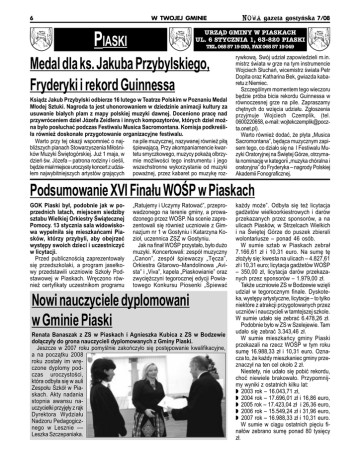 6 W TWOJEJ GMINIE PIASKI NOWA gazeta gostyñska 7/08 URZ¥D GMINY W PIASKACH UL. 6 STYCZNIA 1, 63-820 PIASKI TEL. 065 57 19 030, FAX 065 57 19 049 Medal dla ks. Jakuba Przybylskiego, Fryderyki i rekord Guinnessa Ksi¹dz Jakub Przybylski odbierze 16 lutego w Teatrze Polskim w Poznaniu Medal M³odej Sztuki. Nagroda ta jest uhonorowaniem w dziedzinie animacji kultury za usuwanie bia³ych plam z mapy polskiej muzyki dawnej. Doceniono pracê nad przywróceniem dzie³ Józefa Zeidlera i innych kompozytorów, których dzie³ mo¿na by³o pos³uchaæ podczas Festiwalu Musica Sacromontana. Komisja podkreli³a równie¿ doskona³e przygotowanie organizacyjne festiwalu. Warto przy tej okazji wspomnieæ o naj- na pile muzycznej, nazywanej równie¿ pi³¹ bli¿szych planach Stowarzyszenia Mi³oni- piewaj¹c¹. Przy akompaniamencie kwarków Muzyki wiêtogórskiej. Ju¿ 1 maja, w tetu smyczkowego, muzycy poka¿¹ olbrzydzieñ w. Józefa patrona rodziny i cieli, mie mo¿liwoci tego instrumentu i jego bêdzie mia³ miejsce uroczysty koncert z udzia- wszechstronne wykorzystanie od muzyki ³em najwybitniejszych artystów graj¹cych powa¿nej, przez kabaret po muzykê roz- rywkow¹. Swój udzia³ zapowiedzieli m.in. mistrz wiata w grze na tym instrumencie Wojciech S³uchañ, wicemistrz wiata Petr Dopita oraz Katharina Bek, gwiazda kabaretu z Niemiec. Szczególnym momentem tego wieczoru bêdzie próba bicia rekordu Guinnessa w równoczesnej grze na pile. Zapraszamy chêtnych do wziêcia udzia³u. Zg³oszenia przyjmuje Wojciech Czemplik, (tel. 0600220658, e-mail: [email protected]). Warto równie¿ dodaæ, ¿e p³yta Musica Sacromontana, bêd¹ca muzycznym zapisem tego, co dzia³o siê na I Festiwalu Muzyki Oratoryjnej na wiêtej Górze, otrzyma³a nominacjê w kategorii muzyka chóralna i oratoryjna do Fryderyka nagrody Polskiej Akademii Fonograficznej. Podsumowanie XVI Fina³u WOP w Piaskach GOK Piaski by³, podobnie jak w poprzednich latach, miejscem siedziby sztabu Wielkiej Orkiestry wi¹tecznej Pomocy. 13 stycznia sala widowiskowa wype³ni³a siê mieszkañcami Piasków, którzy przybyli, aby obejrzeæ wystêpy swoich dzieci i uczestniczyæ w licytacji. Przed publicznoci¹ zaprezentowa³y siê przedszkolaki, a program jase³kowy przedstawili uczniowie Szko³y Podstawowej w Piaskach. Wrêczono równie¿ certyfikaty uczestnikom programu Ratujemy i Uczymy Ratowaæ, przeprowadzonego na terenie gminy, a prowadzonego przez WOP. Na scenie zaprezentowali siê równie¿ uczniowie z Gimnazjum nr 1 w Gostyniu i Katarzyna Kozio³, uczennica ZSZ w Gostyniu. Jak na fina³ WOP przysta³o, by³o du¿o muzyki. Koncertowali: zespó³ muzyczny Canon, zespó³ piewaczy Têcza, Orkiestra GitarowoMandolinowa Avista i Viva, kapela Piaskowianie oraz zwyciê¿czyni tegorocznej edycji Powiatowego Konkursu Piosenki piewaæ Nowi nauczyciele dyplomowani w Gminie Piaski Renata Banaszak z ZS w Piaskach i Agnieszka Kubica z ZS w Bodzewie do³¹czy³y do grona nauczycieli dyplomowanych z Gminy Piaski. Jeszcze w 2007 roku pomylnie zakoñczy³o siê postêpowanie kwalifikacyjne, a na pocz¹tku 2008 roku zosta³y im wrêczone dyplomy podczas uroczystoci, która odby³a siê w auli Zespo³u Szkó³ w Piaskach. Akty nadania stopnia awansu nauczycielki przyjê³y z r¹k Dyrektora Wydzia³u Nadzoru Pedagogicznego w Lesznie Leszka Szczepaniaka. ka¿dy mo¿e. Odby³a siê te¿ licytacja gad¿etów wielkoorkiestrowych i darów przekazanych przez sponsorów, a na ulicach Piasków, w Strzelcach Wielkich i na wiêtej Górze do puszek zbierali wolontariusze ponad 46 osób. W sumie sztab w Piaskach zebra³ 7.166,61 z³ i 10,31 euro. Na sumê tê z³o¿y³y siê: kwesta na ulicach 4.827,61 z³ i 10,31 euro; licytacja gad¿etów WOP 350,00 z³, licytacja darów przekazanych przez sponsorów 1.979,00 z³. Tak¿e uczniowie ZS w Bodzewie wziêli udzia³ w tegorocznym finale. Dyskoteka, wystêpy artystyczne, licytacje to tylko niektóre z atrakcji przygotowanych przez uczniów i nauczycieli w tamtejszej szkole. W sumie uda³o siê zebraæ 6.478,26 z³. Podobnie by³o w ZS w Szelejewie. Tam uda³o siê zebraæ 3.343,46 z³. W sumie mieszkañcy gminy Piaski przekazali na rzecz WOP w tym roku sumê 16.988,33 z³ i 10,31 euro. Oznacza to, ¿e ka¿dy mieszkaniec gminy przeznaczy³ na ten cel oko³o 2 z³. Niestety, nie uda³o siê pobiæ rekordu, choæ niewiele brakowa³o. Przypomnijmy wyniki z ostatnich kilku lat: w 2003 rok 16.043,71 z³, w 2004 rok 17.696,01 z³ i 16,86 euro, w 2005 rok 17.423,04 z³ i 26,36 euro, w 2006 rok 15.549,24 z³ i 31,96 euro, w 2007 rok 16.988,33 z³ i 10,31 euro. W sumie w ci¹gu ostatnich piêciu fina³ów zebrano sumê ponad 80 tysiêcy z³.