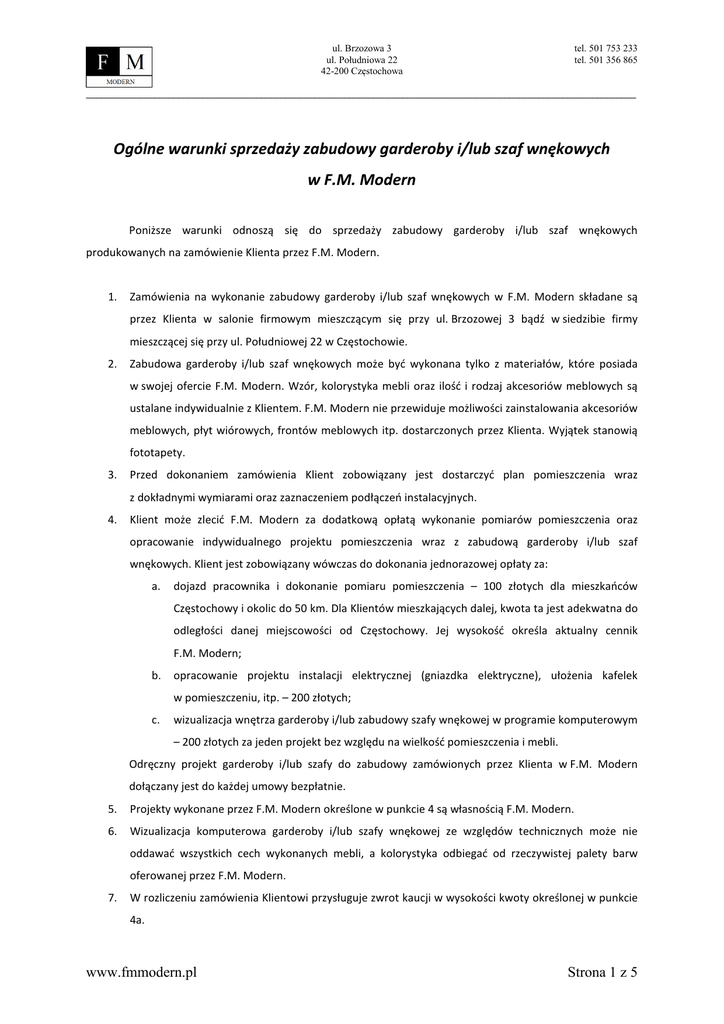 ul. Brzozowa 3 ul. Południowa 22 42-200 Częstochowa tel. 501 753 233 tel. 501 356 865 _________________________________________________________________________________________________________________ Ogólne warunki sprzedaży zabudowy garderoby i/lub szaf wnękowych w F.M. Modern Poniższe warunki odnoszą się do sprzedaży zabudowy garderoby i/lub szaf wnękowych produkowanych na zamówienie Klienta przez F.M. Modern. 1. Zamówienia na wykonanie zabudowy garderoby i/lub szaf wnękowych w F.M. Modern składane są przez Klienta w salonie firmowym mieszczącym się przy ul. Brzozowej 3 bądź w siedzibie firmy mieszczącej się przy ul. Południowej 22 w Częstochowie. 2. Zabudowa garderoby i/lub szaf wnękowych może być wykonana tylko z materiałów, które posiada w swojej ofercie F.M. Modern. Wzór, kolorystyka mebli oraz ilość i rodzaj akcesoriów meblowych są ustalane indywidualnie z Klientem. F.M. Modern nie przewiduje możliwości zainstalowania akcesoriów meblowych, płyt wiórowych, frontów meblowych itp. dostarczonych przez Klienta. Wyjątek stanowią fototapety. 3. Przed dokonaniem zamówienia Klient zobowiązany jest dostarczyć plan pomieszczenia wraz z dokładnymi wymiarami oraz zaznaczeniem podłączeń instalacyjnych. 4. Klient może zlecić F.M. Modern za dodatkową opłatą wykonanie pomiarów pomieszczenia oraz opracowanie indywidualnego projektu pomieszczenia wraz z zabudową garderoby i/lub szaf wnękowych. Klient jest zobowiązany wówczas do dokonania jednorazowej opłaty za: a. dojazd pracownika i dokonanie pomiaru pomieszczenia – 100 złotych dla mieszkańców Częstochowy i okolic do 50 km. Dla Klientów mieszkających dalej, kwota ta jest adekwatna do odległości danej miejscowości od Częstochowy. Jej wysokość określa aktualny cennik F.M. Modern; b. opracowanie projektu instalacji elektrycznej (gniazdka elektryczne), ułożenia kafelek w pomieszczeniu, itp. – 200 złotych; c. wizualizacja wnętrza garderoby i/lub zabudowy szafy wnękowej w programie komputerowym – 200 złotych za jeden projekt bez względu na wielkość pomieszczenia i mebli. Odręczny projekt garderoby i/lub szafy do zabudowy zamówionych przez Klienta w F.M. Modern dołączany jest do każdej umowy bezpłatnie. 5. Projekty wykonane przez F.M. Modern określone w punkcie 4 są własnością F.M. Modern. 6. Wizualizacja komputerowa garderoby i/lub szafy wnękowej ze względów technicznych może nie oddawać wszystkich cech wykonanych mebli, a kolorystyka odbiegać od rzeczywistej palety barw oferowanej przez F.M. Modern. 7. W rozliczeniu zamówienia Klientowi przysługuje zwrot kaucji w wysokości kwoty określonej w punkcie 4a. www.fmmodern.pl Strona 1 z 5 ul. Brzozowa 3 ul. Południowa 22 42-200 Częstochowa tel. 501 753 233 tel. 501 356 865 _________________________________________________________________________________________________________________ 8. F.M. Modern nie ponosi odpowiedzialności za wady powstałe w przypadku realizacji zabudowy garderoby i/lub szafy wnękowej w oparciu o projekt, wymiar i koncepcję przedstawione przez Klienta. 9. Zawarcie umowy sprzedaży pomiędzy Klientem a F.M. Modern następuje z chwilą podpisania umowy. 10. Podpisu na dokumencie zawierającym plan pomieszczenia, jego wymiary i koncepcję zabudowy w przypadku określonym w punkcie 3 dokonuje Klient, zaś w przypadku określonym w punkcie 4 dokonuje Klient i przedstawiciel F.M. Modern. 11. Warunkiem zawarcia umowy pomiędzy Klientem a F.M. Modern jest dokonanie przez Klienta w momencie podpisania umowy wpłaty zaliczki na wykonanie mebli w wysokości 40% ceny końcowej zabudowy garderoby i/lub szafy wnękowej znajdującej się na umowie. 12. Druk zamówienia określa wzór i kolorystykę mebli, materiały z jakich zostaną one wykonane oraz wyszczególnia ilość i rodzaj akcesoriów meblowych. 13. Cena podana przez przedstawiciela F.M. Modern przy wycenie mebli jest wartością orientacyjną. Może ona ulec zmianie na plus lub minus w zależności od wyboru materiałów i akcesoriów meblowych przez Klienta. 14. Obowiązuje cena z dnia zawarcia umowy pomiędzy Klientem a F.M. Modern. 15. Wszelkie zmiany dokonane przez Klienta w umowie i zamówieniu wymagają formy pisemnej. Zmiana koloru frontów i korpusów może nastąpić tylko do momentu, w którym F.M. Modern nie rozpoczęło kompletowania materiałów do zrealizowania zamówienia. Termin ten w zależności od daty wykonania mebli jest różny. 16. Wszystkie zmiany dokonane przez Klienta po podpisaniu umowy i ustaleniu końcowego wymiaru i wyglądu zabudowy garderoby i/lub szafy wnękowej, a wpływające na cenę mebli są dodatkowo płatne zgodnie z aktualnym cennikiem. 17. Umowa zostaje sporządzona w dwóch jednakowo brzmiących egzemplarzach, po jednej dla Klienta i F.M. Modern. 18. Punkt 19 obowiązuje przy terminie realizacji mebli kuchennych powyżej czterech tygodni od daty zawarcia umowy pomiędzy Klientem a F.M. Modern. 19. F.M. Modern w sytuacji, gdy Klient odstąpił od umowy, ma prawo zażądać wynagrodzenia za poczynione przygotowania do realizacji zamówienia. W przypadku rezygnacji z zamówienia, F.M. Modern będzie pobierała opłaty w następującej wysokości: a. 0% - gdy rezygnacja zostanie zgłoszona do 3 dni od momentu zawarcia umowy pomiędzy Klientem a F.M. Modern. Opłata określona w punkcie 4a nie podlega zwrotowi, b. 50% wpłaconej zaliczki – gdy rezygnacja zostanie zgłoszona pomiędzy 4 a 7 dniem od momentu zawarcia umowy pomiędzy Klientem a F.M. Modern, c. 100% wpłaconej zaliczki – gdy rezygnacja zostanie zgłoszona pomiędzy 8 a 12 dniem od momentu zawarcia umowy. Odstąpienie od umowy po upływie dwunastu dni od momentu zawarcia umowy pomiędzy Klientem a F.M. Modern jest niemożliwe. www.fmmodern.pl Strona 2 z 5 ul. Brzozowa 3 ul. Południowa 22 42-200 Częstochowa tel. 501 753 233 tel. 501 356 865 ______________________________________________________________________________________