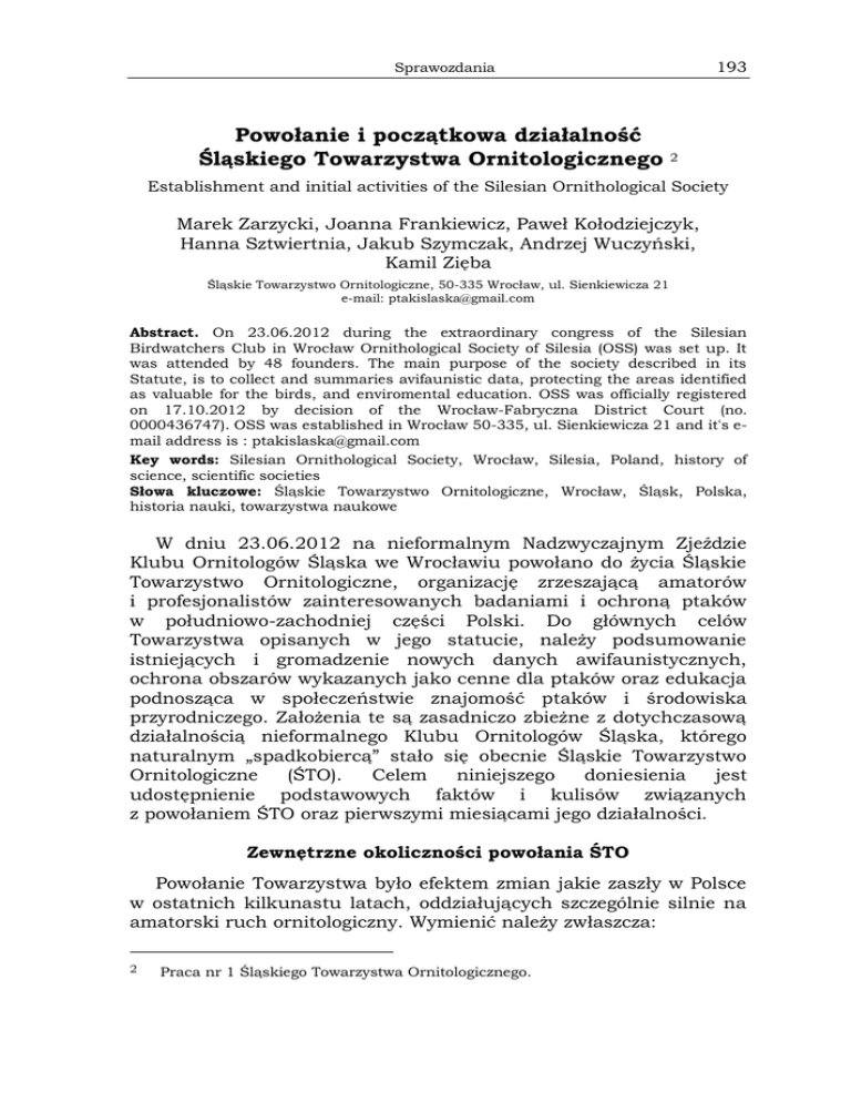 193 Sprawozdania Powołanie i początkowa działalność Śląskiego Towarzystwa Ornitologicznego 2 Establishment and initial activities of the Silesian Ornithological Society Marek Zarzycki, Joanna Frankiewicz, Paweł Kołodziejczyk, Hanna Sztwiertnia, Jakub Szymczak, Andrzej Wuczyński, Kamil Zięba Śląskie Towarzystwo Ornitologiczne, 50-335 Wrocław, ul. Sienkiewicza 21 e-mail: [email protected] Abstract. On 23.06.2012 during the extraordinary congress of the Silesian Birdwatchers Club in Wrocław Ornithological Society of Silesia (OSS) was set up. It was attended by 48 founders. The main purpose of the society described in its Statute, is to collect and summaries avifaunistic data, protecting the areas identified as valuable for the birds, and enviromental education. OSS was officially registered on 17.10.2012 by decision of the Wrocław-Fabryczna District Court (no. 0000436747). OSS was established in Wrocław 50-335, ul. Sienkiewicza 21 and it's email address is : [email protected] Key words: Silesian Ornithological Society, Wrocław, Silesia, Poland, history of science, scientific societies Słowa kluczowe: Śląskie Towarzystwo Ornitologiczne, Wrocław, Śląsk, Polska, historia nauki, towarzystwa naukowe W dniu 23.06.2012 na nieformalnym Nadzwyczajnym Zjeździe Klubu Ornitologów Śląska we Wrocławiu powołano do życia Śląskie Towarzystwo Ornitologiczne, organizację zrzeszającą amatorów i profesjonalistów zainteresowanych badaniami i ochroną ptaków w południowo-zachodniej części Polski. Do głównych celów Towarzystwa opisanych w jego statucie, należy podsumowanie istniejących i gromadzenie nowych danych awifaunistycznych, ochrona obszarów wykazanych jako cenne dla ptaków oraz edukacja podnosząca w społeczeństwie znajomość ptaków i środowiska przyrodniczego. Założenia te są zasadniczo zbieżne z dotychczasową działalnością nieformalnego Klubu Ornitologów Śląska, którego naturalnym „spadkobiercą” stało się obecnie Śląskie Towarzystwo Ornitologiczne (ŚTO). Celem niniejszego doniesienia jest udostępnienie podstawowych faktów i kulisów związanych z powołaniem ŚTO oraz pierwszymi miesiącami jego działalności. Zewnętrzne okoliczności powołania ŚTO Powołanie Towarzystwa było efektem zmian jakie zaszły w Polsce w ostatnich kilkunastu latach, oddziałujących szczególnie silnie na amatorski ruch ornitologiczny. Wymienić należy zwłaszcza: 2 Praca nr 1 Śląskiego Towarzystwa Ornitologicznego. 194 Sprawozdania a) osłabienie koordynacji ruchu amatorskiego prowadzonej dotąd przez ośrodki naukowe, ze względu na wzrastające wymagania wobec pracowników akademickich, b) pojawienie się licznych programów monitoringowych związanych m.in. z wymogami raportowymi Unii Europejskiej, sterowanych nadrzędnie i mających wymiar ponadregionalny, c) niespodziewane skomercjalizowanie i wzrost ilości danych przyrodniczych (o nieznanej, a często wątpliwej jakości!), gromadzonych pod kątem planowanych inwestycji gospodarczych, a równocześnie utajnianie danych i specyficzne ograniczenie wymiany informacji, bliższe chłodnej działalności zarobkowej niż amatorskiemu entuzjazmowi, d) wzrost wiedzy ornitologicznej, liczby obserwatorów ptaków oraz ułatwienie ich szerokiego komunikowania się dzięki powszechnym narzędziom internetowym. Wskutek tych procesów nastąpiło zauważalne rozproszenie organizacyjne obserwatorów ptaków na Śląsku, negatywnie wyróżniające ten region na tle niektórych innych, prężnie działających regionów ornitologicznych w Polsce. Wymownym przejawem tego rozproszenia było częściowe oddzielenie się obserwatorów z Górnego Śląska i powołanie w 2012 roku Górnośląskiego Koła Ornitologicznego jako niezależnego stowarzyszenia. Przygotowania do powołania Towarzystwa Utworzenie ŚTO poprzedzały też inne, specyficzne dla Śląska okoliczności. Dane gromadzone przez obserwatorów ptaków, zrzeszonych dotąd w Klubie Ornitologów Śląska (KOŚ) istniejącym od 1979 roku, były od lat opracowywane i udostępniane przez pracowników naukowych Zakładu Ekologii Ptaków Uniwersytetu Wrocławskiego (obecnie Zakład Ekologii Behawioralnej UWr., ZEB). Zmiany zachodzące w systemie polskiego szkolnictwa wyższego wywarły jednak dezintegrujący wpływ na utrzymanie dotychczasowej formuły współpracy ornitologów amatorów i zawodowców. Nałożył się na to znaczny postęp informatyczny i idące za nim oczekiwania co do bazy obserwacji dostępnej w formie elektronicznej. Wokół forum internetowego http://forum.przyroda.org skupiła się grupa współpracowników KOŚ, zainteresowana usprawnieniem funkcjonowania śląskiej ornitologii amatorskiej i nadaniem temu ruchowi nowej formuły organizacyjnej. Ważnym wydarzeniem było spotkanie tzw. grupy inicjatywnej w dniu 26.02.2012, składającej się z dziewięciu obserwatorów ptaków z terenu Dolnego Śląska (Paweł Kołodziejczyk – inicjator spotkania, Paweł Grochowski, Antoni Knychała, Tomasz Maszkało, Bartosz Smyk, Jakub Szymczak, Piotr Wasiak, Marek Zarzycki i Kamil Zięba). Na spotkaniu podjęto dwie decyzje: pierwszą Sprawozdania 195 o zorganizowaniu w roku 2012 akcji inwentaryzacyjnych integrujących obserwatorów ptaków na Śląsku. Do liczeń w okresie lęgowym wybrano dwie grupy ptaków: mewy i rybitwy (sprawdzenie regionalnej wielkości ich populacji w sezonie lęgowym 2012 i określenie trendów liczebności uwzględniając wcześniejsze inwentaryzacje), a także ptaki piaskowni (brzegówkę i żołnę), z założeniem prowadzenia ich liczeń przez dwa sezony lęgowe, 2012 i 2013. Druga decyzja wiązała się bezpośrednio z powołaniem ŚTO i dotyczyła usprawnienia działania Kartoteki Awifauny Śląska. Uznano, że może to nastąpić trzema drogami: a) poprzez utrzymanie obecnej formuły działania w ramach nieformalnego KOŚ, opartego na wolontariacie, bez możliwości pozyskiwania funduszy i zależnego od ZEB, b