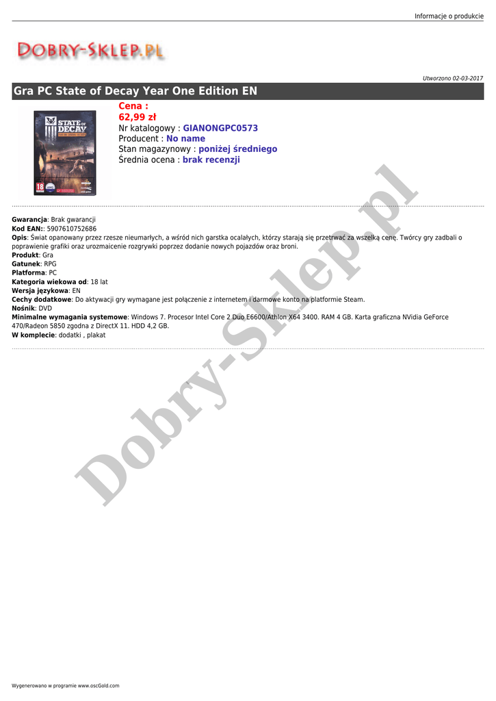Informacje o produkcie Utworzono 02-03-2017 Gra PC State of Decay Year One Edition EN Cena : 62,99 zł p. pl Nr katalogowy : GIANONGPC0573 Producent : No name Stan magazynowy : poniżej średniego Średnia ocena : brak recenzji D ob ry - Sk le Gwarancja: Brak gwarancji Kod EAN:: 5907610752686 Opis: Świat opanowany przez rzesze nieumarłych, a wśród nich garstka ocalałych, którzy starają się przetrwać za wszelką cenę. Twórcy gry zadbali o poprawienie grafiki oraz urozmaicenie rozgrywki poprzez dodanie nowych pojazdów oraz broni. Produkt: Gra Gatunek: RPG Platforma: PC Kategoria wiekowa od: 18 lat Wersja językowa: EN Cechy dodatkowe: Do aktywacji gry wymagane jest połączenie z internetem i darmowe konto na platformie Steam. Nośnik: DVD Minimalne wymagania systemowe: Windows 7. Procesor Intel Core 2 Duo E6600/Athlon X64 3400. RAM 4 GB. Karta graficzna NVidia GeForce 470/Radeon 5850 zgodna z DirectX 11. HDD 4,2 GB. W komplecie: dodatki , plakat Wygenerowano w programie www.oscGold.com