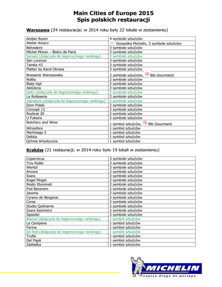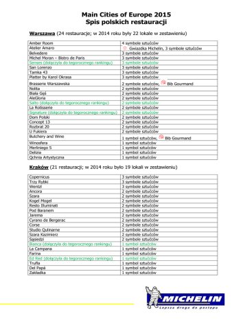 Main Cities of Europe 2015 Spis polskich restauracji Warszawa (24 restauracje; w 2014 roku były 22 lokale w zestawieniu) Amber Room Atelier Amaro Belvedere Michel Moran – Bistro de Paris Senses (dołączyła do tegorocznego rankingu) San Lorenzo Tamka 43 Platter by Karol Okrasa 4 symbole sztućców Gwiazdka Michelin, 3 symbole sztućców 3 symbole sztućców 3 symbole sztućców 3 symbole sztućców 3 symbole sztućców 3 symbole sztućców 3 symbole sztućców Brasserie Warszawska Nolita Biała Gęś AleGloria Salto (dołączyła do tegorocznego rankingu) La Rotisserie Signature (dołączyła do tegorocznego rankingu) Dom Polski Concept 13 Rozbrat 20 U Fukiera Butchery and Wine 2 2 2 2 2 2 2 2 2 2 2 symbole symbole symbole symbole symbole symbole symbole symbole symbole symbole symbole 1 1 1 1 1 symbol symbol symbol symbol symbol Winosfera Merliniego 5 Delizia Qchnia Artystyczna sztućców, sztućców sztućców sztućców sztućców sztućców sztućców sztućców sztućców sztućców sztućców sztućców, sztućców sztućców sztućców sztućców Bib Gourmand Bib Gourmand Kraków (21 restauracji; w 2014 roku było 19 lokali w zestawieniu) Copernicus Trzy Rybki Wentzl Ancora Szara Kogel Mogel Resto Illuminati Pod Baranem Jarema Cyrano de Bergerac Corse Studio Qulinarne Szara Kazimierz Sąsiedzi Bianca (dołączyła do tegorocznego rankingu) La Campana Farina Ed Red (dołączyła do tegorocznego rankingu) Trufla Del Papá Zakładka 3 3 3 2 2 2 2 2 2 2 2 2 2 2 1 1 1 1 1 1 1 symbole sztućców symbole sztućców symbole sztućców symbole sztućców symbole sztućców symbole sztućców symbole sztućców symbole sztućców symbole sztućców symbole sztućców symbole sztućców symbole sztućców symbole sztućców symbole sztućców symbol sztućców symbol sztućców symbol sztućców symbol sztućców symbol sztućców symbol sztućców symbol sztućców