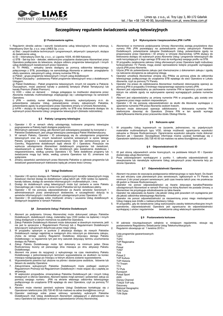 Limes sp. z o.o., ul. Trzy Lipy 3, 80-172 Gdańsk tel. / fax +58 728 40 00, [email protected], www.limes.com.pl Szczegółowy regulamin świadczenia usług telewizyjnych §1 Postanowienie ogólne. 1. Regulamin określa zakres i warunki świadczenia usług telewizyjnych, które wykonują Interaktywny Dom Sp. z o.o. oraz LIMES Sp. z o.o. a) Sieć - zespół środków technicznych i programowych, aktywnych i pasywnych, służąca do świadczenia usług. b) ID – Internatwyny Dom Sp. z o.o., ul. Ligocka 103/8, 40-568 Katowice. c) STB - Set-top box - dekoder, elektroniczne urządzenie dostarczane Abonentowi przez Operatora podłączane do telewizora, służące odbioru programów telewizyjnych i innych usług dodatkowych świadczonych przez Operatora. d) TV PANEL - wirtualny serwis dostępny za pomocą odbiornika telewizyjnego połączonego z STB, pozwalający na samoobsługę Abonenta w zakresie przeglądania oferty operatora, zakupionych usług, zmianę numerów PIN itp. e) Pakiet - grupa programów telewizyjnych i innych usług dodatkowych f) Pakiet Oszczędny - podstawowy Pakiet programów telewizyjnych wraz z dodatkowymi Usługami. g) Pakiet Dodatkowy - Pakiet programów telewizyjnych, innych niż zawarte w Pakiecie Oszczędnym, może zawierać kanały o podobnej tematyce (Pakiet Tematyczny) lub kanały Premium (Pakiet Premium). h) VOD – video on demand - Usługa polegająca na możliwości obejrzenia przez Abonenta materiału multimedialnego znajdującego się i udostępnionego na serwerach Operatora. i) jPIN – osobisty numer identyfikacyjny Abonenta, wykorzystywany m.in. do potwierdzania zakupów Usług, poświadczania zmiany zakupionych Pakietów, potwierdzanie zgody na proponowane przez Operatora zmiany w Umowie Abonenckiej. j) tvPIN – służący do konfiguracji swojego profilu na STB oraz blokowania dostępu do wybranych przez Abonenta Usług i programów telewizyjnych (blokada rodzicielska). §2 1. 2. 3. 4. 2. 3. 4. 1. 2. 3. 4. 5. 6. 7. 8. 9. Operator i ID w ramach oferty udostępniają kodowane programy telewizyjne pogrupowane w Pakiety bądź dostępne pojedynczo. 1. Minimalnym zakresem Usług, jaki Abonent jest zobowiązany posiadać by korzystać z Pakietów Dodatkowych, jest usługa telewizyjna zawierająca Pakiet Wielotematyczny. W ramach Pakietu, Operator i ID zobowiązują się do udostępniania programów telewizyjnych oraz ew. innych świadczeń wyraźnie wskazanych w opisie takiego Pakietu (programy i świadczenia gwarantowane). Opis taki zamieszczony jest w Cenniku, Regulaminie dodatkowym bądź ofercie ID i Operatora. Powyższe nie wyklucza udostępnienia Abonentowi dodatkowych programów lub świadczeń, niewskazanych w opisie Pakietu, lub określonych jako świadczenia dodatkowe i niegwarantowane, według uznania Operatora i ID. Takie dodatkowe programy lub 1. świadczenia mogą być także, według uznania Operatora lub ID, zmieniane lub wyłączane. 2. Zmiany zawartości zamówionych przez Abonenta Pakietów w zakresie programów lub świadczeń gwarantowanych traktowane będą jak zmiana treści Umowy. Abonentowi w momencie podpisywania Umowy Abonenckiej zostają przydzielone dwa numery PIN: jPIN pozwalający na poświadczanie zmiany zakupionych Pakietów Dodatkowych, potwierdzanie zakupów Dodatkowych Usług, potwierdzanie zgody na proponowane przez Operatora i ID zmiany w Umowie Abonenckiej; tvPIN służący do blokowania dostępu do wybranych przez Abonenta Usług i programów telewizyjnych dla osób korzystających z tego samego STB oraz do konfiguracji swojego profilu na STB. W przypadku zwiększenia zakresu Usług oferowanych przez Operatora bądź rozbudowy funkcjonalności TV Panelu mogą zostać wprowadzone kolejne przypadki wymagające użycia jPIN przez Abonenta. Użycie jPIN do potwierdzenia zakupu jest równoznaczne z dokonaniem zakupu i zgodą na naliczenie obciążenia za zakupioną Usługę. Operator umożliwia Abonentowi zmianę obu PINów za pomocą pilota do odbiornika telewizyjnego podłączonego do urządzenia STB wpiętego do sieci Operatora w Lokalu Abonenta, czyli za pomocą TV Panelu. Operator ma prawo do zablokowania Abonentowi możliwość dokonywania operacji za pomocą jPIN w przypadku 5-krotnego niepoprawnego wpisania numeru jPIN. Abonent jest odpowiedzialny za zachowanie numerów PIN w tajemnicy przed osobami którym nie udziela zgody na wykonywanie operacji wymagających podania numerów PIN. Abonent jest odpowiedzialny za zmianę numerów PIN w przypadku, gdy zostały one wyjawione przez niego osobom niepowołanym. Operator i ID nie ponoszą odpowiedzialności za skutki dla Abonenta wynikające z ujawnienia numerów PIN przez Abonenta osobom trzecim. Abonent może dokonywać operacje odblokowania i blokowania numerów PIN telefonicznie dzwoniąc do Operatora. Zmiana PIN w ten sposób wymaga zidentyfikowania klienta przez pracownika działu Obsługi Klienta. §5 1. 2. 3. 4. 5. Zamawianie Usług i Pakietów Dodatkowych Abonent po podpisaniu Umowy Abonenckiej może dokonywać zakupu Pakietów Dodatkowych, dodatkowych Usług, materiałów typu VOD (wideo na żądanie) i innych Usług dostępnych w danym momencie na platformie Operatora. 2. Zakup Pakietów Dodatkowych Abonent może dokonywać w dowolnym momencie, jeśli 1. nie jest to sprzeczne z Regulaminami Promocji lub z Regulaminami Dodatkowymi dotyczącymi wykupionych dotychczas przez niego Usług. 2. 3. W przypadku opisanym w punkcie 2 aktywacja dostępu do nowych Pakietów Dodatkowych nastąpi najpóźniej w następnym dniu roboczym po dokonaniu zakupu, chyba że istnieje osobny Regulamin Dodatkowy dotyczący danego Pakietu Dodatkowego i w regulaminie tym jest inny warunek dotyczący terminu uruchomienia dostępu do Pakietu. 4. Zakup Pakietu Dodatkowego może być dokonany na minimum jeden Okres Rozliczeniowy liczony od pierwszego dnia miesiąca po dniu aktywacji Pakietu Dodatkowego. 5. Abonent ma prawo do rezygnacji z wykupionego na czas nieokreślony Pakietu Dodatkowego 