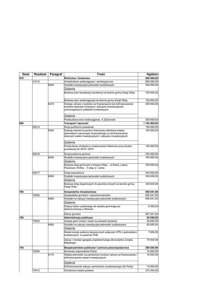 Dział Rozdział Paragraf 010 01010 6050 Treść Rolnictwo i łowiectwo Infrastruktura wodociągowa i sanitacyjna wsi Wydatki inwestycyjne jednostek budżetowych Ogółem 600 000,00 600 000,00 300 000,00 Zadania 6210 Budowa sieci kanalizacji sanitarnej na terenie gminy Książ Wlkp. 150 000,00 Budowa sieci wodociągowej na terenie gminy Książ Wlkp. Dotacje celowe z budżetu na finansowanie lub dofinansowanie kosztów realizacji inwestycji i zakupów inwestycyjnych samorządowych zakładów budżetowych 150 000,00 300 000,00 Zadania Przebudowa sieci wodociągowej w Zaborowie Transport i łączność 600 60014 6300 Drogi publiczne powiatowe Dotacja celowa na pomoc finansową udzielaną między jednostkami samorządu terytorialnego na dofinansowanie własnych zadań inwestycyjnych i zakupów inwestycyjnych 300 000,00 1 185 000,00 150 000,00 150 000,00 Zadania 60016 6050 Przebudowa chodnika w miejscowości Zaborowo przy drodze powiatowej Nr 4076 i 4079 150 000,00 Drogi publiczne gminne Wydatki inwestycyjne jednostek budżetowych 700 000,00 700 000,00 Zadania 60017 6050 Budowa dróg gminnych w Książu Wlkp. - ul.Polna, Leśna, Piaskowa i Krótka - II etap ul. Leśna 700 000,00 Drogi wewnetrzne Wydatki inwestycyjne jednostek budżetowych 335 000,00 335 000,00 Zadania 700 70005 6060 Budowa dróg dojazdowych do gruntów rolnych na terenie gminy Książ Wlkp. 335 000,00 Gospodarka mieszkaniowa Gospodarka gruntami i nieruchomościami Wydatki na zakupy inwestycyjne jednostek budżetowych 656 541,00 656 541,00 656 541,00 Zadania Wykup lokalu użytkowego do zasobu gminnego po telekomunikacji w Mchach 750 75023 6060 Zakup gruntów Administracja publiczna Urzędy gmin (miast i miast na prawach powiatu) Wydatki na zakupy inwestycyjne jednostek budżetowych 9 000,00 647 541,00 82 650,00 82 650,00 82 650,00 Zadania Modernizacja systemu bezpiecznych połączeń VPN z jednostkami budżetowymi w systemie FKB Zakup i montaż agregatu prądotwórczego dla budynku Urzędu Miejskiego 754 75404 6170 Bezpieczeństwo publiczne i ochrona przeciwpożarowa Komendy wojewódzkie Policji Wpłaty jednostek na państwowy fundusz celowy na finansowanie i dofinansowanie zadań inwestycyjnych 7 650,00 75 000,00 289 204,00 15 000,00 15 000,00 Zadania Dofinansowanie zakupu samochodu oznakowanego dla Policji 75412 Ochotnicze straże pożarne 15 000,00 274 204,00 6050 Wydatki inwestycyjne jednostek budżetowych 250 000,00 Zadania Rozbudowa budynku Ochotniczej Straży Pożarnej w Chrząstowie 6060 Wydatki na zakupy inwestycyjne jednostek budżetowych 250 000,00 4 204,00 Zadania 6230 Zakup motopompy dla OSP Włościejewice Dotacje celowe z budżetu na finansowanie lub dofinansowanie kosztów realizacji inwestycji i zakupów inwestycyjnych jednostek nie zaliczanych do sektora finansów publicznych 4 204,00 20 000,00 Zadania Zakup narzędzi hydraulicznych dla OSP Chrząstowo - dotacja celowa 801 80195 6050 Oświata i wychowanie Pozostała działalność Wydatki inwestycyjne jednostek budżetowych 20 000,00 267 372,00 267 372,00 267 372,00 Zadania 900 90001 6050 Budowa chodnika i wjazdu z kostki brukowej przy Szkole w Chrząstowie 17 372,00 Roboty uzupełniajace - Temodernizacja budynku SP w Konarzycach 45 200,00 Termomodernizacja budynku Szkoły Podstawowej w Konarzycach 204 800,00 Gospodarka komunalna i ochrona środowiska Gospodarka ściekowa i ochrona wód Wydatki inwestycyjne jednostek budżetowych 976 712,00 357 100,00 357 100,00 Zadania 90002 6010 Zaprojektowanie i budowa instalacji do usuwania piasku i skrawek w oczyszczalni ścieków w Kiełczynku 357 100,00 Gospodarka odpadami Wydatki na zakup i objęcie akcji, wniesienie wkładów do spółek prawa handlowego oraz na uzupełnienie funduszy statutowych banków państwowych i innych instytucji finansowych 310 427,00 224 400,00 Zadania Rozbudowa Zakładu Zaposp.Odpadów Jarocin.Zorganizowanie, nadzór nad funkcjonowaniem syst.gosp.opdad. i osadami ściekowymi dla gmin objętych porozumieniem . Wkład Finansowy do spółki. 6050 Wydatki inwestycyjne jednostek budżetowych 224 400,00 50 000,00 Zadania 6060 Rekultywacja składowiska odpadów innych niż niebezpieczne i obojętne w miejscowości Włościejewki 50 000,00 Wydatki na zakupy inwestycyjne jednostek budżetowych 36 027,00 Zadania Zakup hali magazynowej przy punkcie gromadzenia odpadów problemowych. 90013 6610 30 000,00 Zakup kontenera przy punkcie gromadzenia odpadów problemowych. 6 027,00 Schroniska dla zwierząt Dotacje celowe przekazane gminie na inwestycje i zakupy inwestycyjne realizowane na podstawie porozumień (umów) między jednostkami samorządu terytorialnego 6 000,00 6 000,00 Zadania Rozbudowa schroniska dla bezdomnych zwierząt w gaju. Budowa budynku edukacyjno -szkoleniowego. 90015 6050 Oświetlenie ulic, placów i dróg Wydatki inwestycyjne jednostek budżetowych 6 000,00 118 385,00 118 385,00 Zadania Dołożenie nowych punktów świetlnych w gminie Książ Wlkp. Wpływy i wydatki związane z gromadzeniem środków z opłat i kar za korzystanie ze środowiska 90019 6230 Dotacje celowe z budżetu na finansowanie lub dofinansowanie kosztów realizacji inwestycji i zakupów inwestycyjnych jednostek nie zaliczanych do sektora finansów publicznych 118 385,00 39 000,00 39 000,00 6230 Dotacje celowe z budżetu na finansowanie lub dofinansowanie kosztów realizacji inwestycji i zakupów inwestycyjnych jednostek nie zaliczanych do sektora finansów publicznych 39 000,00 Zadania Budowa przydomowych oczyszczalni ścieków. Dofinansowanie. 90095 6050 Pozostała działalność Wydatki inwestycyjne jednostek budżetowych 39 000,00 145 800,00 145 800,00 Zadania 921 92109 6050 Budowa szaletu publicznego w Książu Wlkp. Kultura i ochrona dziedzictwa narodowego Domy i ośrodki kultury, świetlice i kluby Wydatki inwestycyjne jednostek budżetowych 145 800,00 43 723,00 43 723,00 27 476,00 Zadania 6060 2-Budowa ogrodzenia przy świetlicy wiejskiej w Zakrzewicach Budowa ogrodzenia przy świetlicy wiejskiej w Sroczewie