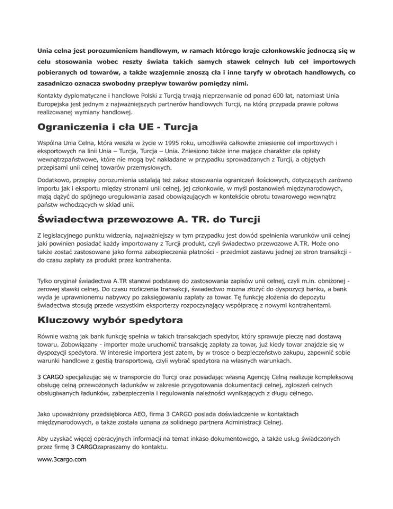Unia celna jest porozumieniem handlowym, w ramach którego kraje członkowskie jednoczą się w celu stosowania wobec reszty świata takich samych stawek celnych lub ceł importowych pobieranych od towarów, a także wzajemnie znoszą cła i inne taryfy w obrotach handlowych, co zasadniczo oznacza swobodny przepływ towarów pomiędzy nimi. Kontakty dyplomatyczne i handlowe Polski z Turcją trwają nieprzerwanie od ponad 600 lat, natomiast Unia Europejska jest jednym z najważniejszych partnerów handlowych Turcji, na którą przypada prawie połowa realizowanej wymiany handlowej. Ograniczenia i cła UE - Turcja Wspólna Unia Celna, która weszła w życie w 1995 roku, umożliwiła całkowite zniesienie ceł importowych i eksportowych na linii Unia – Turcja, Turcja – Unia. Zniesiono także inne mające charakter cła opłaty wewnątrzpaństwowe, które nie mogą być nakładane w przypadku sprowadzanych z Turcji, a objętych przepisami unii celnej towarów przemysłowych. Dodatkowo, przepisy porozumienia ustalają też zakaz stosowania ograniczeń ilościowych, dotyczących zarówno importu jak i eksportu między stronami unii celnej, jej członkowie, w myśl postanowień międzynarodowych, mają dążyć do spójnego uregulowania zasad obowiązujących w kontekście obrotu towarowego wewnątrz państw wchodzących w skład unii. Świadectwa przewozowe A. TR. do Turcji Z legislacyjnego punktu widzenia, najważniejszy w tym przypadku jest dowód spełnienia warunków unii celnej jaki powinien posiadać każdy importowany z Turcji produkt, czyli świadectwo przewozowe A.TR. Może ono także zostać zastosowane jako forma zabezpieczenia płatności - przedmiot zastawu jednej ze stron transakcji do czasu zapłaty za produkt przez kontrahenta. Tylko oryginał świadectwa A.TR stanowi podstawę do zastosowania zapisów unii celnej, czyli m.in. obniżonej zerowej stawki celnej. Do czasu rozliczenia transakcji, świadectwo można złożyć do dyspozycji banku, a bank wyda je uprawnionemu nabywcy po zaksięgowaniu zapłaty za towar. Tę funkcję złożenia do depozytu świadectwa stosują przede wszystkim eksporterzy rozpoczynający współpracę z nowymi kontrahentami. Kluczowy wybór spedytora Równie ważną jak bank funkcję spełnia w takich transakcjach spedytor, który sprawuje pieczę nad dostawą towaru. Zobowiązany - importer może uruchomić transakcję zapłaty za towar, już kiedy towar znajdzie się w dyspozycji spedytora. W interesie importera jest zatem, by w trosce o bezpieczeństwo zakupu, zapewnić sobie warunki handlowe z gestią transportową, czyli wybrać spedytora na własnych warunkach. 3 CARGO specjalizując się w transporcie do Turcji oraz posiadając własną Agencję Celną realizuje kompleksową obsługę celną przewożonych ładunków w zakresie przygotowania dokumentacji celnej, zgłoszeń celnych obsługiwanych ładunków, zabezpieczenia i regulowania należności wynikających z długu celnego. Jako upoważniony przedsiębiorca AEO, firma 3 CARGO posiada doświadczenie w kontaktach międzynarodowych, a także została uznana za solidnego partnera Administracji Celnej. Aby uzyskać więcej operacyjnych informacji na temat inkaso dokumentowego, a także usług świadczonych przez firmę 3 CARGOzapraszamy do kontaktu. www.3cargo.com