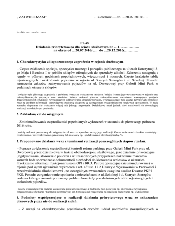 „ ZATWIERDZAM” …Goleniów......dn. …20.07.2016r.…. L. dz. ………/…….. PLAN Działania priorytetowego dla rejonu służbowego nr …1…………….. na okres od …20.07.2016r…. do …20.12.2016r.……….. 1. Charakterystyka zdiagnozowanego zagrożenia w rejonie służbowym. - Częste zakłócenie spokoju, spoczynku nocnego i porządku publicznego na ulicach Konstytucji 3go Maja i Barnima I w pobliżu sklepów oferujących do sprzedaży alkohol. Zdarzenia następują z reguły w późnych godzinach popołudniowych, wieczornych i nocnych. Częste kradzieże tablic rejestracyjnych i uszkodzenia pojazdów w rejonie ul. Szarych Szeregów i ul. Szkolnej. Ponadto naruszenia zakazów zatrzymywania pojazdów na ul. Dworcowej przy Galerii Mini Park w godzinach otwarcia sklepów. ( zwięzły opis głównego zagrożenia / problemu / wraz ze wskazaniem miejsca / miejsc i czasu jego występowania w rejonie oraz zidentyfikowanych przyczyn oraz skutków. Należy wskazać główne zidentyfikowane zagrożenie wymagające podjęcia długoterminowych czynności wymagających oddziaływania długookresowego, wykraczającego poza zakres rutynowych czynności wraz ze źródłem informacji stanowiącymi podstawę diagnozy ze szczególnym uwzględnieniem oczekiwań społecznych. W razie potrzeby dopuszcza się wskazanie więcej niż jednego zagrożenia. Dzielnicowy musi jednak mieć możliwość ich równoległej realizacji na właściwym poziomie). 2. Zakładany cel do osiągnięcia. - Zminimalizowanie częstotliwości popełnianych wykroczeń w stosunku do pierwszego półrocza 2016 roku. ( należy wskazać postawiony do osiągnięcia cel wraz ze sposobem oceny jego realizacji. Ocena może mieć charakter zamknięty : zrealizowano / nie zrealizowano, jakościowy lub ilościowy np. spadek /wzrost określonej liczby, % 3. Proponowane działania wraz z terminami realizacji poszczególnych etapów / zadań. - Poprzez zwiększenie częstotliwości kontroli rejonu parkingu przy Galerii Mini Park przy ul. Dworcowej przez dzielnicową w trakcie obchodu rejonu służbowego, jako działanie prewencyjne (legitymowania, stosowanie pouczeń a w uzasadnionych przypadkach nakładanie mandatów karnych bądź sporządzanie dokumentacji niezbędnej do kierowania wniosków o ukaranie). Przekazanie informacji funkcjonariuszom OPI i RRD. Patrole operacyjne (nieumundurowane) w rejonie pod kątem ujawnienia wykroczeń z art. 43' ust. 1 i 2 Ustawy o Wychowaniu w trzeźwości i przeciwdziałaniu alkoholizmowi , ze szczególnym zwróceniem uwagi na okolice Dworce PKP i PKS. Ponadto zorganizowanie spotkania z mieszkańcami z ul. Szkolnej i ul. Szarych Szeregów podczas którego zostanie poruszony problem kradzieży przedmiotowych tablic rejestracyjnych i uszkodzeń pojazdów. ( należy wskazać główne zadania realizowane przez dzielnicowego i podmioty poza policyjne np. skierowanie wystąpienia, zorganizowanie spotkania / kampanii informacyjnej itp. bezwzględne reagowanie na określone zachowania np. wykroczenia) 4. Podmioty współpracujące w realizacji działania priorytetowego wraz ze wskazaniem planowych przez nie do realizacji zadań. - Z uwagi na charakterystykę popełnianych czynów, udział podmiotów pozapolicyjnych w działaniach prewencyjnych i wykrywawczych nie znajduje uzasadnienia, gdyż brak jest bowiem płaszczyzny, na której podmioty takie mogłyby wspomóc działania Policji. W celu wykrywania i karania sprawców należy zbierać informacje od mieszkańców, a także nawiązywać współpracę z właścicielami podmiotów gospodarczych (sklepów) położonych w wymienionych rejonach zagrożonych występowaniem wymienionych zjawisk bowiem podmioty te są wyposażone w systemy monitoringu. ( należy wskazać w przypadku gdy dla osiągnięcia zakładanego celu niezbędna jest współpraca z podmiotami poza policyjnymi)