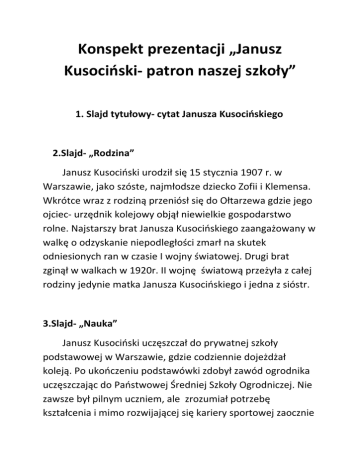 Konspekt prezentacji „Janusz Kusociński- patron naszej szkoły” 1. Slajd tytułowy- cytat Janusza Kusocińskiego 2.Slajd- „Rodzina” Janusz Kusociński urodził się 15 stycznia 1907 r. w Warszawie, jako szóste, najmłodsze dziecko Zofii i Klemensa. Wkrótce wraz z rodziną przeniósł się do Ołtarzewa gdzie jego ojciec- urzędnik kolejowy objął niewielkie gospodarstwo rolne. Najstarszy brat Janusza Kusocińskiego zaangażowany w walkę o odzyskanie niepodległości zmarł na skutek odniesionych ran w czasie I wojny światowej. Drugi brat zginął w walkach w 1920r. II wojnę światową przeżyła z całej rodziny jedynie matka Janusza Kusocińskiego i jedna z sióstr. 3.Slajd- „Nauka” Janusz Kusociński uczęszczał do prywatnej szkoły podstawowej w Warszawie, gdzie codziennie dojeżdżał koleją. Po ukończeniu podstawówki zdobył zawód ogrodnika uczęszczając do Państwowej Średniej Szkoły Ogrodniczej. Nie zawsze był pilnym uczniem, ale zrozumiał potrzebę kształcenia i mimo rozwijającej się kariery sportowej zaocznie zdał maturę w roku 1937 , a następnie ukończył studia w Centralnym Instytucie Wychowania Fizycznego. 4. Slajd- „Dzieciństwo” Janusz Kusociński był zawsze ruchliwym, pełnym energii dzieckiem. Lubił spędzać czas aktywnie. Od najmłodszych lat grał z kolegami w piłkę nożną i palanta. Często pomagał rodzicom w pracach w gospodarstwie. 5. Slajd- „Kariera sportowa” Swoją przygodę ze sportem rozpoczął jako piłkarz nożny. Przypadek sprawił, że zafascynował się lekkoatletyką. Siedząc na trybunach został poproszony , by wystartował w biegu za nieobecnego sportowca. Zgodził się i odniósł pierwsze zwycięstwo. Tak bardzo spodobało się to Kusocińskiemu, że 2 tygodnie później wystartował w biegu na 3,5 km. , który również zakończył zwycięstwem. Sukcesy te sprawiły, że postanowił zająć się lekkoatletyką. Jego trenerem został Aleksander Klumberg. Kusociński ufał swojemu trenerowi i z wielkim zaangażowaniem i poświęceniem poddawał się wyczerpującym, nowatorskim jak na tamte czasy treningom. Jednocześnie cały czas pracował jako ogrodnik w warszawskim parku Łazienki. Był ambitny, i pracowity, zawsze dążył do realizacji wytyczonych celów. 6. Slajd- „Sukcesy” Jego pracowitość, wytrwałość, chęć zwycięstwa sprawiły, że Janusz Kusociński odniósł wiele sukcesów na arenach sportowych. Stał się sportowcem znanym i cenionym nie tylko w Polsce, ale i na świecie. 7. Slajd- „Olimpiada” Jednym z największych osiągnięć Janusza Kusocińskiego było zdobycie złotego medalu na Mistrzostwach Olimpijskich w Los Angeles w 1932 r. w biegu na dystansie 10.000m. W czasie wyścigu Kusociński „walczył” nie tylko ze swoim odwiecznym rywalem -fińskim biegaczem Iso-Hollo, ale także z przeszywającym bólem wywołanym przez źle dobrane buty, które bardzo poraniły stopy mistrza. Mimo to wygrał ustanawiając jednocześnie nowy rekord, który został pobity dopiero po 22 latach. Niestety, rany stóp były tak duże ,że Kusociński nie mógł wystąpić w kolejnym biegu na 5.000m. w którym także był faworytem. 8. Slajd- „ Żołnierz” Karierę sportową Janusza Kusocińskiego przerwał wybuch II wojny światowej. Sportowiec podobnie jak wcześniej jego bracia bez wahania stanął w obronie ojczyzny. Walczył w kampanii wrześniowej, a po przegranej walce rozpoczął działalność w ruchu oporu pod pseudonimem „Prawdzic”. W maju 1940r. został aresztowany przez Niemców . Więziony, przesłuchiwany i katowany nie wydał swoich przyjaciół. 9. Slajd- „ 21 czerwca 1940 r.” Nie mogąc wydobyć żadnych informacji od Janusza Kusocińskiego Niemcy postanowili go rozstrzelać. Egzekucję wykonano 21.06.1940r. w lesie niedaleko wsi Palmiry pod Warszawą. Wraz z Kusocińskim zginęło wielu znanych sportowców i intelektualistów. 10. Slajd-„ Patriota” Janusz Kusociński bardzo kochał swoja ojczyznę. Najpierw rozsławiał jej imię na stadionach całego świata sprawiając, że wielokrotnie rozbrzmiewał tam „ Mazurek Dąbrowskiego”, potem oddał życie za wolność swojego kraju. Jego bohaterska walka została dwukrotnie doceniona przyznaniem Kusocińskiemu medalu -„ Krzyża Walecznych”. 11. Slajd- „Nadanie imienia” 1 czerwca 1977r. nasza szkoła po licznych przygotowaniach otrzymała imię Janusza Kusocińskiego- wielkiego sportowca i patrioty, człowieka odznaczonego silnym charakterem, odważnego, wytrwałego i pracowitego. Człowieka, który dla każdego ucznia naszej szkoły może być wzorem godnym naśladowania. 12. Slajd- „ Sztandar” Kolejnym wyjątkowym dniem naszej szkoły był dzień 18.10.1980. Właśnie wtedy ówczesny dyrektor szkoły mgr Jan Chojnacki przyjął z rąk komitetu obywatelskiego sztandar szkoły. Ten niezwykły symbol przynależności wszystkich nauczycieli i uczniów do społeczności Szkoły Podstawowej im. Janusza Kusocińskiego w Dolsku towarzyszy nam do dziś w czasie wszystkich ważnych wydarzeń.