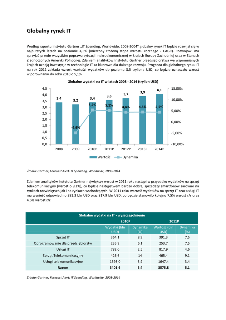 Globalny rynek IT Według raportu Instytutu Gartner „IT Spending, Worldwide, 2008-2004” globalny rynek IT będzie rozwijał się w najbliższych latach na poziomie 4,5% (mierzony złożoną stopa wzrostu rocznego - CAGR). Rozwojowi ma sprzyjać przede wszystkim poprawa sytuacji makroekonomicznej w krajach Europy Zachodniej oraz w Stanach Zjednoczonych Ameryki Północnej. Zdaniem analityków Instytutu Gartner przedsiębiorstwa we wspomnianych krajach uznają inwestycje w technologie IT za kluczowe dla dalszego rozwoju. Prognoza dla globalnego rynku IT na rok 2011 zakłada wzrost wartości wydatków do poziomu 3,5 tryliona USD, co będzie oznaczało wzrost w porównaniu do roku 2010 o 5,1%. Globalne wydatki na IT w latach 2008 - 2014 (trylion USD) 4,5 4,0 3,5 3,4 3,4 3,2 5,4% 3,0 3,6 3,9 3,7 4,1 15,00% 10,00% 5,1% 4,5% 4,4% 4,5% 5,00% 2,5 2,0 0,00% 1,5 -4,9% 1,0 -5,00% 0,5 0,0 -10,00% 2008 2009 2010P 2011P Wartość 2012P 2013P 2014P Dynamika Źródło: Gartner, Forecast Alert: IT Spending, Worldwide, 2008-2014 Zdaniem analityków instytutu Gartner największy wzrost w 2011 roku nastąpi w przypadku wydatków na sprzęt telekomunikacyjny (wzrost o 9,1%), co będzie następstwem bardzo dobrej sprzedaży smartfonów zarówno na rynkach rozwiniętych jak i na rynkach wschodzących. W 2011 roku wartość wydatków na sprzęt IT oraz usługi IT ma wynieść odpowiednio 391,3 bln USD oraz 817,9 bln USD, co będzie stanowiło kolejno 7,5% wzrost r/r oraz 4,6% wzrost r/r. Globalne wydatki na IT - wyszczególnienie 2010P 2011P Sprzęt IT Wydatki (bln USD) 364,1 Dynamika (%) 8,9 Wartość (bln USD) 391,3 Dynamika (%) 7,5 Oprogramowanie dla przedsiębiorstw 235,9 6,1 253,7 7,5 Usługi IT 782,0 2,5 817,9 4,6 Sprzęt Telekomunikacyjny 426,6 14 465,4 9,1 Usługi telekomunikacyjne 1593,0 3,9 1647,4 3,4 Razem 3401,6 5,4 3575,8 5,1 Źródło: Gartner, Forecast Alert: IT Spending, Worldwide, 2008-2014