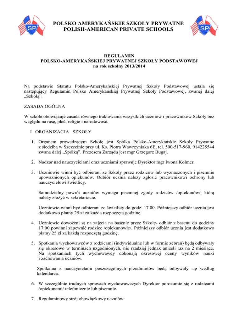 POLSKO AMERYKAŃSKIE SZKOŁY PRYWATNE POLISH-AMERICAN PRIVATE SCHOOLS REGULAMIN POLSKO-AMERYKAŃSKIEJ PRYWATNEJ SZKOŁY PODSTAWOWEJ na rok szkolny 2013/2014 Na podstawie Statutu Polsko-Amerykańskiej Prywatnej Szkoły Podstawowej ustala się następujący Regulamin Polsko Amerykańskiej Prywatnej Szkoły Podstawowej, zwanej dalej „Szkołą”. ZASADA OGÓLNA W szkole obowiązuje zasada równego traktowania wszystkich uczniów i pracowników Szkoły bez względu na rasę, płeć, religię i narodowość. I ORGANIZACJA SZKOŁY 1. Organem prowadzącym Szkołę jest Spółka Polsko-Amerykańskie Szkoły Prywatne z siedzibą w Szczecinie przy ul. Ks. Piotra Wawrzyniaka 6E, tel. 500-517-960, 914225544 zwana dalej „Spółką”. Prezesem Zarządu jest mgr Grzegorz Bugaj. 2. Nadzór nad nauczycielami oraz uczniami sprawuje Dyrektor mgr Iwona Kolmer. 3. Uczniowie winni być odbierani ze Szkoły przez rodziców lub wyznaczonych i pisemnie upoważnionych opiekunów. Odbiór ucznia należy zgłosić pracownikowi ochrony lub nauczycielowi świetlicy. Samodzielny powrót uczniów wymaga pisemnej zgody rodziców /opiekunów/, którą należy złożyć w sekretariacie. Uczniowie winni być odbierani ze świetlicy do godz. 17.00. Późniejszy odbiór ucznia jest dodatkowo płatny 25 zł za każdą rozpoczętą godzinę. 4. Uczniowie dowożeni są na zajęcia na basenie przez Szkołę- odbiór z basenu do godziny 17:00 powinni zapewnić rodzice /opiekunowie/. Późniejszy odbiór ucznia jest dodatkowo płatny 25 zł za każdą rozpoczętą godzinę. 5. Spotkania wychowawców z rodzicami (indywidualne lub w formie zebrań) będą odbywały się okresowo w terminach uzgodnionych, nie rzadziej jednak aniżeli raz na 2 miesiące. Na spotkaniach tych wychowawcy dokonają okresowej oceny wyników nauki i zachowania uczniów. Spotkania z nauczycielami poszczególnych przedmiotów będą odbywały się według kalendarza. 6. W szczególnie trudnych sprawach wychowawczych Dyrektor porozumie się z rodzicami /opiekunami/ telefonicznie lub pisemnie. 7. Regulaminowy strój obowiązkowy uczniów: a. Strój galowy: chłopcy granatowa marynarka z logo Szkoły, granatowe spodnie, biała koszula dziewczęta granatowy żakiet z logo Szkoły, spódnica w szkocką kratę, biała bluzka, białe lub cieliste rajstopy b. Strój codzienny: dres popielaty z logo Szkoły, biała podkoszulka, klasy 0-3 dres czerwono- granatowy z logo Szkoły, biała podkoszulka, klasy 4-6 c. Strój sportowy: granatowe lub czarne spodenki, czerwona podkoszulka d. Na terenie Szkoły uczniów obowiązuje obuwie zmienne. II PRAWA I OBOWIĄZKI UCZNIÓW 1. Prawa i obowiązki ucznia określa Statut Polsko-Amerykańskiej Szkoły Podstawowej. 2. Każda nieobecność w Szkole powinna być zgłoszona telefonicznie w sekretariacie lub u wychowawcy w pierwszym dniu nieobecności – tel. 500-517-960, 914225544. 3. Wszystkie nieobecności powyżej 2 tygodni powinny być uzgodnione przez rodziców /opiekunów/ z Dyrektorem Szkoły. 4. Uczeń ma obowiązek stosować się do poleceń wszystkich nauczycieli i pracowników Szkoły. 5. Ucznia obowiązuje strój regulaminowy. 6. Za naruszenie istotnych postanowień Regulaminu Szkoły, uczeń może być na wniosek Zarządu Szkoły przeniesiony do szkoły rejonowej ze skutkiem natychmiastowym. III ZOBOWIĄZANIA PŁATNICZE 1. Rodzice /opiekunowie/ zawierają ze Szkołą roczną umowę płatniczą. 2. Wysokość miesięcznego czesnego jak również jednorazowego wpisowego przy zapisie do szkoły ustala Zarząd Spółki. 3. W przypadku rodzeństwa przysługuje ulga w opłacie miesięcznego czesnego. 4. Płatność czesnego obowiązuje przez 12 miesięcy w roku tj. w okresie od września danego roku do sierpnia roku następnego. W przypadku jednorazowej wpłaty czesnego za cały rok obowiązuje zniżka w wysokości 5%. 5. Opłaty miesięczne za m-ce od września do czerwca wnosi się z góry do 5 dnia każdego miesiąca w Sekretariacie Szkoły lub na konto: Bank PEKAO S.A. O/Szczecin 75 1240 6667 1111 0000 5397 7645 6. Poczynając od 6. dnia miesiąca, za każdy dzień zwłoki naliczane są odsetki w wysokości ustawowej. 7. Opłaty za miesiące wakacyjne tj. za lipiec i sierpień uiszcza się w całości lub w ratach nie później aniżeli do dnia 31 kwietnia na fundusz remontowy Szkoły. 8. W razie podjęcia przez rodziców /opiekunów/ decyzji o zaprzestaniu pobierania nauki przez uczniów w ciągu roku szkolnego, rodzice /opiekunowie/ zobowiązani są do wpłacenia dodatkowej kwoty w wysokości jednomiesięcznego czesnego. 9. Zakończenie przez uczniów roku szkolnego obliguje rodziców /opiekunów/ do zapłaty za miesiące wakacyjne, nawet w przypadku decyzji o nie podjęciu nauki w następnym roku szkolnym. 10. Spółka zastrzega sobie prawo 15 zwyżki czesnego w ciągu roku szkolnego, jak również prawo do nie odnowienia umowy na następny rok szkolny. 11. Umowę na następny rok szkolny rodzice /opiekunowie/ winni podpisać do 30 kwietnia lub w powyższym terminie pisemnie poinformować Dyrektora Szkoły, że dziecko nie będzie kontynuowało nauki. 12. W przypadku rezygnacji ucznia ze szkoły, żadna z wniesionych opłat nie podlega zwrotowi. 13. Koszty strojów obowiązujących w szkle oraz podręczników i przyborów szkolnych pokrywane są przez rodziców (opiekunów). 14. Szkoła na życzenie rodziców pośredniczy w zakupie obiadów, których koszt pokrywają rodzice (opiekunowie). 15. Zapraszamy rodziców /opiekunów/ do składania sugestii, wniosków oraz opinii ustnie lub pisemnie Dyrektorowi lub Prezesowi Zarządu.