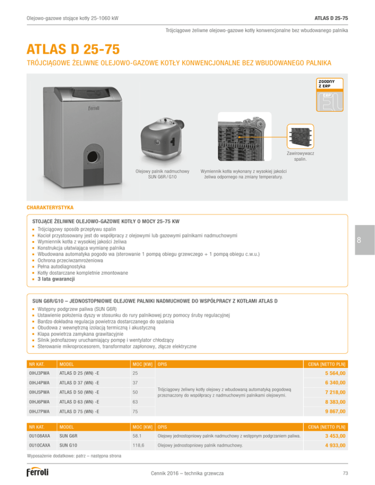ATLAS D 25-75 Olejowo-gazowe stojące kotły 25-1060 kW Trójciągowe żeliwne olejowo-gazowe kotły konwencjonalne bez wbudowanego palnika ATLAS D 25-75 TRÓJCIĄGOWE ŻELIWNE OLEJOWO-GAZOWE KOTŁY KONWENCJONALNE BEZ WBUDOWANEGO PALNIKA ZGODNY Z ERP ERP Zawirowywacz spalin. Olejowy palnik nadmuchowy SUN G6R / G10 Wymiennik kotła wykonany z wysokiej jakości żeliwa odpornego na zmiany temperatury. CHARAKTERYSTYKA STOJĄCE ŻELIWNE OLEJOWO-GAZOWE KOTŁY O MOCY 25-75 KW Trójciągowy sposób przepływu spalin Kocioł przystosowany jest do współpracy z olejowymi lub gazowymi palnikami nadmuchowymi Wymiennik kotła z wysokiej jakości żeliwa Konstrukcja ułatwiająca wymianę palnika Wbudowana automatyka pogodo wa (sterowanie 1 pompą obiegu grzewczego + 1 pompą obiegu c.w.u.) Ochrona przeciwzamrożeniowa Pełna autodiagnostyka Kotły dostarczane kompletnie zmontowane 3 lata gwarancji 8 SUN G6R/G10 – JEDNOSTOPNIOWE OLEJOWE PALNIKI NADMUCHOWE DO WSPÓŁPRACY Z KOTŁAMI ATLAS D Wstępny podgrzew paliwa (SUN G6R) Ustawienie położenia dyszy w stosunku do rury palnikowej przy pomocy śruby regulacyjnej Bardzo dokładna regulacja powietrza dostarczanego do spalania Obudowa z wewnętrzną izolacją termiczną i akustyczną Klapa powietrza zamykana grawitacyjnie Silnik jednofazowy uruchamiający pompę i wentylator chłodzący Sterowanie mikroprocesorem, transformator zapłonowy, złącze elektryczne NR KAT. MODEL MOC [KW] 0IHJ3PWA ATLAS D 25 (WN) -E 25 0IHJ4PWA ATLAS D 37 (WN) -E 37 OPIS CENA [NETTO PLN] 5 564,00 6 340,00 Trójciągowy żeliwny kotły olejowy z wbudowaną automatyką pogodową przeznaczony do współpracy z nadmuchowymi palnikami olejowymi. 7 218,00 0IHJ5PWA ATLAS D 50 (WN) -E 50 0IHJ6PWA ATLAS D 63 (WN) -E 63 8 383,00 0IHJ7PWA ATLAS D 75 (WN) -E 75 9 867,00 NR KAT. MODEL MOC [KW] OPIS 0U108AXA SUN G6R 58.1 Olejowy jednostopniowy palnik nadmuchowy z wstępnym podgrzaniem paliwa. 3 453,00 0U10CAXA SUN G10 118,6 Olejowy jednostopniowy palnik nadmuchowy. 4 933,00 CENA [NETTO PLN] Wyposażenie dodatkowe: patrz – następna strona Cennik 2016 – technika grzewcza 73 ATLAS D 25-75 Olejowo-gazowe stojące kotły 25-1060 kW Trójciągowe żeliwne olejowo-gazowe kotły konwencjonalne bez wbudowanego palnika WYPOSAŻENIE DODATKOWE NR KAT. MODEL OPIS CENA [NETTO PLN] 013100XA ROMEO W Zdalny przewodowy sterownik adaptacyjny kotła z funkcją regulacji temperatury wewnętrznej w pomieszczeniu. 474,00 013101XA ROMEO W RF Zdalny bezprzewodowy sterownik adaptacyjny kotła z funkcją regulacji temperatury wewnętrznej w pomieszczeniu. 799,00 013018XO Czujnik temperatury Czujnik temperatury zewnętrznej. 119,00 1KWMA11W Czujnik c.w.u. Czujnik zasobnika ciepłej wody użytkowej. 013013X0 FZ4B Wielofunkcyjny moduł strefowy do regulacji obiegów grzewczych systemu. Możliwość regulacji do 3 obiegów grzewczych, w tym 2 z mieszaczem oraz 1 bez mieszacza / c.w.u. 89,00 1 400,00 DANE TECHNICZNE ATLAS D 25 37 50 63 75 Klasa efektywności energetycznej [ErP] 8 Obciążenie cieplne Min. Maks. c.o. kW kW 22,4 28,3 22,3 41,9 33,4 56,6 44,5 71,3 55,8 86,4 Moc cieplna Min. Maks. c.o. kW kW 20 25 20 37 30 50 40 63 50 75 Sprawność Pmaks. 80°C – 60°C % 88,2 88,3 88,4 88,4 88,7 Sprawność średniosezonowa ηs % 86 86 87 86 86 szt. 3 4 5 6 7 Ilość członów żeliwnych Pojemność wodna kotła Ciśnienie robocze c.o. Min. Maks. Straty ciśnienia po stronie spalin Wymiary Szer. x Wys. x Gł. Masa kotła bez wody l 18 23 28 33 38 bar bar 0,8 6,0 0,8 6,0 0,8 6,0 0,8 6,0 0,8 6,0 mbar 0,11 0,35 0,38 0,50 0,60 mm kg PALNIK 500 x 850 x 400 500 x 850 x 500 500 x 850 x 600 500 x 850 x 700 500 x 850 x 800 127 166 205 244 283 SUN G6R SUN G10 Moc cieplna Min. Maks. kW kW 13.3 58.1 47,4 118,6 Zużycie paliwa Min. Maks. kg/h kg/h 1.12 4.90 4,0 10,0 Paliwo - olej opałowy lekki Hi Gęstość Lepkość przy 20°C kWh/kg kg/dm³ °E 11,86 0,82-0,85 1,5 11,86 0,82-0,85 1,5 Jednostopniowy Jednostopniowy 220-240 / 50 220-240 / 50 40 40 Działanie Zasilanie elektryczne V / Hz Stopień ochrony IP 74 Cennik 2016 – technika grzewcza ATLAS D 25-75 Olejowo-gazowe stojące kotły 25-1060 kW Trójciągowe żeliwne olejowo-gazowe kotły konwencjonalne bez wbudowanego palnika PALNIKI SUN – WYMIARY SUN G6R SUN G10 8 SCHEMATY Schemat systemu c.o./c.w.u. wykorzystującego kotły ATLAS D Cennik 2016 – technika grzewcza 75