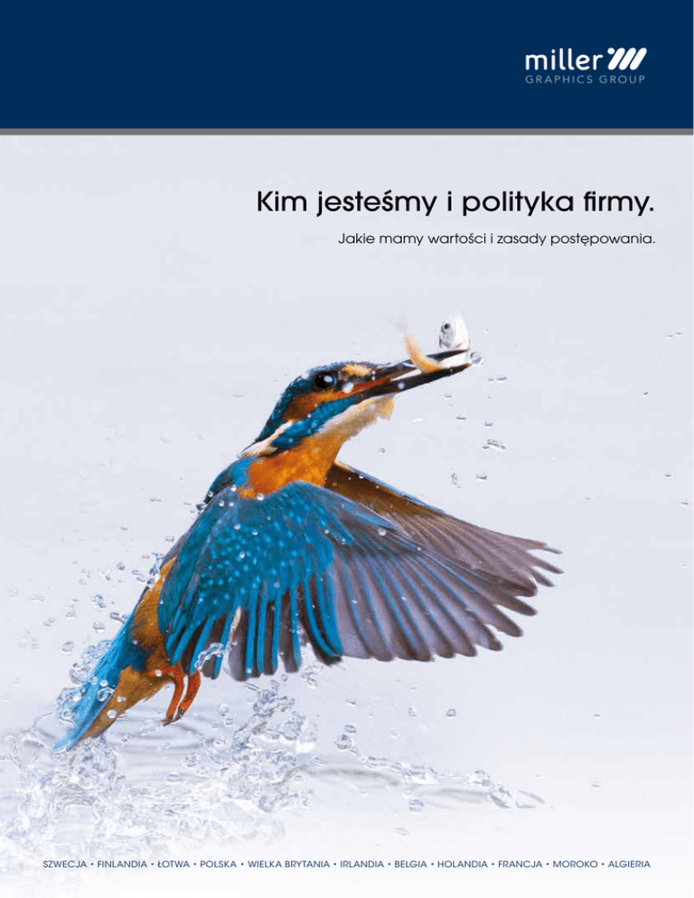 GR APHICS GROUP Kim jesteśmy i polityka firmy. Jakie mamy wartości i zasady postępowania. SZWECJA • FINLANDIA • ŁOTWA • POLSKA • WIELKA BRYTANIA • IRLANDIA • BELGIA • HOLANDIA • FRANCJA • MOROKO • ALGIERIA Właściciel Właścicielem Grupy Miller Graphics jest O.F Ahlmark & Co Eftr. A.-B., założona w 1847 roku firma rodzinna, która od początku swego istnienia skupia się na prowadzeniu odpowiedzialnego biznesu i ekologicznej produkcji. Pracujemy w środowisku międzynarodowym z różnorodnością kultur i doświadczeń. Naszą dewizą jest dawanie równych szans wszystkim pracownikom oraz zatrudnianie zarówno kobiet, jak i mężczyzn z różnym przygotowaniem zawodowym. Nasza Wizja „Wspieramy naszych klientów w ramach działań prepress” › › › › Dostarczamy modułowy system produktów i usług. Klienci mogą w elastyczny sposób skorzystać z naszych usług na dowolnym etapie procesu prepress. Dążymy do doskonałości, aby oferować korzyści wszystkim zainteresowanym stronom. Prowadzimy biznes w sposób etyczny i odpowiedzialny. Nasza Misja „Chcemy być preferowanym partnerem w łańcuchu graficznym” (od projektu do druku) design artwork repro plates & sleeves print consultancy millnet Kim jesteśmy › › › › › › › Uwagę kierujemy na indywidualne potrzeby klientów i zależy nam na długotrwałej współpracy. Rozwijamy się bazując na wymaganiach naszych klientów. Zarządzamy naszymi oddziałami w oparciu o fakty i proste zasady. Stosujemy proaktywną, otwartą i uczciwą komunikację. Rozwijamy i utrzymujemy wysoki poziom naszych umiejętności i kompetencji. Jesteśmy innowacyjni, zmotywowani i chętni do nieustannego rozwoju i nauki. W zrównoważony sposób tworzymy wartość dla naszych udziałowców. Kluczowe wartości › › › › › Na pierwszym miejscu stawiamy zadowolenie klienta. Jakość i ciągłe doskonalenie naszych produktów i usług. Praca zespołowa – łączymy nasze uzupełniające się umiejętności oraz specjalizacje. Szacunek dla WSZYSTKICH współpracowników – właścicieli, pracowników, dostawców, konkurentów, administracji publicznej. Jesteśmy odpowiedzialnym pracodawcą – motywującym pracowników do rozwoju i podnoszenia kwalifikacji. › › › › › › › › Prezentowanie dobrego kierownictwa w zarządzaniu. Kreowanie pozytywnej atmosfery socjalnej – ochrona zdrowia. Szacunek dla środowiska. Przestrzeganie przepisów prawnych. Działamy uczciwie. Bierzemy odpowiedzialność za nasze działania. Szanujemy i wypełniamy nasze umowy. Jesteśmy członkami Grupy i w jej obrębie działamy jako jeden zespół. Przestrzeganie przepisów prawnych › › › › › › Przestrzegamy prawo – jest to dla nas oczywiste i stanowi część naszych podstawowych wartości. Przeglądamy listę zmian przepisów prawnych co najmniej dwa razy w roku. W razie potrzeby korzystamy z niezależnych ekspertyz. Sprawdzamy prawa europejskie w centrali oraz krajowe w poszczególnych oddziałach. Jako Grupa dążymy do zgodności z najbardziej wymagającymi prawami obowiązującymi w krajach, w których mieszczą się nasze oddziały. Naszemu kierownictwu zgłaszamy wszelkie przypadki naruszenia przepisów. KIM JESTEŚMY I POLITYKA FIRMY Zapewnianie zgodności i standardów. › › › › Stosujemy standardowe metody raportowania. Raporty pomiarów kluczowych wskaźników efektywności są przekazywane do centrali. Przeprowadzamy wewnętrzne i zewnętrzne audyty. Odbywamy weryfikacyjne spotkania kierownictwa. Polityka Jakości Naszą polityką jakości jest posiadanie takiego systemu utrzymania jakości, aby dostarczać najlepsze produkty i usługi, mając na celu przewyższanie wymagań i oczekiwań naszych klientów. Pracownicy Grupy Miller Graphics nieustannie dokładają starań, aby osiągnąć najlepszą jakość wszystkich oferowanych produktów i usług. Nasz system zarządzania jakością ma na celu wypełnianie i przekraczanie potrzeb i wymagań systemu ISO9001. Za efektywność systemu zarządzania jakością odpowiada pełnomocnik ds. jakości danego oddziału, który składa raporty bezpośrednio u dyrektora zarządzającego. Kluczowe wskaźniki są raportowane do managerów odpowiedzialnych za dany obszar w Grupie. System zarządzania jakością będzie w sposób ciągły rozwijany i udoskonalany. System zarządzania jakością i cele jakościowe w każdym oddziale będą oceniane i uaktualniane poprzez regularne przeglądy kierownictwa zgodnie ze standardową polityką Grupy. • Przebieg zadań - Przebieg zadań ustalany jest zgodnie ze Standardowymi Procedurami Operacyjnymi (SOP) oraz za pomocą standardów obsługi i kalibracji przebiegu zadań oraz urządzeń. Wyniki kalibracji są archiwizowane i przechowywane. Raporty potrzebne do monitorowania jakości przebiegu zadań i wyniki otrzymywane są z naszego oprogramowania Millnet (MIS). Przebieg zadań oparty jest na dobrej znajomości danych klienta, zawierających wszystkie kluczowe informacje potrzebne do produktywnego i bezpiecznego przepływu pracy, uwzględniając następujące zasady i priorytety: › › RFT - Right First Time - Poprawnie juz za pierwszym razem - Przepływ pracy w Millnet jest zbudowany zgodnie z zasadą RFT – oznacza to zestaw pytań, na które trzeba odpowiedzieć przed rozpoczęciem produkcji, aby uniknąć konieczności ponownej pracy i zmiany harmonogramu produkcji. OTIF - On Time in Full - Na czas i w całosci Dokładamy wszelkich starań, aby nasze produkty i usługi były realizowane w całości bazując na specyfikacjach oraz w zgodzie z uzgodnionymi terminami. › Target driven - Kierujac sie ustalonymi celami Mierzymy nasze wyniki i ustalamy nowe cele. › Niezgodnosci - Nieustannie analizujemy niezgodności i działamy mając na celu zmniejszanie wszelkich rodzajów strat, takich jak: niezgodności, ponowna obróbka i produkcja. Polityka zrównoważonego rozwoju Grupa Miller Graphics zob