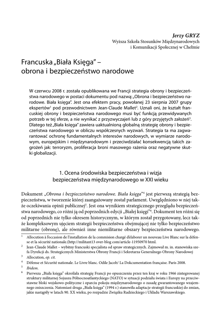 Jerzy GRYZ Wyższa Szkoła Stosunków Międzynarodowych i Komunikacji Społecznej w Chełmie Francuska „Biała Księga” – obrona i bezpieczeństwo narodowe W czerwcu 2008 r. została opublikowana we Francji strategia obrony i bezpieczeństwa narodowego w postaci dokumentu pod nazwą: „Obrona i bezpieczeństwo narodowe. Biała księga”. Jest ona efektem pracy, powołanej 23 sierpnia 2007 grupy ekspertów1 pod przewodnictwem Jean-Claude Mallet2. Uznali oni, że kształt francuskiej obrony i bezpieczeństwa narodowego musi być funkcją przewidywanych potrzeb w tej sferze, a nie wynikać z przyzwyczajeń lub z góry przyjętych założeń3. Dlatego też „Biała księga” zawiera uaktualnioną globalną strategię obrony i bezpieczeństwa narodowego w obliczu współczesnych wyzwań. Strategia ta ma zagwarantować ochronę fundamentalnych interesów narodowych, w wymiarze narodowym, europejskim i międzynarodowym i przeciwdziałać konsekwencją takich zagrożeń jak: terroryzm, proliferacja broni masowego rażenia oraz negatywne skutki globalizacji. 1. Ocena środowiska bezpieczeństwa i wizja bezpieczeństwa międzynarodowego w XXI wieku Dokument „Obrona i bezpieczeństwo narodowe. Biała księga”4 jest pierwszą strategią bezpieczeństwa, w tworzenie której zaangażowany został parlament. Uwzględniono w niej także oczekiwania opinii publicznej5. Jest ona wynikiem strategicznego przeglądu bezpieczeństwa narodowego, co różni ją od poprzednich edycji „Białej księgi”6. Dokument ten różni się od poprzednich nie tylko okresem historycznym, w którym został przygotowany, lecz także kompleksowym ujęciem strategii bezpieczeństwa obejmującej nie tylko bezpieczeństwo militarne (obronę), ale również inne niemilitarne obszary bezpieczeństwa narodowego. 1 2 3 4 5 6 Allocution à l’occasion de l’installation de la commision chargé d’elaborer un nouveau Live Blanc sur la défense et la sécurité nationale.(http://militant13 over-blog com/article-11950970 html. Jean-Claude Mallet – wybitny francuski specjalista od spraw strategicznych. Zajmował m. in. stanowiska szefa Dyrekcji ds. Strategicznych Ministerstwa Obrony Francji i Sekretarza Generalnego Obrony Narodowej Allocution, op. cit. Défense et Sécurité nationale. Le Livre blanc. Odile Jacob/ La Dokcumentation française. Paris 2008. Ibidem. Pierwsza „Biała księga” określała strategię Francji po opuszczeniu przez ten kraj w roku 1966 zintegrowanej struktury militarnej Sojuszu Północnoatlantyckiego (NATO) w sytuacji podziału świata i Europy na przeciwstawne bloki wojskowo-polityczne i oparciu pokoju międzynarodowego o zasadę gwarantowanego wzajemnego zniszczenia. Natomiast druga „Biała księga” (1994 r.) stanowiła adaptacje strategii francuskiej do zmian, jakie nastąpiły w latach 90. XX wieku, po rozpadzie Związku Radzieckiego i Układu Warszawskiego. ROCZNIK BEZPIECZEŃSTWA MIĘDZYNARODOWEGO – 2009/2010 88 Największą nowością omawianej „Białej księgi” jest właśnie kompleksowe ujęcie interesów bezpieczeństwa Republiki Francuskiej, bez ograniczania się wyłącznie do problemów obrony militarnej. Definiuje ona strategię bezpieczeństwa narodowego, która stanowi odpowiedź na całokształt wyzwań i zagrożeń mogących zagrozić życiu narodu. Bezpieczeństwo narodowe obejmuje politykę obrony militarnej, lecz nie ogranicza się do niej. Aby lepiej zapewnić obronę interesów Francji i ochronę jej ludności, strategia bezpieczeństwa narodowego wspierana jest przez politykę bezpieczeństwa wewnętrznego – w zakresie wszystkiego, co nie służy bezpieczeństwu indywidualnemu osób i dóbr lub utrzymaniu porządku – i przez politykę ochrony ludności (la securite civile). Inne polityki takie, jak polityka zagraniczna i polityka ekonomiczna, służą także bezpośrednio bezpieczeństwu narodowemu. Ponadto dokument ten zawiera ocenę środowiska i bezpieczeństwa, wyzwań i zagrożeń, cele strategii i polityki obrony w tym bezpieczeństwa narodowego, płaszczyzny i środki realizacji, a także wewnętrzne uwarunkowania sprzyjające jej urzeczywistnieniu. W dokumencie stwierdza się, że od roku 1994, daty edycji poprzedniej „Białej Księgi o obronie”, na świecie dokonała się w wyniku globalizacji jakościowa zmiana. W tym czasie miały miejsce zarówno zjawiska pozytywne, jak i negatywne. Do pozytywnych należało: zwiększenie z 40% w roku 1987 do 63% w 2007 liczby państw demokratycznych, chociaż podkreśla się iż tendencja ta dotyczyła przede wszystkim obszaru Europy. W dokumencie tym zauważono także, że połowa ludności świata żyje nadal w reżimach totalitarnych, a niektóre państwa są demokratyczne tylko z nazwy7; rozwój sieci Internetu, znacząco rozszerzył możliwości dostępu do wiedzy i wykształcenia w wymiarze globalnym. Zdaniem autorów „Białej Księgi” ta rewolucja informatyczna uczyniła świat bardziej przejrzystym, bez granic; zmniejszenie ilości konfliktów zbrojnych; wzrost zdolności mobilizacji społeczności międzynarodowej; postępy integracyjne Europy. Spośród zjawisk negatywnie oddziaływujących na sferę bezpieczeństwa za najistotniejsze uznano negatywne skutki procesów globalizacji: szybkie rozprzestrzenianie się wszelkich form kryzysów politycznych, ekonomicznych i finansowych; wzrost nacjonalizmu, fanatyzmu religijnego, wybór autorytarnych form rządzenia; nierównomierne wykorzystanie pozytywnych skutków globalizacji; szczególnie w Afryce, Azji i Ameryce Łacińskiej, które znajdują się na marginesie globalizacji. Zdaniem autorów Księgi fakt ten, w połączeniu z szybkim rozprzestrzenieniem się informacji, powoduje zagrożenie dla stabilizacji międzynarodowej; wzrost roli aktorów niepaństwowych: organizacji poza rządowych, mass – mediów, zorganizowanej przestępczości; dynamika wzrostu ekonomicznego nowych mocarstw, powodująca zaostrzenie problemu zużycia energii 