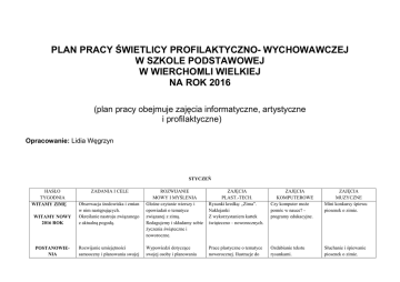 PLAN PRACY ŚWIETLICY PROFILAKTYCZNO- WYCHOWAWCZEJ W SZKOLE PODSTAWOWEJ W WIERCHOMLI WIELKIEJ NA ROK 2016 (plan pracy obejmuje zajęcia informatyczne, artystyczne i profilaktyczne) Opracowanie: Lidia Węgrzyn STYCZEŃ HASŁO TYGODNIA WITAMY ZIMĘ ZAJĘCIA PLAST.-TECH. Rysunki kredką: „Zima”. Naklejanki Z wykorzystaniem kartek świąteczno – noworocznych. ZAJĘCIA KOMPUTEROWE Czy komputer może pomóc w nauce? programy edukacyjne. ZAJĘCIA MUZYCZNE Mini konkursy śpiewu piosenek o zimie. WITAMY NOWY 2016 ROK Obserwacja środowiska i zmian w nim następujących. Określanie nastroju związanego z aktualną pogodą. ROZWIJANIE MOWY I MYŚLENIA Głośne czytanie wierszy i opowiadań o tematyce związanej z zimą. Redagujemy i składamy sobie życzenia świąteczne i noworoczne. POSTANOWIENIA Rozwijanie umiejętności samooceny i planowania swojej Wypowiedzi dotyczące swojej osoby i planowania Prace plastyczne o tematyce noworocznej. Ilustracje do Ozdabianie tekstu rysunkami. Słuchanie i śpiewanie piosenek o zimie. ZADANIA I CELE NOWOROCZNE ZWIERZĘTA WOKÓŁ NAS BEZPIECZNE FERIE ZIMOWE przyszłości. Rozróżnianie dobrych czynów od złych. przyszłości. Sporządzenie listy postanowień noworocznych. Słuchanie bajek, rozróżnianie dobra od zła, analizowanie morału bajki. Kształtowanie właściwego stosunku do zwierząt. Poznajemy zwierzęta domowe na wsi i w mieście. Poznajemy zwierzęta z innych kontynentów. Uwrażliwienie dzieci na los zwierząt. Pogadanka „Moje zwierzątko” – wypowiedzi uczniów. Czytanie ciekawostek o zwierzętach z różnych źródeł. Słuchanie wierszy i opowiadań o życiu zwierząt. Zapoznanie dzieci z różnymi sposobami spędzania czasu wolnego. Wdrażanie do zadbania o własne bezpieczeństwo na śniegu i lodzie, podczas ferii zimowych. Swobodne wypowiedzi na temat wysłuchanego wiersza o zimie. Rozmowy na temat zasad bezpieczeństwa podczas zabaw na śniegu i lodzie. Rozmowa o prawidłowym ubieraniu się zimą. wysłuchanych bajek. „Mój przyjaciel pies”- rzeźba z plasteliny. „Origami – pieski, kotki, żabki”. „Rybki w akwarium”naklejanka. Granie w gry komputerowe. Słuchanie piosenek – gra na instrumentach perkusyjnych. „Narciarz” -wykonanie formy przestrzennej w/g szablonu. „Zimowe zabawy na śniegu”wycinanka. Rysunki i kolorowanki o tematyce zimowej. „Zimowe zabawy na śniegu” – praca w Paincie. Nauka piosenki związanej z zimą . Zabawy rytmiczne przy piosenkach o tematyce zimowej. ZAJĘCIA PLAST.- TECH Wykonanie w/g szablonu maski karnawałowejzdobienie brokatem. „Projekt stroju karnawałowego”malowanie farbami. ZAJĘCIA KOMPUTEROWE Maski karnawałowe – własna inwencja twórcza. Praca z programem Paint. ZAJĘCIA MUZYCZNE Zabawy rytmicznoruchowe przy muzyce dyskotekowej, dziecięcej i młodzieżowej. LUTY HASŁO TYGODNIA KARNAWAŁ ZADANIA I CELE Tradycje balów karnawałowych. Utrwalenie nazw miesięcy i pór roku. Wdrażanie do przestrzegania zasad BHP podczas zabaw zimą. ROZWIJANIE MOWY I MYŚLENIA Wspólne czytanie przysłów i porzekadeł o Nowym Roku. Słuchanie baśni J. Porazińskiej „O dwunastu miesiącach” ze zbioru Baśni Polskich „U złotego źródła”. 2 HU…HU..HA… NASZA ZIMA ZŁA WALENTYNKI DBAMY O NASZE ZDROWIE Zachwycanie się pięknem zimy. Dbanie o higienę zdrowotną podczas zimy. Obserwacja przyrody podczas zimy. Wypowiedzi dotyczące tematyki. Słuchanie literatury pięknej mówiącej o zimie, o prawidłowym dbaniu o siebie podczas zimy. Twórczość o tematyce zimowej. ,,Krajobraz zimowy”- malowanie pastą do zębów na ciemnym tle. ,,Bałwan” - wyklejanie watą lub płatkami kosmetycznymi bałwana. „Malowanie na ekranie” – Zimowy pejzaż. Praca z programem Paint. Nauka piosenki pt. „Zima, zima” –Zabawa ruchowa do poznanej piosenki. Szukanie informacji w Inernecie nt. Rola odżywiania dla organizmu. Ćwiczenia rytmiczne do muzyki. Wykonywanie „Walentynek”. Kształtowanie nawyków higieny osobistej, otoczenia, nauki. Rola odżywiania dla organizmu. Propagowanie uprawiania sportu, znaczenie ruchu na świeżym powietrzu. Rozmowa o prawidłowym ubieraniu się zimą-„Jak dbać o swoje zdrowie zimą?” „Projekt ubioru na różne pory roku”- rysowanie pastelami. „Moje przybory toaletowe”wydzieranka z kolorowych papierków. MARZEC HASŁO TYGODNIA KOBIETKI MAŁE I DUŻE 08. 03 – DZIEŃ KOBIET RUCH TO ZDROWIE ZADANIA I CELE Rozmowa z dziećmi o roli kobiety we współczesnym świecie. Wdrażanie o dbanie o własne zdrowie. Zapoznanie ze znaczeniem hasła tygodnia. Zwrócenie uwagi na potrzebę codziennego przebywania na świeżym powietrzu i znaczenia uprawiania sportu dla organizmu. ROZWIJANIE MOWY I MYŚLENIA Czytanie wierszy i opowiadań dotyczących pracy kobiet. ZAJĘCIA PLAST.- TECH Laurki i życzenia dla dziewcząt i pań. ZAJĘCIA KOMPUTEROWE Wykonanie kartek z życzeniami z okazji Dnia Kobiet – praca w Paincie. ZAJĘCIA MUZYCZNE Słuchanie na dywanie muzyki relaksacyjnej z płyty. Przegląd czasopism o osiągnięciach różnych sportowców. Czytanie z gazet, opowiadanie uczniów o znanych im osiągnięciach Polaków w różnych dyscyplinach sportowych. Moja ulubiona dyscyplina sportowa”- malowanie plasteliną. Tworzenie własnych rysunków – praca z programem Paint. Ćwiczenia ruchowe i rytmiczne przy muzyce – aerobik. 3 PIERWSZE PODMUCHY WIOSNY Obserwacja i określanie zmian w przyrodzie związanych z wiosną. Rozwijanie spostrzegawczości poprzez obserwację otaczającej przyrody. Rozpoznawanie oznak wiosny. Czytanie i analizowanie wierszyków i przysłów o wiośnie. Rozmowa o tradycji ludowej „topienia marzanny”. Konkurs pięknego czytania wierszy o wiośnie. „Pani Wiosna”- plakat, praca zespołowa. „Przebiśnieg”- malowanie farbami, wycinanie, wykonanie formy przestrzennej. „Wiosenne kwiaty”- prace przestrzenne z kolorowej bibuły. Kolorowe motyle, biedronki, ptaki- technika mieszana. Malowanie na ekran
