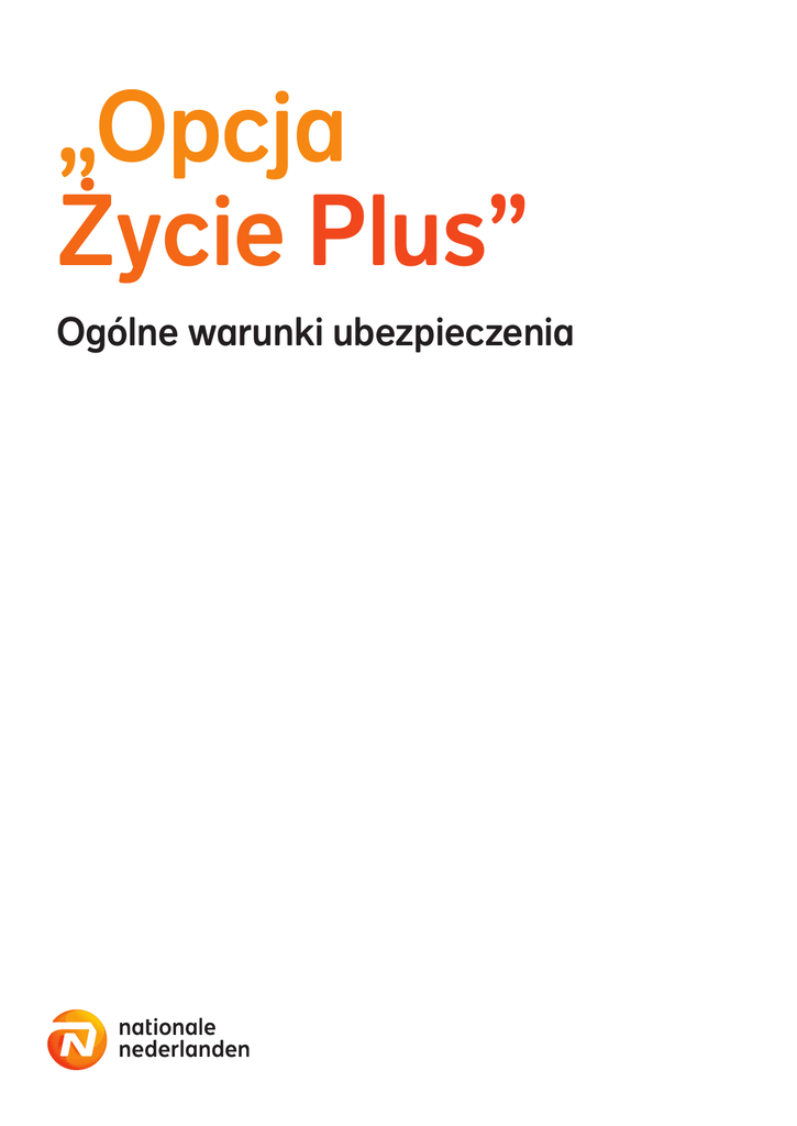 „Opcja Życie Plus” Ogólne warunki ubezpieczenia Ubezpieczenie na życie „Opcja Życie Plus” w skrócie Jakie są główne korzyści ubezpieczenia? • Zabezpiecza najbliższych – to ubezpieczenie, w ramach którego, w razie Twojej śmierci, wskazane przez Ciebie osoby otrzymają Świadczenie i będą mogły je przeznaczyć na np. uregulowanie zobowiązania wobec Banku. • Dopasowuje się do aktualnego Salda zadłużenia – Suma ubezpieczenia maleje wraz ze spłatą Kredytu i jest bezpośrednio powiązana z wartością Salda zadłużenia wobec Banku. Gdzie i kiedy działa ubezpieczenie? Od momentu rozpoczęcia ochrony ubezpieczeniowej, który jest określony w Art. 6 Ogólnych warunków ubezpieczenia, jesteś chroniony na całym świecie, 24 godziny na dobę. Umowa ubezpieczenia jest zawierana na czas określony, tzw. „Okres polisowy”. Rozpoczęcie Okresu polisowego Zakończenie Okresu polisowego Dzień zawarcia Umowy ubezpieczenia w danym roku kalendarzowym a) Dzień płatności raty Kredytu przypadający w grudniu tego samego roku kalendarzowego, albo b) Jeśli dzień płatności pierwszej raty Kredytu następujący po Dniu rozpoczęcia ochrony ubezpieczeniowej przypada w następnym roku kalendarzowym: Dzień płatności raty Kredytu przypadający w grudniu roku kalendarzowego następującego po roku kalendarzowym w którym zawarto Umowę ubezpieczenia Informacja o tym, w jaki sposób można kontynuować Umowę ubezpieczenia po zakończeniu Okresu polisowego, znajdziesz w kolejnych trzech pytaniach. Na jakich zasadach Umowa ubezpieczenia może być kontynuowana? Nationale‑Nederlanden nie gwarantuje kontynuacji ubezpieczenia na kolejne Okresy polisowe. O ile Ubezpieczony nie ukończył 65. roku życia, Nationale‑Nederlanden przed końcem każdego Okresu polisowego może, ale nie jest do tego zobowiązane, zaproponować kontynuację Umowy ubezpieczenia na kolejny Okres polisowy, o którym mowa w zdaniu następnym. Każdy kolejny Okres polisowy rozpoczyna się bezpośrednio po zakończeniu poprzedniego Okresu polisowego i trwa rok. W przypadku przygotowania przez Nationale‑Nederlanden propozycji kontynuacji Umowy ubezpieczenia, najpóźniej 15 dni przed zakończeniem Okresu polisowego Nationale‑Nederlanden przekaże Tobie te informacje za pośrednictwem Banku, na zasadach, zgodnie z którymi Bank komunikuje się z Tobą w sprawach dotyczących Twojego Kredytu. Korespondencja od 2 | Ubezpieczenie na życie „Opcja Życie Plus” w skrócie Nationale‑Nederlanden może więc zostać przekazana przy wykorzystaniu drogi elektronicznej, np.: w systemie bankowości online. Propozycja kontynuacji Umowy ubezpieczenia może także przewidywać zmianę wysokości Składki, w tym jej podwyższenie na kolejny Okres polisowy. Szczegółowe zasady kontynuacji Umowy ubezpieczenia zostały opisane w Art. 7 Ogólnych warunków ubezpieczenia. Co muszę zrobić, aby Umowa ubezpieczenia była kontynuowana? Jeśli po otrzymaniu propozycji kontynuacji Umowy ubezpieczenia opłacisz Składkę we wskazanej wysokości w pierwszym terminie płatności raty Kredytu przypadającym w nowym Okresie polisowym, Umowa ubezpieczenia będzie kontynuowana w kolejnym Okresie polisowym. Co muszę zrobić, jeżeli zdecyduję się nie kontynuować Umowy ubezpieczenia? Składka może być opłacana tylko za pośrednictwem Banku. Jeżeli więc nie zgadzasz się na kontynuację Umowy ubezpieczenia w nowym Okresie polisowym, skontaktuj się z Bankiem niezwłocznie po otrzymaniu propozycji kontynuacji Umowy ubezpieczenia, w celu odwołania w Banku dyspozycji pobierania Składki. Czy wysokość Składki może ulec zmianie? Wysokość Składki jest ustalona, jako iloczyn Stopy składki i Salda zadłużenia z dnia płatności raty Kredytu. Wartość Stopy składki podana jest w Tabeli limitów i opłat. Składka jest płatna miesięcznie w dniu płatności raty Kredytu, zgodnie z harmonogramem spłat Kredytu. W związku z tym, że Saldo zadłużenia ulega zmianie, wartość Składki również ulega zmianie. Dodatkowo Nationale‑Nederlanden może również dokonać zmiany Stopy składki w kolejnych Okresach polisowych i ten element również może być podstawą zmiany wartości Składki. Ile pieniędzy wypłaci Nationale‑Nederlanden, jeżeli coś mi się stanie? W przypadku śmierci ubezpieczonego Nationale‑Nederlanden wypłaci Sumę ubezpieczenia, którą stanowi Saldo zadłużenia z dnia śmierci, jednak nie więcej niż 700 000 zł. Kiedy Nationale‑Nederlanden nie wypłaci mi pieniędzy? Są sytuacje, kiedy Nationale‑Nederlanden nie ponosi odpowiedzialności i Świadczenie nie zostanie wypłacone. Zostało to opisane w oddzielnym rozdziale w Ogólnych warunkach ubezpieczenia. Towarzystwo nie wypłaci Świadczenia jeżeli śmierć Ubezpieczonego nastąpiła w następstwie: • działań wojennych, • aktów terroryzmu, • skażenia biologicznego, chemicznego bądź radioaktywnego, • udziału w aktach przemocy, zamieszkach, • pozostawania pod wpływem alkoholu, środków odurzających, • popełnienia przestępstwa, • prowadzenia środka transportu bez uprawnień, bądź jeżeli ten pojazd nie spełniał kryteriów dopuszczenia do ruchu, • amatorskiego bądź zawodowego uprawiania sportów wysokiego ryzyka, • wykonywania zawodów wysokiego ryzyka, • samobójstwa popełnionego w okresie dwóch lat od dnia zawarcia Umowy ubezpieczenia, • Choroby rozpoznanej lub Choroby, której objawy wystąpiły, były diagnozowane lub leczone w okresie 36 miesięcy poprzedzających dzień rozpoczęcia ochrony ubezpieczeniowej. Pełna lista wyłączeń odpowiedzialności Nationale‑Nederlanden znajduje się w Art. 12 Ogólnych warunków ubezpieczenia. Jakie zmiany mogę robić na mojej polisie? W czasie trwania Umowy ubezpieczenia można zmienić Uposażonych. Ubezpieczenie na życie „Opcja Życie Plus” w skrócie | 3 Czy mogę zrezygnować z ubezpieczenia? Możesz odstąpić od Umowy ubezpieczen