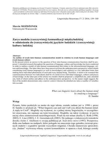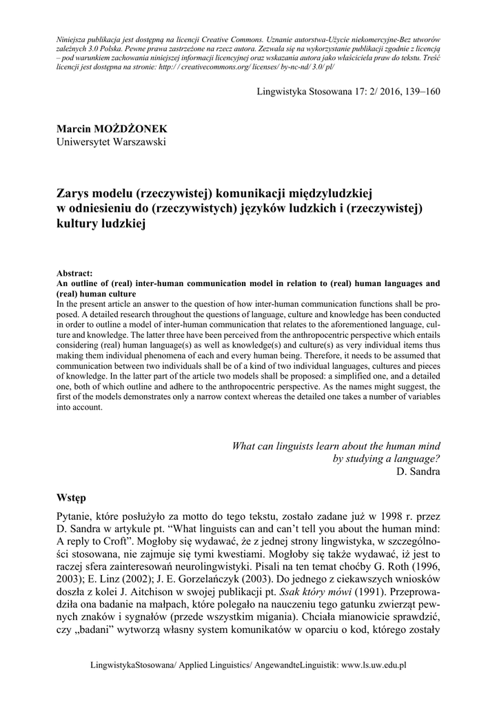 Niniejsza publikacja jest dostępną na licencji Creative Commons. Uznanie autorstwa-Użycie niekomercyjne-Bez utworów zależnych 3.0 Polska. Pewne prawa zastrzeżone na rzecz autora. Zezwala się na wykorzystanie publikacji zgodnie z licencją – pod warunkiem zachowania niniejszej informacji licencyjnej oraz wskazania autora jako właściciela praw do tekstu. Treść licencji jest dostępna na stronie: http:/ / creativecommons.org/ licenses/ by-nc-nd/ 3.0/ pl/ Lingwistyka Stosowana 17: 2/ 2016, 139–160 Marcin MOŻDŻONEK Uniwersytet Warszawski Zarys modelu (rzeczywistej) komunikacji międzyludzkiej w odniesieniu do (rzeczywistych) języków ludzkich i (rzeczywistej) kultury ludzkiej Abstract: An outline of (real) inter-human communication model in relation to (real) human languages and (real) human culture In the present article an answer to the question of how inter-human communication functions shall be proposed. A detailed research throughout the questions of language, culture and knowledge has been conducted in order to outline a model of inter-human communication that relates to the aforementioned language, culture and knowledge. The latter three have been perceived from the anthropocentric perspective which entails considering (real) human language(s) as well as knowledge(s) and culture(s) as very individual items thus making them individual phenomena of each and every human being. Therefore, it needs to be assumed that communication between two individuals shall be of a kind of two individual languages, cultures and pieces of knowledge. In the latter part of the article two models shall be proposed: a simplified one, and a detailed one, both of which outline and adhere to the anthropocentric perspective. As the names might suggest, the first of the models demonstrates only a narrow context whereas the detailed one takes a number of variables into account. What can linguists learn about the human mind by studying a language? D. Sandra Wstęp Pytanie, które posłużyło za motto do tego tekstu, zostało zadane już w 1998 r. przez D. Sandra w artykule pt. “What linguists can and can’t tell you about the human mind: A reply to Croft”. Mogłoby się wydawać, że z jednej strony lingwistyka, w szczególności stosowana, nie zajmuje się tymi kwestiami. Mogłoby się także wydawać, iż jest to raczej sfera zainteresowań neurolingwistyki. Pisali na ten temat choćby G. Roth (1996, 2003); E. Linz (2002); J. E. Gorzelańczyk (2003). Do jednego z ciekawszych wniosków doszła z kolei J. Aitchison w swojej publikacji pt. Ssak który mówi (1991). Przeprowadziła ona badanie na małpach, które polegało na nauczeniu tego gatunku zwierząt pewnych znaków i sygnałów (przede wszystkim migania). Chciała mianowicie sprawdzić, czy „badani” wytworzą własny system komunikatów w oparciu o kod, którego zostały LingwistykaStosowana/ Applied Linguistics/ AngewandteLinguistik: www.ls.uw.edu.pl Marcin MOŻDŻONEK 140 nauczone. Jak wynika z obserwacji poczynionych przez D. Sandra, kreatywne wykorzystanie języka jest właściwe tylko człowiekowi. Wracając, jednakże, do przedmiotowego pytania: czego językoznawcy mogą się dowiedzieć na temat umysłu/ mózgu ludzkiego badając język? Z jednej strony odpowiedź nasuwa się sama, z drugiej jednak, warto zdefiniować czym jest, i jak należy rozumieć język, a co za tym idzie, i kultura (jak wykażę poniżej, są to dwie rzeczy ze sobą nierozerwalnie związane). Na podstawie definicji tych dwóch pojęć, a także zarysu tego, czym jest wiedza, przedstawię dwa modele rzeczywistej komunikacji międzyludzkiej – uproszczony i „rozszerzony”. 1. (Rzeczywisty) język Rozważania na temat języka, jego samego, jego istoty oraz, mówiąc wprost, czym właściwie jest, toczą się już od niepamiętnych czasów. Przypuszcza się z dużą dozą prawdopodobieństwa, iż pierwszą gramatykę funkcjonalną, czy też opisową, stworzył Panini żyjący na przełomie V i IV w. p.n.e. na terenie dzisiejszych Indii. W europejskiej starożytności prowadzono dyskusje na temat tego, czy językiem rządzą anomalie, czy też zachowuje się on w sposób logiczny. W toku historii, gdy granice się przesuwały (a właściwie w większości przypadków były przesuwane), królowie odchodzili i przychodzili, spory na temat język nieco przygasły, choć nie wygasły zupełnie. Ponownym większym zainteresowaniem językoznawstwo zaczęło się cieszyć za sprawą niemieckiego filozofa, Wilhelma von Humboldta. Zgodnie z określeniem, którego użył F. Schlegel, zajmował się on językoznawstwem historyczno-porównawczym. Po nim nastąpiła era młodogramatyków, którzy, choć mieli swoje zasługi dla rozwoju światowego językoznawstwa, język pragnęli obserwować i badać jedynie z perspektywy nauk przyrodniczo-filozoficznych. Prawdziwy rozwój w pojmowaniu języka, jego istoty i znaczenia ropoczął sie dopiero za sprawą strukturalizmu. To właśnie w tym czasie pojawia się twierdzenie o znakach językowych, trójpodział języka na language-langue-parole, dokonany przez Ferdinanda de Saussure’a. W tym samym czasie żyło wielu wybitnych lingwistów. Warto wymienić choćby Sapira, Trubeckiego i, nieco późniejszego, Jakobsona. W tym miejscu wydaje mi się, iż należałoby skupić się na rodzimym językoznawcy, który tworzył w tym samym czasie co F. de Saussure, a na pewno znał jego prace na temat języka. Chodzi mianowicie o Jana Baudouin de Courtenay’a. Jako pierwszy zaczął postrzegać język jako coś indywidualnego, jako wrodzoną i przynależną tylko jednostce właściwość człowieka: Tak np. odróżniamy indywiduum w przeciwstawieniu do plemienia, do narodu; a więc z naszego stanowiska będziemy mieli język indywidualny i język plemienia albo narodu, rozwój indywidualno-językowy w różnicy od historii języka całego plemienia lub narodu (J.N. Baudouin de Courtenay 1974: 181). Z kolei w jednej ze swoich p