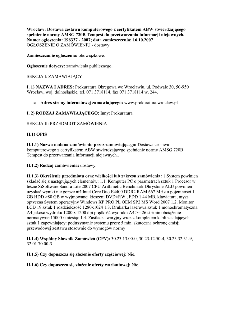Wrocław: Dostawa zestawu komputerowego z certyfikatem ABW stwierdzającego spełnienie normy AMSG 720B Tempest do przetwarzania informacji niejawnych. Numer ogłoszenia: 196337 - 2007; data zamieszczenia: 16.10.2007 OGŁOSZENIE O ZAMÓWIENIU - dostawy Zamieszczanie ogłoszenia: obowiązkowe. Ogłoszenie dotyczy: zamówienia publicznego. SEKCJA I: ZAMAWIAJĄCY I. 1) NAZWA I ADRES: Prokuratura Okręgowa we Wrocławiu, ul. Podwale 30, 50-950 Wrocław, woj. dolnośląskie, tel. 071 3718114, fax 071 3718114 w. 244. • Adres strony internetowej zamawiającego: www.prokuratura.wroclaw.pl I. 2) RODZAJ ZAMAWIAJĄCEGO: Inny: Prokuratura. SEKCJA II: PRZEDMIOT ZAMÓWIENIA II.1) OPIS II.1.1) Nazwa nadana zamówieniu przez zamawiającego: Dostawa zestawu komputerowego z certyfikatem ABW stwierdzającego spełnienie normy AMSG 720B Tempest do przetwarzania informacji niejawnych.. II.1.2) Rodzaj zamówienia: dostawy. II.1.3) Określenie przedmiotu oraz wielkości lub zakresu zamówienia: 1 System powinien składać się z następujących elementów: 1.1. Komputer PC o parametrach sztuk 1 Procesor w teście SiSoftware Sandra Lite 2007 CPU Arithmetic Benchmark Dhrystone ALU powinien uzyskać wyniki nie gorsze niŜ Intel Core Duo E4400 DDR2 RAM 667 MHz o pojemności 1 GB HDD >80 GB w wyjmowanej kieszeni DVD±RW , FDD 1,44 MB, klawiatura, mysz optyczna System operacyjny Windows XP PRO PL OEM SP2 MS Word 2007 1.2. Monitor LCD 19 sztuk 1 rozdzielczość 1280x1024 1.3. Drukarka laserowa sztuk 1 monochromatyczna A4 jakość wydruku 1200 x 1200 dpi prędkość wydruku A4 >= 26 str/min obciąŜenie normatywne 15000 / miesiąc 1.4. Zasilacz awaryjny wraz z kompletem kabli zasilających sztuk 1 zapewniający: podtrzymanie systemu przez 5 min. skuteczną ochronę emisji przewodowej zestawu stosownie do wymogów normy II.1.4) Wspólny Słownik Zamówień (CPV): 30.23.13.00-0, 30.23.12.50-4, 30.23.32.31-9, 32.01.70.00-3. II.1.5) Czy dopuszcza się złoŜenie oferty częściowej: Nie. II.1.6) Czy dopuszcza się złoŜenie oferty wariantowej: Nie. II.2) CZAS TRWANIA ZAMÓWIENIA LUB TERMIN WYKONANIA: data zakończenia: 21.12.2007. SEKCJA III: INFORMACJE O CHARAKTERZE PRAWNYM, EKONOMICZNYM, FINANSOWYM I TECHNICZNYM III.1) WARUNKI DOTYCZĄCE ZAMÓWIENIA • Informacja na temat wadium: nie wymagane. III.2) WARUNKI UDZIAŁU • • Opis warunków udziału w postępowaniu oraz opis sposobu dokonywania oceny spełniania tych warunków: 1. Sytuacja finansowa. Mieć dostęp lub dysponować środkami finansowymi wystarczającymi do realizacji zamówienia. 2. Zaplecze logistyczne. Posiadać odpowiedni sprzęt i urządzenia umoŜliwiające realizację zamówienia. 3. Doświadczenia zawodowe. Wykonawcy powinni posiadać odpowiednie doświadczenie zawodowe i potwierdzone wykonanie w ciągu ubiegłych trzech lat, co najmniej trzech dostaw o charakterze i złoŜoności porównywalnej z przedmiotem zamówienia, z podaniem ich wartości, dat wykonania oraz odbiorców, na załączniku nr 2. Informacja o oświadczeniach i dokumentach, jakie mają dostarczyć wykonawcy w celu potwierdzenia spełniania warunków udziału w postępowaniu: 1. Formularz zawierający ceny poszczególnych zestawów /Zał. Nr 1./. 2. Formularz oferty /jak na załączonym druku lub w oparciu o załączony druk/. 3. Oświadczenie wykonawcy w trybie artykułu 22 ust. 1 Ustawy z dnia 29 stycznia 2004 r . - Prawo zamówień publicznych /Dz. U. Nr 19 z 09.02.2004 r., poz. 177 z późn. zmianami/ na formularzu stanowiącym załącznik do Instrukcji dla wykonawców stwierdzające m.in.,. Ŝe wykonawca nie podlega wykluczeniu z postępowania na podstawie artykułu 24 Ustawy. 4. Aktualny odpis z właściwego rejestru albo zaświadczenie o wpisie do ewidencji działalności gospodarczej wystawionego nie wcześniej niŜ 6 miesięcy przed upływem terminu składania ofert. 5. Zaświadczenie z urzędu skarbowego o niezaleganiu z podatkiem, wystawione nie wcześniej niŜ 3 miesiące przed upływem składania ofert. 6. Zaświadczenie z ZUS o niezaleganiu z płatnością składek, wystawione nie wcześniej niŜ 3 miesiące przed upływem składania ofert. 7. Wykaz analogicznych dostaw zrealizowanych w okresie ostatnich trzech lat, z podaniem ich wartości, dat wykonania oraz odbiorców, na załączniku nr 2. SEKCJA IV: PROCEDURA IV.1) TRYB UDZIELENIA ZAMÓWIENIA IV.1.1) Tryb udzielenia zamówienia: przetarg nieograniczony. IV.2) KRYTERIA OCENY OFERT IV.2.1) Kryteria oceny ofert: najniŜsza cena. IV.2.2) Wykorzystana będzie aukcja elektroniczna: Nie. IV.3) INFORMACJE ADMINISTRACYJNE IV.3.1) Adres strony internetowej, na której dostępna jest specyfikacja istotnych warunków zamówienia: www.prokuratura.wroclaw.pl Specyfikację istotnych warunków zamówienia moŜna uzyskać pod adresem: Prokuratura Okręgowa Wrocław ul. Podwale 30 pok. 18 w godz. od 9:00 do 15:00 w dni robocze.. IV.3.4) Termin składania wniosków o dopuszczenie do udziału w postępowaniu lub ofert: 24.10.2007 godzina 11:00, miejsce: Prokuratura Okręgowa we Wrocławiu ul. Podwale 30 pok. 18. IV.3.5) Termin związania ofertą: 24.11.2007.