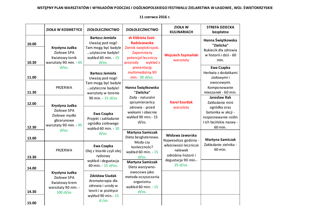 WSTĘPNY PLAN WARSZTATÓW I WYKŁADÓW PODCZAS I OGÓLNOPOLSKIEGO FESTIWALU ZIELARSTWA W ŁAGOWIE , WOJ. ŚWIETOKRZYSKIE 11 czerwca 2016 r. ZIOŁA W KOSMETYCE 10.00 10.30 11.00 11.30 12.00 12.30 13.00 13.30 14.00 14.30 15.00 ZIOŁOLECZNICTWO ZIOŁOLECZNICTWO ZIOŁA W KULINARIACH STREFA DZIECKA bezpłatne Bartosz Jemioła dr Elżbieta SzotHanna Świątkowska Uważaj pod nogi! Radziszewska "Zielicha" Krystyna Judka Tam mogą być badyle Zielnik świętokrzyski. Bukiecik dla zdrowia Ziołowe SPA …użyteczne badyle! Zapomniany Wojciech Szymański w historii i dziś - 60 Kwiatowy tonik wykład 60 min. - 15 potencjał leczniczy warsztaty min. warsztaty 90 min. - 65 zł/os. przyrody wykład z zł/os. prezentacją Ewa Czapka multimedialną 90 Herbata z dodatkami Bartosz Jemioła min.30 zł/os. ziołowymi i Uważaj pod nogi! owocowymi. Tam mogą być badyle PRZERWA Hanna Świątkowska Komponowanie …użyteczne badyle! mieszanek - 60 min. "Zielicha" warsztaty w terenie Zioła - naturalni Jarosław Rak 90 min. - 15 zł/os sprzymierzeńcy Karol Szurdak Zakładanie mini Krystyna Judka zdrowia - przed warsztaty ogródka oraz Ziołowe SPA wiekami i obecnie botanika w akcji Ewa Czapka Ziołowe mydło wykład 90 min.15 rozpoznawanie roślin Projekt i zakładanie glicerynowe zł/os. i ich łacińskie nazwy warsztaty 90 min. - 95 ogródka ziołowego 60 min. wykład 60 min. - 10 zł/os. Martyna Samiczak zł/os. Wisława Jaworska Dieta bezglutenowa. Martyna Samiczak Najweselsza godzina Moda czy właściwości lecznicze Zakładanie zielnika Ewa Czapka koniecznośc? 60 min. PRZERWA nalewek Olej z lnianki czyli olej wykład 60 min. - 15 odrobina historii i rydzowy zł/os. degustacja 90 min.wykład i degustacja Martyna Samiczak 25 zł/os. 60 min. - 15 zł/os. Dieta warzywnoowocowa jako Krystyna Judka Zdzisław Siudak metoda oczyszczania Ziołowe SPA Aromaterapia dla organizmu Kwiatowy krem zdrowia i urody w wykład 60 min. - 15 warsztaty 90 min. teorii i w praktyce zł/os. 100 zł/os wykład 90 min.- 15 zł./os 15.30 16.00 16.30 17.00 PRZERWA Krystyna Judka Ziołowe SPA Dezodorant jako płyn dezynfekcyjny i coś dla sportowca warsztaty 90 min. - 75 zł/os. *Pola zaznaczone na czerwono wymagają jeszcze potwierdzenia. Zmianom mogą ulec także godziny warsztatów. Zatwierdzony program podamy wkrótce.
