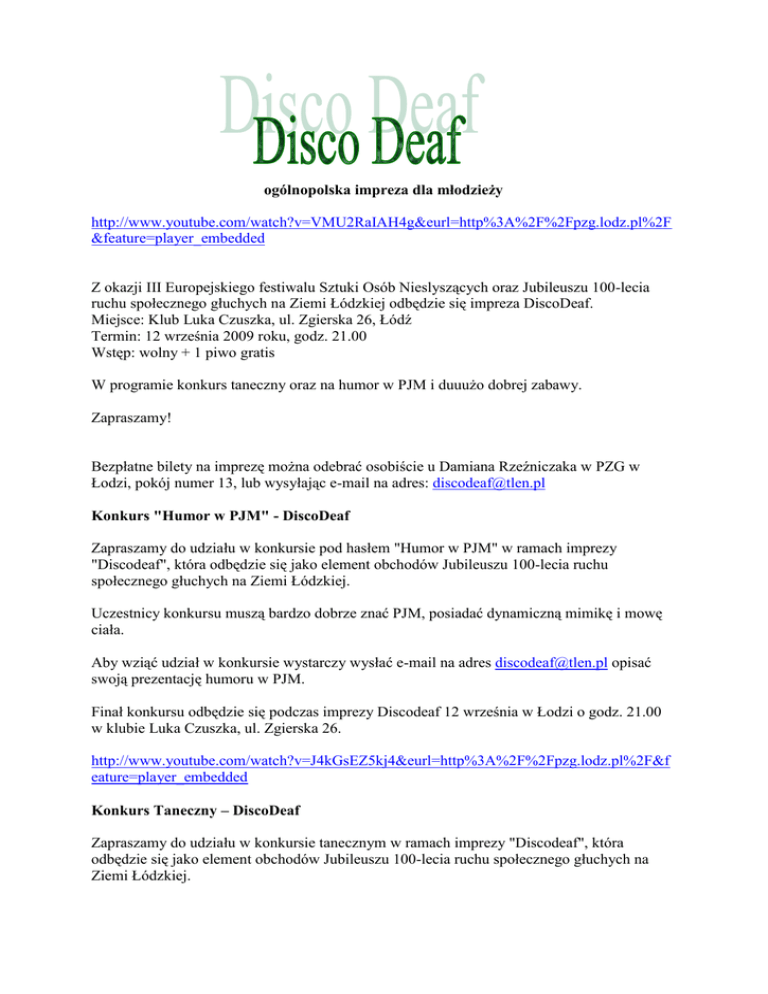 ogólnopolska impreza dla młodzieży http://www.youtube.com/watch?v=VMU2RaIAH4g&eurl=http%3A%2F%2Fpzg.lodz.pl%2F &feature=player_embedded Z okazji III Europejskiego festiwalu Sztuki Osób Nieslyszących oraz Jubileuszu 100-lecia ruchu społecznego głuchych na Ziemi Łódzkiej odbędzie się impreza DiscoDeaf. Miejsce: Klub Luka Czuszka, ul. Zgierska 26, Łódź Termin: 12 września 2009 roku, godz. 21.00 Wstęp: wolny + 1 piwo gratis W programie konkurs taneczny oraz na humor w PJM i duuużo dobrej zabawy. Zapraszamy! Bezpłatne bilety na imprezę można odebrać osobiście u Damiana Rzeźniczaka w PZG w Łodzi, pokój numer 13, lub wysyłając e-mail na adres: [email protected] Konkurs "Humor w PJM" - DiscoDeaf Zapraszamy do udziału w konkursie pod hasłem "Humor w PJM" w ramach imprezy "Discodeaf", która odbędzie się jako element obchodów Jubileuszu 100-lecia ruchu społecznego głuchych na Ziemi Łódzkiej. Uczestnicy konkursu muszą bardzo dobrze znać PJM, posiadać dynamiczną mimikę i mowę ciała. Aby wziąć udział w konkursie wystarczy wysłać e-mail na adres [email protected] opisać swoją prezentację humoru w PJM. Finał konkursu odbędzie się podczas imprezy Discodeaf 12 września w Łodzi o godz. 21.00 w klubie Luka Czuszka, ul. Zgierska 26. http://www.youtube.com/watch?v=J4kGsEZ5kj4&eurl=http%3A%2F%2Fpzg.lodz.pl%2F&f eature=player_embedded Konkurs Taneczny – DiscoDeaf Zapraszamy do udziału w konkursie tanecznym w ramach imprezy "Discodeaf", która odbędzie się jako element obchodów Jubileuszu 100-lecia ruchu społecznego głuchych na Ziemi Łódzkiej. Aby wziąć udział w konkursie wystarczy wysłać e-mail na adres [email protected] opisać, co chcesz pokazać i czy wystąpisz indywidualnie czy w grupie. Finał konkursu odbędzie się podczas imprezy Discodeaf 12 września w Łodzi o godz. 21.00 w klubie Luka Czuszka, ul. Zgierska 26. Zapraszamy! http://www.youtube.com/watch?v=6kVBzqzcMVQ&eurl=http%3A%2F%2Fpzg.lodz.pl%2F &feature=player_embedded