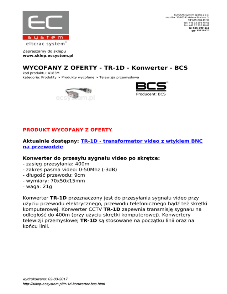 ELTCRAC System Spółka z o.o. siedziba: 30-803 Kraków ul.Ruciana 3, NIP 679-278-49-99 tel: +48 12 292 48 61 fax:+48 12 292 48 62 tel 535-999-116 gg: 35229170 Zapraszamy do sklepu www.sklep.ecsystem.pl WYCOFANY Z OFERTY - TR-1D - Konwerter - BCS kod produktu: 4183M kategoria: Produkty > Produkty wycofane > Telewizja przemysłowa Producent: BCS PRODUKT WYCOFANY Z OFERTY Aktualnie dostępny: TR-1D - transformator video z wtykiem BNC na przewodzie Konwerter do przesyłu sygnału video po skrętce: - zasięg przesyłania: 400m - zakres pasma video: 0-50Mhz (-3dB) - długość przewodu: 9cm - wymiary: 70x50x15mm - waga: 21g Konwerter TR-1D przeznaczony jest do przesyłania sygnału video przy użyciu przewodu elektrycznego, przewodu telefonicznego bądź też skrętki komputerowej. Konwerter CCTV TR-1D zapewnia transmisję sygnału na odległość do 400m (przy użyciu skrętki komputerowej). Konwertery telewizji przemysłowej TR-1D są stosowane na początku linii oraz na końcu linii. wydrukowano: 02-03-2017 http://sklep-ecsystem.pl/tr-1d-konwerter-bcs.html