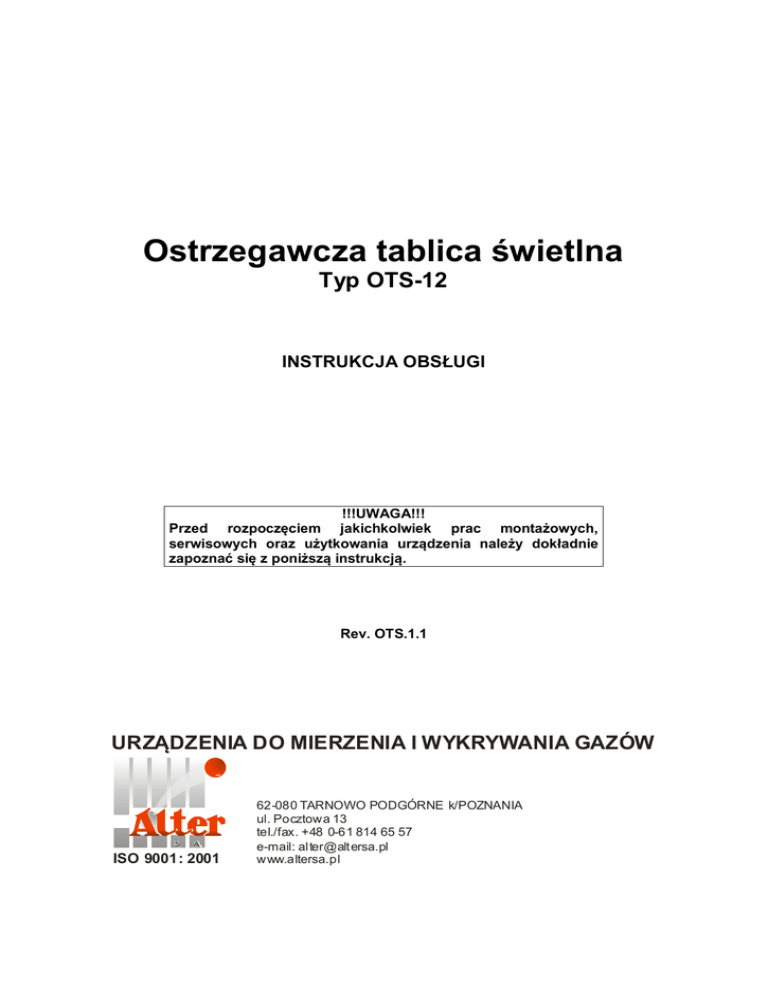 Ostrzegawcza tablica świetlna Typ OTS-12 INSTRUKCJA OBSŁUGI !!!UWAGA!!! Przed rozpoczęciem jakichkolwiek prac montażowych, serwisowych oraz użytkowania urządzenia należy dokładnie zapoznać się z poniższą instrukcją. Rev. OTS.1.1 URZĄDZENIA DO MIERZENIA I WYKRYWANIA GAZÓW ISO 9001: 2001 62-080 TARNOWO PODGÓRNE k/POZNANIA ul. Pocztowa 13 tel./fax. +48 0-61 814 65 57 e-mail: [email protected] www.altersa.pl SPIS TREŚCI OSTRZEŻENIA I ŚRODKI OSTROŻNOŚCI ...........................................................................3 PRZEZNACZENIE I OGÓLNA CHARAKTERYSTYKA URZĄDZENIA ...................................5 MONTAŻ I PODŁĄCZANIE TABLICY ....................................................................................6 Montaż tablicy świetlnej ..........................................................................................................7 Dokonywanie połączeń...........................................................................................................7 ZALECENIA EKSPLOATACYJNE ..........................................................................................9 PODSTAWOWE PARAMETRY TECHNICZNE ......................................................................9 2 OSTRZEŻENIA I ŚRODKI OSTROŻNOŚCI Niewłaściwe wykonywanie niektórych procedur lub wykonywanie ich w niewłaściwych warunkach może wpływać na pracę urządzenia. W celu zapewnienia pełnego bezpieczeństwa i odpowiednich parametrów przyrządu proszę dokładnie przeczytać i zapoznać się z poniższymi procedurami i ostrzeżeniami. Przed rozpoczęciem użytkowania urządzenia należy bezwzględnie przeczytać w całości poniższą instrukcję. Zabrania się samodzielnego dokonywania jakichkolwiek napraw i zmian w układzie przyrządu. Urządzenie należy używać wyłącznie zgodnie z przeznaczeniem i opisami zawartymi w poniższej instrukcji, w przeciwnym razie urządzenie może działać nieprawidłowo i nie gwarantować bezpieczeństwa użytkownikowi. Nie należy używać uszkodzonego lub częściowo niesprawnego urządzenia. W przypadku stwierdzenia uszkodzenia, lub nieprawidłowości w pracy należy skontaktować się z producentem urządzenia lub jego autoryzowanym serwisem. Żadnego z elementów układu nie należy narażać na udary elektryczne, mechaniczne, działanie cieczy, dużej ilości pyłów i innych zanieczyszczeń. Pod żadnym pozorem nie wolno używać urządzenia w strefie zagrożenia wybuchem! Grozi to spowodowaniem pożaru lub wybuchu przez urządzenie. 3 Utylizacja zużytego sprzętu elektrycznego i elektronicznego. Symbol ten umieszczony na produkcie, jego instrukcji obsługi lub jego opakowaniu stanowi, że produkt ten nie może być traktowany jako odpad gospodarstwa domowego (odpad komunalny). Powinien być przekazany do odpowiedniego punktu zbiórki zużytego sprzętu elektrycznego i elektronicznego. Poprzez zapewnienie odpowiedniego składowania, pomożesz zapobiec negatywnym skutkom grożącym środowisku i ludzkiemu zdrowiu w przypadku niewłaściwego składowania. Recykling pomaga zachować naturalne zasoby. W celu uzyskania dokładniejszych informacji na temat recyklingu, proszę skontaktować się z Państwa lokalnym urzędem miasta lub gminy, z lokalną firmą zajmującą się wywozem odpadów, lub producentem urządzenia. Opakowanie wielokrotnego użytku. Opakowanie przeznaczone do recyklingu. Powyższe dwa symbole dotyczą opakowania urządzenia. Urządzenie na czas transportu zostało zabezpieczone przed uszkodzeniem przez opakowanie. Po rozpakowaniu urządzenia prosimy Państwa o usuniecie elementów opakowania w sposób nie zagrażający środowisku. 4 PRZEZNACZENIE I OGÓLNA CHARAKTERYSTYKA URZĄDZENIA Tablica świetlna jest elementem dodatkowym systemów detekcyjnych gazów. Może ona współpracować zarówno z systemami detekcji gazów toksycznych w garażach podziemnych, jak i innymi. Jej zadaniem jest wygenerowanie świetlnego (lub dodatkowo akustycznego) sygnału ostrzegawczego przed niebezpieczeństwem wystąpienia zagrożenia gazami toksycznymi, wybuchowymi lub ubytkiem tlenu. Napis na tablicy może być standardowy lub uzależniony od konkretnego zagrożenia oraz ostrzeżenia potencjalnych osób mogących znaleźć się w niebezpiecznej strefie. Standardowe treści napisów to: „TLENEK WĘGLA OPUŚCIĆ GARAŻ”, „TLENEK WĘGLA NIE WCHODZIĆ”, „TLENEK WĘGLA NIE WJEŻDŻAĆ”. Na życzenie wykonujemy inne treści napisów na tablicy, dostosowane do wymagań użytkownika. Urządzenie generuje przerywany sygnał świetlny koloru czerwonego (lub dodatkowo akustyczny) o częstotliwości około 1/2Hz, który podświetla napis wykonany na płycie czołowej. Urządzenie może współpracować z wieloma typami urządzeń detekcyjnych posiadających wyjściowe przekaźniki sprzęgnięte z progami alarmowymi (SMART, SDG, SSO-2004, MSMR-4). Tablica może być zasilana bezpośrednio z napięcia stałego 12VDC lub poprzez zasilacz ZS-12 z napięcia 230VAC/50Hz. Całość układu zabudowana jest w ramce o wymiarach 555x155x20mm. Ramka posiada dwie zawieszki umożliwiające zawieszenie tablicy. Urządzenie nie jest przeznaczone do stosowania w strefach zagrożenia wybuchowego. Rys.1. Widok i podstawowe wymiary tablicy OTS-12 5 MONTAŻ I PODŁĄCZANIE TABLICY Aby urządzenie mogło poprawnie funkcjonować należy je odpowiednio zamontować i podłączyć. Czynności te należy wykonać zgodnie z poniższym opisem. Montaż urządzenia i instalacji kablowych należy powierzyć osobom wykwalifikowanym, posiadającym odpowiednią wiedzę i uprawnienia. Podczas montażu należy zwrócić szczególną uwagę na przestrzeganie przepisów BHP, ochrony przed porażeniem prądem elektrycznym oraz wszystkich innych przepisów dotyczących pomieszczenia w którym dokonywany będzie montaż. (Patrz także: „Ostrzeżenia i istotne uwagi”.) Montaż urządzenia w pomieszczeniach o szczególnie uciążliwych warunkach (du