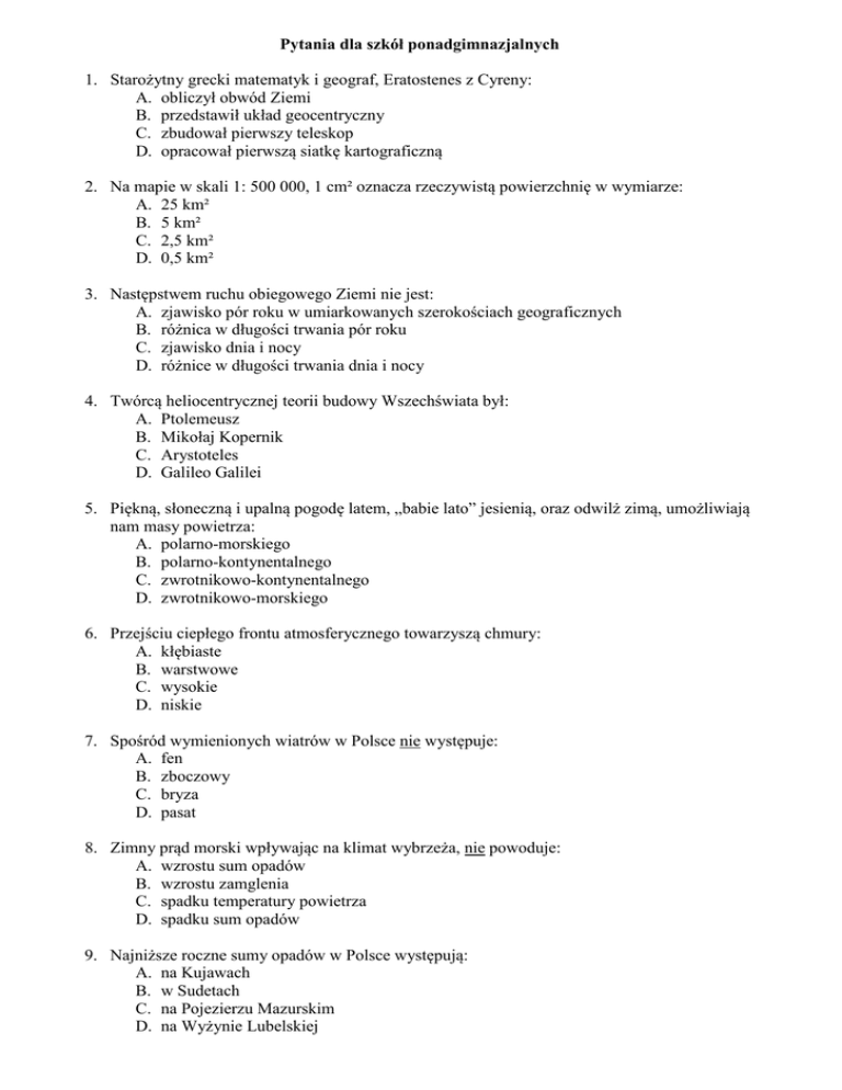 Pytania dla szkół ponadgimnazjalnych 1. Starożytny grecki matematyk i geograf, Eratostenes z Cyreny: A. obliczył obwód Ziemi B. przedstawił układ geocentryczny C. zbudował pierwszy teleskop D. opracował pierwszą siatkę kartograficzną 2. Na mapie w skali 1: 500 000, 1 cm² oznacza rzeczywistą powierzchnię w wymiarze: A. 25 km² B. 5 km² C. 2,5 km² D. 0,5 km² 3. Następstwem ruchu obiegowego Ziemi nie jest: A. zjawisko pór roku w umiarkowanych szerokościach geograficznych B. różnica w długości trwania pór roku C. zjawisko dnia i nocy D. różnice w długości trwania dnia i nocy 4. Twórcą heliocentrycznej teorii budowy Wszechświata był: A. Ptolemeusz B. Mikołaj Kopernik C. Arystoteles D. Galileo Galilei 5. Piękną, słoneczną i upalną pogodę latem, „babie lato” jesienią, oraz odwilż zimą, umożliwiają nam masy powietrza: A. polarno-morskiego B. polarno-kontynentalnego C. zwrotnikowo-kontynentalnego D. zwrotnikowo-morskiego 6. Przejściu ciepłego frontu atmosferycznego towarzyszą chmury: A. kłębiaste B. warstwowe C. wysokie D. niskie 7. Spośród wymienionych wiatrów w Polsce nie występuje: A. fen B. zboczowy C. bryza D. pasat 8. Zimny prąd morski wpływając na klimat wybrzeża, nie powoduje: A. wzrostu sum opadów B. wzrostu zamglenia C. spadku temperatury powietrza D. spadku sum opadów 9. Najniższe roczne sumy opadów w Polsce występują: A. na Kujawach B. w Sudetach C. na Pojezierzu Mazurskim D. na Wyżynie Lubelskiej 10. Poniższa rycina przedstawia jeden z typów wydm. Jest to: A. barchan B. wydma paraboliczna C. wydma gwiaździsta D. wydma poprzeczna 11. Procesy eoliczne zachodzą dzięki działalności: A. morza B. wiatru C. lodowca górskiego D. lodowca kontynentalnego 12. Przedstawiony na fotografii typ wybrzeża powstał w wyniku: A. deflacji B. korazji C. insolacji D. abrazji 13. W wyniku bezpośredniej działalności lodu lodowca kontynentalnego powstaje: A. morena czołowa B. pradolina C. sandr D. oz 14. Spośród podanych gleb, wybierz tę o najniższej żyzności: A. czarnoziem B. czarna ziemia C. bielica D. rędzina 15. Które z wymienionych zbiorowisk roślinnych nie występuje w Polsce: A. grąd B. makia C. ols D. łęg 16. Europejska Sieć Ekologiczna jest systemem ochrony zagrożonych składników różnorodności biologicznej, wdrażanym od 1992 r. w sposób spójny pod względem metodycznym i organizacyjnym na terytorium wszystkich państw członkowskich Unii Europejskiej. Podaj jej nazwę. A. Eko-Europa B. Zielona Sieć 1992 C. Natura 2000 D. Green Europe 2000 17. Rozpoznaj park narodowy po opisie: Obszar chroniący pasmo gór orogenezy alpejskiej, bogate w formy polodowcowe, oraz krasowe. Jego symbolem jest kozica. A. Karkonoski Park Narodowy B. Tatrzański Park Narodowy C. Pieniński Park Narodowy D. Gorczański Park Narodowy 18. Wskaż państwa o ujemnym przyroście naturalnym: A. Uganda, Kongo, Etiopia B. Kanada, USA, Meksyk C. Litwa, Ukraina, Białoruś D. Argentyna, Brazylia, Chile 19. Obszary na kuli ziemskiej, których warunki środowiska przyrodniczego, pozwalają na stałe osadnictwo i gospodarcze wykorzystanie terenu, to: A. paraekumena B. subekumena C. ekumena D. anekumena 20. Na podstawie opisu rozpoznaj, której religii dotyczy opis: Religia monoteistyczna, łącząca często zasady życia religijnego z organizacją państwa, a jej wyznawcy są zobowiązani do przestrzegania pięciu filarów wiary, m.in. ramadanu. A. buddyzmu B. hinduizmu C. judaizmu D. islamu 21. Proces polegający na zwrocie uprzednim właścicielom lub ich następcom prawnym mienia przejętego przez państwo w drodze nacjonalizacji lub wywłaszczenia, to: A. prywatyzacja B. reprywatyzacja C. restrukturyzacja D. modernizacja 22. Rolnictwo intensywne, charakteryzujące się dużymi nakładami pracy i kapitału na jednostkę powierzchni, jest typowe dla państw: A. Holandia i Francja B. Indie i Pakistan C. Brazylia i Argentyna D. Rumunia i Bułgaria 23. Największy port morski Europy znajduje się w: A. Londynie B. Hamburgu C. Gdańsku D. Rotterdamie 24. Miernik HDI (Human Development Index) stosowany na świecie opisuje efekty w zakresie: A. rozwoju gospodarczego B. rozwoju społecznego C. rozwoju konkurencyjności gospodarczej D. rozwoju konsumpcji 25. Do Unii Europejskiej nie należą: A. Cypr, Malta B. Słowenia, Portugalia C. Litwa, Łotwa D. Norwegia, Islandia 26. Rzeki polskie nie należą do zlewiska morza: A. Śródziemnego B. Bałtyckiego C. Północnego D. Czarnego 27. Największa dobowa różnica temperatury powietrza występuje: A. na pustyniach B. w lesie równikowym C. na Antarktydzie D. w mieście strefy umiarkowanej 28. Falę pływów morskich (przypływu i odpływu) wywołuje: A. wiatr B. przyciąganie Księżyca C. ruch obiegowy Ziemi D. tsunami 29. Średnia powierzchnia gospodarstw rolnych w Polsce wynosi około: A. powyżej 20 ha B. poniżej 10 ha C. poniżej 30 ha D. powyżej 50 ha 30. Na Liście Światowego Dziedzictwa Kulturowego i Przyrodniczego UNESCO znajduje się: A. Hala Stulecia we Wrocławiu B. Jasna Góra w Częstochowie C. Kampinoski Park Narodowy D. Starówka Gdańska