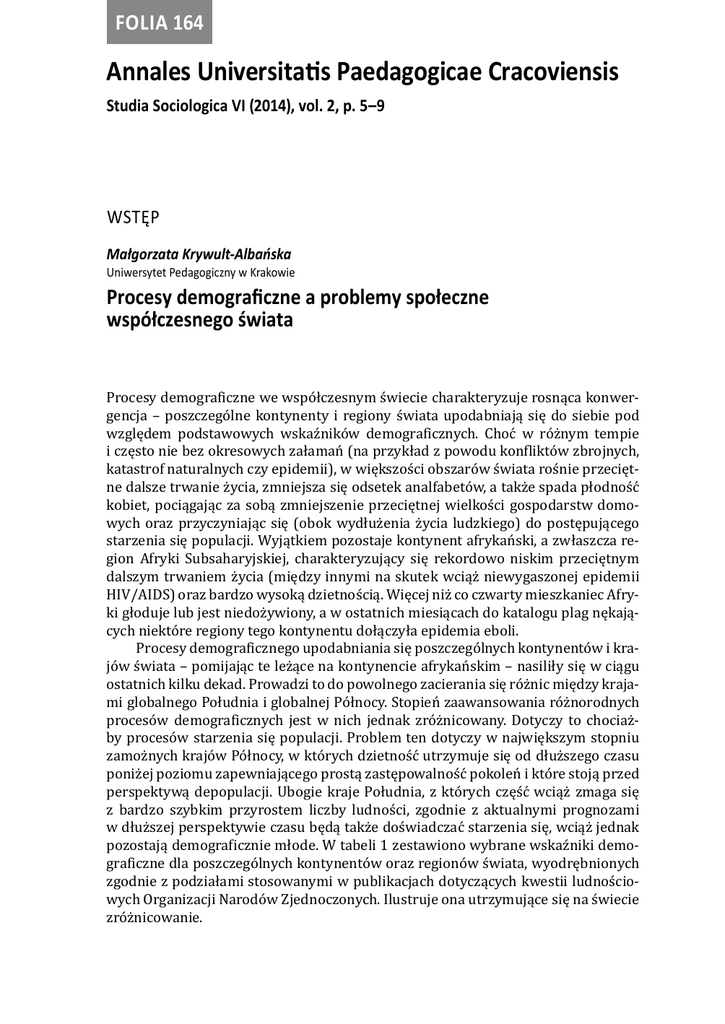FOLIA 164 Annales Universitatis Paedagogicae Cracoviensis Studia Sociologica VI (2014), vol. 2, p. 5–9 WSTĘP Małgorzata Krywult-Albańska Uniwersytet Pedagogiczny w Krakowie Procesy demograficzne a problemy społeczne współczesnego świata Procesy demograficzne we współczesnym świecie charakteryzuje rosnąca konwergencja – poszczególne kontynenty i regiony świata upodabniają się do siebie pod względem podstawowych wskaźników demograficznych. Choć w różnym tempie i często nie bez okresowych załamań (na przykład z powodu konfliktów zbrojnych, katastrof naturalnych czy epidemii), w większości obszarów świata rośnie przeciętne dalsze trwanie życia, zmniejsza się odsetek analfabetów, a także spada płodność kobiet, pociągając za sobą zmniejszenie przeciętnej wielkości gospodarstw domowych oraz przyczyniając się (obok wydłużenia życia ludzkiego) do postępującego starzenia się populacji. Wyjątkiem pozostaje kontynent afrykański, a zwłaszcza region Afryki Subsaharyjskiej, charakteryzujący się rekordowo niskim przeciętnym dalszym trwaniem życia (między innymi na skutek wciąż niewygaszonej epidemii HIV/AIDS) oraz bardzo wysoką dzietnością. Więcej niż co czwarty mieszkaniec Afryki głoduje lub jest niedożywiony, a w ostatnich miesiącach do katalogu plag nękających niektóre regiony tego kontynentu dołączyła epidemia eboli. Procesy demograficznego upodabniania się poszczególnych kontynentów i krajów świata – pomijając te leżące na kontynencie afrykańskim – nasiliły się w ciągu ostatnich kilku dekad. Prowadzi to do powolnego zacierania się różnic między krajami globalnego Południa i globalnej Północy. Stopień zaawansowania różnorodnych procesów demograficznych jest w nich jednak zróżnicowany. Dotyczy to chociażby procesów starzenia się populacji. Problem ten dotyczy w największym stopniu zamożnych krajów Północy, w których dzietność utrzymuje się od dłuższego czasu poniżej poziomu zapewniającego prostą zastępowalność pokoleń i które stoją przed perspektywą depopulacji. Ubogie kraje Południa, z których część wciąż zmaga się z bardzo szybkim przyrostem liczby ludności, zgodnie z aktualnymi prognozami w dłuższej perspektywie czasu będą także doświadczać starzenia się, wciąż jednak pozostają demograficznie młode. W tabeli 1 zestawiono wybrane wskaźniki demograficzne dla poszczególnych kontynentów oraz regionów świata, wyodrębnionych zgodnie z podziałami stosowanymi w publikacjach dotyczących kwestii ludnościowych Organizacji Narodów Zjednoczonych. Ilustruje ona utrzymujące się na świecie zróżnicowanie. 6 974 1 240 5 734 851 4 883 1 046 4 207 739 597 348 37 Liczba ludności (w mln) 29.4 39.9 27.2 19.9 28.5 19.8 29.5 40.3 27.9 37.3 32.9 Mediana wieku (w latach) 27 17 29 40 27 40 26 15 27 20 24 11 22 9 5 10 6 10 22 10 19 15 Ludność w wieku Ludność w wieku poniżej 15 lat (%) 60 lat i więcej (%) Tempo wzrostu liczby ludności (w skali roku)* (%) 1.45 0.44 1.71 2.49 1.59 2.49 1.51 0.21 1.61 1.01 1.55 52.1 77.7 46.5 39.6 45.0 72.9 79.1 82.2 70.7 67.9 76.9 65.9 56.9 67.9 55.2 69.0 75.4 73.4 78.2 76.6 Ludność miejska Przeciętne dalsze (%) trwanie życia** 2.52 1.66 2.67 4.41 2.41 4.64 2.28 1.53 2.30 2.03 2.49 Współczynnik dzietności ** KWR = kraje wysoko rozwinięte (more developed regions), KR = kraje rozwijające się (less developed regions), KNPR = kraje o najniższym poziomie rozwoju (least developed countries), inne KR = inne kraje rozwijające się (other less developed countries) * 1980-2011 ** Szacunki dla lat 2005-2010 *** Ameryka Łacińska i Wyspy Karaibskie Źródło: World Population Prospects: The 2010 Revision. New York: United Nations; World Urbanization Prospects. The 2011 Revision. New York: United Nations. Świat KWR KR KNPR Inne KR Afryka Azja Europa Am. Łac. *** Am. Płn. Oceania Obszar geograficzny Tab. 1. Wybrane wskaźniki demograficzne dla poszczególnych regionów świata (według podziału ONZ), 2011 [6] Małgorzata Krywult-Albańska Procesy demograficzne a problemy społeczne współczesnego świata [7] Nawiązując do danych zawartych w tabeli warto przywołać także wyniki ankiety przeprowadzonej wśród demografów z różnych regionów świata, w której jedno z pytań dotyczyło najważniejszych problemów demograficznych, z jakimi trzeba będzie się zmierzyć w ciągu następnych dwudziestu lat (Dalen, Henkens 2012)1. Rozkład odpowiedzi był zróżnicowany w zależności od miejsca zamieszkania badanych, odzwierciedlając tym samym różnice pomiędzy poszczególnymi regionami świata pod względem sytuacji ludnościowej. I tak dla demografów z Europy i Ameryki Północnej najważniejszym problemem są starzenie się populacji oraz migracje, natomiast badacze z pozostałych kontynentów wskazują na znacznie szersze spektrum problemów: w Afryce jest to HIV/AIDS, umieralność niemowląt oraz urbanizacja; w Ameryce Południowej, podobnie jak w Azji, starzenie się, umieralność niemowląt oraz urbanizacja. Prezentowany tom „Studia Sociologica” koncentruje się na sytuacji ludnościowej w krajach europejskich, jedynie dwa teksty omawiają problemy innych regionów świata. Problematyka tekstów zamieszczonych w tomie odzwierciedla zarazem rangę przypisywaną przez badaczy występującym tutaj kwestiom ludnościowym – aż pięć tekstów dotyka w jakiś sposób problematyki starzenia się ludności. Jednocześnie projektowi publikacji przyświecało dążenie do ukazania, w jaki sposób znajomość procesów demograficznych pozwala na lepsze zrozumienie problemów współczesnych społeczeństw, oraz w jaki sposób może przyczynić się do ich rozwiązania, zgodnie z założeniem, iż niemal każda istotna kwestia społeczna, ekonomiczna czy też polityczna posiada swój wymiar demograficzny. W otwierającym tom artykule Długoterminowa opieka domowa nad niesamodzielnymi seniorami w starzejącej 