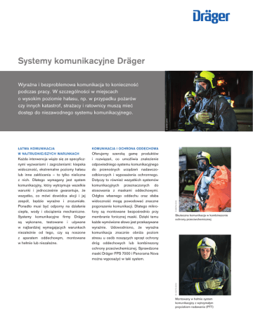 Systemy komunikacyjne Dräger KOMUNIKACJA I OCHRONA ODDECHOWA W NAJTRUDNIEJSZYCH WARUNKACH Oferujemy szeroką gamę produktów i rozwiązań, co umożliwia znalezienie odpowiedniego systemu komunikacyjnego do przenośnych urządzeń nadawczoodbiorczych i wyposażenia ochronnego. Dotyczy to również wszystkich systemów komunikacyjnych przeznaczonych do stosowania z maskami oddechowymi. Odgłos własnego oddechu oraz słaba widoczność mogą powodować znaczne pogorszenie komunikacji. Dlatego mikrofony są montowane bezpośrednio przy membranie fonicznej maski. Dzięki temu każde wymówione słowo jest przekazywane wyraźnie. Udowodniono, że wyraźna komunikacja znacznie obniża poziom stresu u osób noszących sprzęt ochrony dróg oddechowych lub kombinezony ochrony przeciwchemicznej. Sprawdzone maski Dräger FPS 7000 i Panorama Nova można wyposażyć w taki system. Każda interwencja wiąże się ze specyficznymi wyzwaniami i zagrożeniami: kiepska widoczność, ekstremalne poziomy hałasu lub inne zakłócenia – to tylko nieliczne z nich. Dlatego wymagany jest system komunikacyjny, który wytrzymuje wszelkie warunki i jednocześnie gwarantuje, że wszystko, co mówi dowódca akcji i jej zespół, będzie wyraźne i zrozumiałe. Ponadto musi być odporny na działanie ciepła, wody i obciążenia mechaniczne. Systemy komunikacyjne firmy Dräger są wykonane, testowane i używane w najbardziej wymagających warunkach niezależnie od tego, czy są noszone z aparatem oddechowym, montowane w hełmie lub niezależne. Skuteczna komunikacja w kombinezonie ochrony przeciwchemicznej D-12273-2014 ŁATWA KOMUNIKACJA D-8979-2014 D-8418-2014 Wyraźna i bezproblemowa komunikacja to konieczność podczas pracy. W szczególności w miejscach o wysokim poziomie hałasu, np. w przypadku pożarów czy innych katastrof, strażacy i ratownicy muszą mieć dostęp do niezawodnego systemu komunikacyjnego. Montowany w hełmie system komunikacyjny z wytrzymałym przyciskiem nadawania (PTT) 02 | SYSTEMY KOMUNIKACYJNE DRÄGER SYSTEMY KOMUNIKACYJNE DLA STRAŻY POŻARNEJ Systemy komunikacyjne firmy Dräger montowane w hełmach mogą być stosowane uniwersalnie z wieloma rodzajami wyposażenia ochrony głowy. Kombinacja zaawansowanych głośników i różnych modeli mikrofonów podczas mówienia i słuchania zapewnia wysokiej jakości dźwięk. Dzięki systemowi praktycznych elementów mocujących wyposażenie komunikacyjne Dräger działa idealnie z różnymi hełmami. Zastosowanie hełmów serii Dräger HPS gwarantuje optymalną stabilność, dopasowanie i komfort noszenia. System posiada dopuszczenie EN443 i pasuje do hełmów strażackich, w tym również do hełmów krótkich. UNIWERSALNE WDRAŻANIE SYSTEMÓW KOMUNIKACYJNYCH Poza specjalnymi rozwiązaniami komunikacyjnymi do hełmów i aparatów oddechowych, Dräger oferuje również zróżnicowany wybór uniwersalnych systemów komunikacyjnych. Przystawki do słuchania i mówienia oraz zdalne mikrofony z głośnikami mogą być używane niezależnie od rodzaju używanego wyposażenia ochronnego i nadają się idealnie do taktycznej koordynacji zespołu. Wszystkie systemy komunikacyjne firmy Dräger charakteryzują się elastycznymi możliwościami kombinacji, solidną konstrukcją i są przyjazne dla użytkownika. Zdalny mikrofon z głośnikiem C-C550 można obsługiwać nawet bez zestawu słuchawek z mikrofonem. Przyciski PTT (Push-To-Talk) są łatwo dostępne, solidne i można je dobrze obsługiwać z założonymi rękawicami. Systemy komunikacyjne zintegrowane z maską WŁAŚCIWOŚCI TECHNICZNE DRÄGER FPS-COM-PLUS Jednostka komunikacyjna do maski pełnotwarzowej Dräger FPS 7000. Lepsza jakość głosu przez zintegrowany w masce mikrofon i cyfrową redukcję odgłosu oddechu. Dwa wzmacniacze głosu i połączenie z wieloma różnymi radiotelefonami (bezpośrednie lub pośrednie). Zależnie od wariantu 250 – 320 g Dopuszczenie EN 136 klasa 3, EN 137 typ 2, Ex ia llC Ga Klasa ochrony IP67 Kabel kabel przyłączeniowy zależy od modelu radia D-10572-2011 Waga Dräger FPS-COM-PLUS WŁAŚCIWOŚCI TECHNICZNE DRÄGER MS-COM D-9690-2014 Podłączany do maski pełnotwarzowej Dräger Panorama Nova. Ustawienie mikrofonu obok membrany głosowej zapewnia transmisję głosu wysokiej jakości. Dräger MS-COM Waga 84 g Rozmiar 78 × 37 × 16 mm Mikrofon Przewodzenie powietrzne, elektret Dopuszczenie EN 136 klasa 3, EN 137 typ 2, Ex ib llC T4 Klasa ochrony IP56 Kabel PUR, ogniotrwały: Ø 4 mm / 270 mm, spiralny PUR, stabilność w wysokiej temperaturze: Ø 4 mm / 900 mm, prosty Systemy komunikacyjne montowane w hełmie WŁAŚCIWOŚCI TECHNICZNE DRÄGER HC-1/HC-2 COM D-9681-2014 & ST-4672-2003 System komunikacyjny łatwy do montażu w hełmie strażackim, w tym również hełmie krótkim. Obejmuje czuły mikrofon kostny do filtrowania dźwięków otoczenia i dostępny jest z jednym lub dwoma głośnikami. Dostępne wersje ATEX. Waga: 85 g Rozmiar: 160 × 40 × 12 mm (HC-1 Compact) Mikrofon: wrażliwy na wibracje Kabel: HC-1: PUR, odporny na płomienie: Ø 4 mm / 380 mm, spiralny HC-2: PUR: sprawdzony pod kątem rozgorzenia ognia: Ø 4 mm / 750 mm, prosty Dräger HC-1/HC-2 COM WŁAŚCIWOŚCI TECHNICZNE DRÄGER HC-E COM Czuły mikrofon elektretowy zintegrowany z głośnikiem. Idealny do hełmów strażackich, w tym również hełmów krótkich. Możliwość łatwego montażu wewnątrz hełmu. Dostępne wersje ATEX. 70 g Rozmiar 110 × 40 × 12 mm Mikrofon Elektret, przewodzenie powietrzne Kabel PUR, ogniotrwały: Ø 4 mm / 380 mm, spiralny PUR, stabilność w wysokiej temperaturze: Ø 4 mm / 750 mm, prosty ST-544-2004 Waga Dräger HC-E COM WŁAŚCIWOŚCI TECHNICZNE DRÄGER MP-H COM ST-346-2004 Jednostka hełmowa z mikrofonem pałąkowym. Łatwy montaż w hełmie przy użyciu różnych adapterów. Zaprojektowany do montowania w kaskach integralnych, zamkniętych. Dostępne wersje ATEX. Dräger MP-H COM Waga 80 g Rozmiar 175 × 70 × 12 mm Mikrofon Elektret, przewod