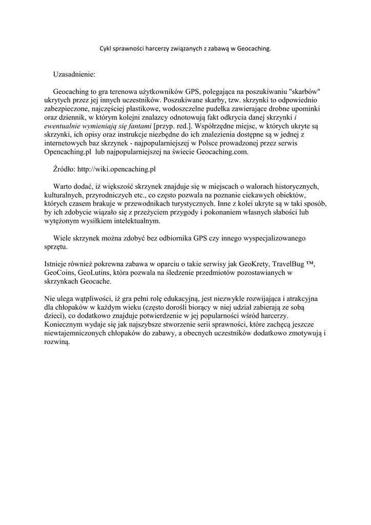 Cykl sprawności harcerzy związanych z zabawą w Geocaching. Uzasadnienie: Geocaching to gra terenowa użytkowników GPS, polegająca na poszukiwaniu "skarbów" ukrytych przez jej innych uczestników. Poszukiwane skarby, tzw. skrzynki to odpowiednio zabezpieczone, najczęściej plastikowe, wodoszczelne pudełka zawierające drobne upominki oraz dziennik, w którym kolejni znalazcy odnotowują fakt odkrycia danej skrzynki i ewentualnie wymieniają się fantami [przyp. red.]. Współrzędne miejsc, w których ukryte są skrzynki, ich opisy oraz instrukcje niezbędne do ich znalezienia dostępne są w jednej z internetowych baz skrzynek - najpopularniejszej w Polsce prowadzonej przez serwis Opencaching.pl lub najpopularniejszej na świecie Geocaching.com. Źródło: http://wiki.opencaching.pl Warto dodać, iż większość skrzynek znajduje się w miejscach o walorach historycznych, kulturalnych, przyrodniczych etc., co często pozwala na poznanie ciekawych obiektów, których czasem brakuje w przewodnikach turystycznych. Inne z kolei ukryte są w taki sposób, by ich zdobycie wiązało się z przeżyciem przygody i pokonaniem własnych słabości lub wytężonym wysiłkiem intelektualnym. Wiele skrzynek można zdobyć bez odbiornika GPS czy innego wyspecjalizowanego sprzętu. Istnieje również pokrewna zabawa w oparciu o takie serwisy jak GeoKrety, TravelBug ™, GeoCoins, GeoLutins, która pozwala na śledzenie przedmiotów pozostawianych w skrzynkach Geocache. Nie ulega wątpliwości, iż gra pełni rolę edukacyjną, jest niezwykle rozwijająca i atrakcyjna dla chłopaków w każdym wieku (często dorośli biorący w niej udział zabierają ze sobą dzieci), co dodatkowo znajduje potwierdzenie w jej popularności wśród harcerzy. Koniecznym wydaje się jak najszybsze stworzenie serii sprawności, które zachęcą jeszcze niewtajemniczonych chłopaków do zabawy, a obecnych uczestników dodatkowo zmotywują i rozwiną. Cykl sprawności najlepiej wpisywałby się w dział: Sprawności terenowe Sprawność jednogwiazdkowa: Początkujący Geocacher * Propozycje wymagań: • Uzyska zgodę rodziców/ opiekunów na udział w zabawie. • Założy konto w dowolnym serwisie z bazą skrzynek. • Zdobędzie 15 skrzynek (w tym min. 10 tradycyjnych, 1 quiz) • Zdobędzie i przeniesie do innej skrzynki 2 Geokrety. Sprawność dwugwiazdkowa: Geocacher ** Propozycja wymagań: • Zdobędzie 40 skrzynek, w tym przynajmniej 10 spoza zamieszkiwanej miejscowości (z czego 20 to tradycyjne, 2 quizy, 1 mobilną) • Założy 3 ciekawe skrzynki, uwzględniając przy tym kodeks geocachera, regulamin serwisu oraz zabawowe tradycje. • Zdobędzie i przeniesie do innej skrzynki 5 Geokretów. • Skompletuje ABC geocachera (łopatka, kujka, rękawiczki, kompas, latarka, odbiornik GPS) • Skompletuje zestaw naprawczy (torby foliowe, woreczki strunowe, zapasowe dzienniki, ołówek, temperówka). • Dokona serwisu 3 zaniedbanych skrzynek. Sprawność trzygwiazdkowa: Doświadczony Geocacher *** Propozycje wymagań: • Zdobędzie 70 skrzynek, w tym przynajmniej 25 spoza zamieszkiwanej miejscowości (z czego 36 to tradycyjne, 5 quizów, 2 mobilne, 1 multicache) • Założy 10 skrzynek, uwzględniając przy tym kodeks geocachera, regulamin serwisu oraz zabawowe tradycje. • Założy oryginalną skrzynkę, np. quiz, mobliną, multicache, własnego pomysłu. • Weźmie udział w dwóch spotkaniach geocacherów. • Stworzy własnego Geokreta. • Jest GK człowiekiem i zapisuje swoją aktywność w GeoBlogu • zagrał/stworzył w GPS grę Sprawność mistrzowska: Organizator Geocachingu M Propozycje wymagań: • Zdobędzie 120 skrzynek, w tym przynajmniej 50 spoza zamieszkiwanej miejscowości oraz 5 zza granicy (z czego 51 to tradycyjne, 10 quizów, 5 mobilnych, 4 multicache) • Założy 20 skrzynek, uwzględniając przy tym kodeks geocachera, regulamin serwisu oraz zabawowe tradycje. • Założy 5 oryginalnych skrzynek, np. quiz, mobliną, hotel geokretów, multicache, własnego pomysłu. • Zorganizuje spotkanie geocacherów. • Stworzy 5 Geokretów (w tym min. 2 typu Książka/CD/DVD)