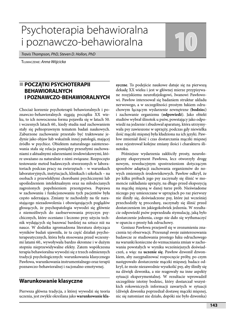 Psychoterapia behawioralna i poznawczo-behawioralna Travis Thompson, PhD, Steven D. Hollon, PhD 10 TŁUMACZENIE: Anna Wójcicka POCZĄTKI PSYCHOTERAPII BEHAWIORALNYCH I POZNAWCZO-BEHAWIORALNYCH Chociaż korzenie psychoterapii behawioralnych i poznawczo-behawioralnych sięgają początku XX wieku, to ich nowoczesna forma pojawiła się w latach 50. i wczesnych latach 60., kiedy studia nad zachowaniem stały się pełnoprawnym tematem badań naukowych. Zaburzone zachowanie przestało być traktowane jedynie jako objaw lub wskaźnik innej patologii, mającej źródło w psychice. Obiektem naturalnego zainteresowania stała się relacja pomiędzy przeszłymi zachowaniami z aktualnymi zdarzeniami środowiskowymi, które uważano za naturalnie z nimi związane. Rozpoczęto testowanie metod badawczych stworzonych w laboratoriach podczas pracy na zwierzętach – w warunkach laboratoryjnych, instytucjach, klinikach i szkołach – na osobach z przewlekłymi chorobami psychicznymi lub upośledzeniem intelektualnym oraz na młodocianych zagrożonych popełnieniem przestępstwa. Poprawa w zachowaniu i funkcjonowaniu tych pacjentów była często uderzająca. Zmiany te zachodziły na tle narastającego niezadowolenia i obowiązujących poglądów głoszących, że psychopatologia wywodzi się głównie z niemożliwych do zaobserwowania przyczyn psychicznych, które oceniano i leczono przy użyciu technik wydających się bazować bardziej na sztuce niż na nauce. W dodatku zgromadzona literatura dotycząca wyników badań ujawniła, że ta część działań psychoterapeutycznych, która była stosowana przed wczesnymi latami 60., wywoływała bardzo skromne i w dużym stopniu nieprzewidywalne efekty. Zatem współczesna terapia behawioralna wywodzi się z trzech odmiennych tradycji psychologicznych: warunkowania klasycznego Pawłowa, warunkowania instrumentalnego oraz terapii poznawczo-behawioralnej i racjonalno-emotywnej. Warunkowanie klasyczne Pierwsza główna tradycja, z której wywodzi się teoria uczenia, jest zwykle określana jako warunkowanie kla- syczne. To podejście naukowe datuje się na pierwszą dekadę XX wieku i jest w głównej mierze przypisywane rosyjskiemu neurofizjologowi, Iwanowi Pawłowowi. Pawłow interesował się badaniem struktur układu nerwowego, a w szczególności prostym łukiem odruchowym łączącym wydarzenie zewnętrzne (bodziec) i zachowanie organizmu (odpowiedź). Jako obiekt studiów wybrał ślinotok u psów, powstający jako odpowiedź na jedzenie i zbudował aparaturę, która utrzymywała psy zawieszone w uprzęży, podczas gdy niewielka ilość mączki mięsnej była kładziona na ich języki. Pawłow zmieniał ilość i czas dostarczania mączki mięsnej oraz rejestrował kolejne zmiany ilości i charakteru ślinotoku. Późniejsze wydarzenia zakłóciły prosty, neurologiczny eksperyment Pawłowa, lecz otworzyły drogę nowym, rewolucyjnym spostrzeżeniom dotyczącym sposobów adaptacji zachowania organizmów do nowych zmiennych środowiskowych. Pawłow odkrył, że po kilku próbach jego psy zaczynały się ślinić w momencie zakładania uprzęży, na długo przed ekspozycją na mączkę mięsną w danej turze prób. Nieświadome niczego psy umieszczane w uprzężach po raz pierwszy nie śliniły się, doświadczone psy, które już wcześniej przechodziły tę procedurę, zaczynały się ślinić przed dostarczeniem im jakiegokolwiek jedzenia. W rezultacie odpowiedź psów poprzedzała stymulację, jaką było dostarczenie jedzenia, czego nie dało się wytłumaczyć w oparciu o prosty łuk odruchowy. Geniusz Pawłowa przejawił się w zrozumieniu znaczenia tej obserwacji. Przesunął swoje zainteresowania badawcze ze studiowania prostego łuku odruchowego na warunki konieczne do wzmacniania zmian w zachowaniu powstałych w wyniku wcześniejszych doświadczeń, a więc na uczenie się. Pawłow dzwonił dzwonkiem, aby zasygnalizować rozpoczęcie próby, po czym następowało dostarczenie mączki mięsnej; badacz odkrył, że może niezawodnie wyszkolić psy, aby śliniły się na dźwięk dzwonka, a nie reagowały na inne aspekty sytuacji eksperymentalnej. W rezultacie wprowadził szczególnie istotny bodziec, który dostarczał wszystkich rokowniczych informacji zawartych w sytuacji (dźwięk dzwonka poprzedzał dostawę mączki mięsnej, nic się natomiast nie działo, dopóki nie było dzwonka) 143 144 Część I • Zasady postępowania w psychiatrii i psy zaczynały się ślinić tylko po dźwięku dzwonka. Od momentu, gdy dzwonek został uznany za szczególny bodziec informacyjny, Pawłow mógł okazjonalnie pominąć podanie mączki mięsnej po sygnale dzwonka w kolejnej turze, a psy nadal śliniły się na ten dźwięk. Oto prosty paradygmat zawierający kluczowe elementy warunkowania klasycznego. Mączka mięsna reprezentuje to co Pawłow nazwał bodźcem bezwarunkowym. Wszystkie psy ze sprawnym układem nerwowym śliniły się, gdy mączka mięsna była kładziona na ich języki, niezależnie od tego, czy miały wcześniej doświadczenia z takim bodźcem, czy nie. Ślinotok reprezentuje odpowiedź bezwarunkową. Dzwonek (a wcześniej cała aparatura eksperymentalna) to bodziec warunkowy. Wyjściowo psy nie śliniły się na dźwięk dzwonka, ale zaczęły to robić, gdy dźwięk ten został skojarzony z mączką mięsną (bodźcem bezwarunkowym). Ślinotok w odpowiedzi jedynie na dźwięk dzwonka reprezentuje odpowiedź warunkową, tj. wyuczoną odpowiedź na początkowo obojętny bodziec, która nie występuje powszechnie wśród osobników danego gatunku. Wczesne demonstracje na ludziach J.B. Watson, jedna z głównych postaci psychologii amerykańskiej, odkrył potencjalne znaczenie warunkowania klasycznego w wyjaśnieniu powstawania objawów psychopatologicznych. Watson i absolwent uniwersytetu przeprowadzili demonstrację, w jaki sposób stworzone przez Pawłowa reguły warunkowania klasycznego mogą być rozciągnięte na ludzi. W ba