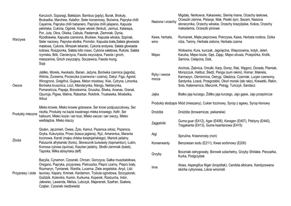 Warzywa Owoce Karczoch, Szparagi, Bakłażan, Bambus (pędy), Burak, Brokuły, Brukselka, Marchew, Kalafior, Seler korzeniowy, Boćwina, Papryka chilli Cayenne, Papryka chilli habanero, Papryka chilli jalapeno, Kapusta pekińska, Cukinia, Ogórek, Koper włoski (fenkuł), Jarmuż, Kalarepa, Por, Juta, Okra, Oliwka, Cebula, Pasternak, Ziemniak, Dynia, Rzodkiewka, Kapusta czerwona, Brukiew, Kapusta włoska, Szpinak, Seler naciowy, Papryka słodka, Pomidor, Kapusta biała,Sałata głowiasta masłowa, Cykoria, Mniszek lekarski, Cykoria endywia, Sałata głowiasta lodowa, Roszponka, Sałata lollo rosso, Cykoria sałatowa, Rukola, Sałata rzymska, Bób, Ciecierzyca, Fasola zwyczajna, Fasola i groch, mieszanina, Groch zwyczajny, Soczewica, Fasola mung, Soja Jabłko, Morela, Awokado, Banan, Jeżyna, Borówka czernica (jagoda), Wiśnia, Żurawina, Porzeczka (czerwona i czarna), Dakyl, Figa, Agrest, Winogrono, Grejpfrut, Gujawa, Melon miodowy, Kiwi, Cytryna, Limonka, Borówka brusznica, Liczi, Mandarynka, Mango, Nektarynka, Pomarańcza, Papaja, Brzoskwinia, Gruszka, Śliwka, Ananas, Granat, Opuncja, Pigwa, Malina, Rabarbar, Rokitnik, Truskawka, Mirabelka, Arbuz Mleko krowie, Mleko krowie gotowane, Ser krowi podpuszczkowy, Ser risotta, Produkty na bazie kwaśnego mleka krowiego, Kefir, Ser Produkty mleczne halloumi, Mleko kozie i ser kozi, Mleko owcze i ser owczy, Mleko wielbłądzie, Mleko klaczy Zboża Gluten, Jęczmień, Owies, Żyto, Kamut, Pszenica orkisz, Pszenica, Gryka, Kukurydza, Proso (kasza jaglana), Ryż, Amarantus, Maranta trzcinowa, Karob (mąka chleba świętojańskiego), Maniok jadalny, Palusznik afrykański (fonio), Słonecznik bulwiasty (topinambur), Łubin, Komosa ryżowa (quinoa), Kasztan jadalny, Słodki ziemniak (batat), Tapioka, Miłka abisyńska (teff) Bazylia, Cynamon, Czosnek, Chrzan, Gorczyca, Gałka muszkatołowa, Oregano, Papryka, przyprawa, Pietruszka, Pieprz czarny, Pieprz biały, Rozmaryn, Tymianek, Wanilia, Lucerna, Ziele angielskie, Anyż, Liść Przyprawy i zioła laurowy, Kapary, Kminek, Kardamon, Trybula ogrodowa, Szczypiorek, Goździk, Kolendra, Kumin, Kurkuma, Koperek, Rzeżucha, Imbir, Jałowiec, Lawenda, Melisa, Lubczyk, Majeranek, Szafran, Szałwia, Cząber, Czosnek niedźwiedzi Migdały, Nerkowce, Kakaowiec, Siemię lniane, Orzechy laskowe, Orzeszki ziemne, Pistacje, Mak, Pestki dyni, Sezam, Nasiona Nasiona i orzechy słonecznika, Orzechy włoskie, Orzechy brazylijskie, Kokos, Orzechy makadamia, Orzeszki piniowe Kawa, herbata, wino Rumianek, Mięta pieprzowa, Pokrzywa, Kawa, Herbata rooibos, Dzika róża, Taniny, Herbata zielona, Herbata czarna Mięso Wołowina, Kura, kurczak, Jagnięcina, Wieprzowina, Indyk, Jeleń, Kaczka, Mięso kozie, Gęś, Zając, Mięso strusia, Przepiórka, Królik, Sarnina, Cielęcina, Dzik, Ryby i owoce morza Anchois, Żabnica, Omułki, Karp, Dorsz, Rak, Węgorz, Dorada, Plamiak, Morszczuk, Halibut, Śledź, Panga (sum rekini), Homar, Makrela, Karmazyn, Ośmiornica, Ostrygi, Gładzica, Czarniak, Lucjan czerwony, Sardynka, Łosoś, Przegrzebki, Okoń morski (lab raks), Krewetki, Rekin, Sola, Kałamarnica, Miecznik, Pstrąg, Tuńczyk, Sandacz Jajka Białko jaja kurzego, Żółtko jaja kurzego, Jajo gęsie, Jajo przepiórcze Produkty słodzące Miód (mieszany), Cukier trzcinowy, Syrop z agawy, Syrop klonowy Drożdże Drożdże (browarnicze, piekarskie) Zagęstniki Guma guar (E412), Agar (E406), Karagen (E407), Pektyny (E440), Tragakanta (E413), Guma ksantanowa (E415) Algi Spirulina, Krasnorosty (nori) Konserwanty Benzoesan sodu (E211), Kwas sorbinowy (E200) Grzyby Boczniak ostrygowaty, Borowik szlachetny, Grzyby Shiitake, Pieczarka, Kurka, Podgrzybek Inne Aloes, Aspergillus Niger (kropidlak), Candida albicans, Kandyzowana skórka cytrynowa, Liście winorośli